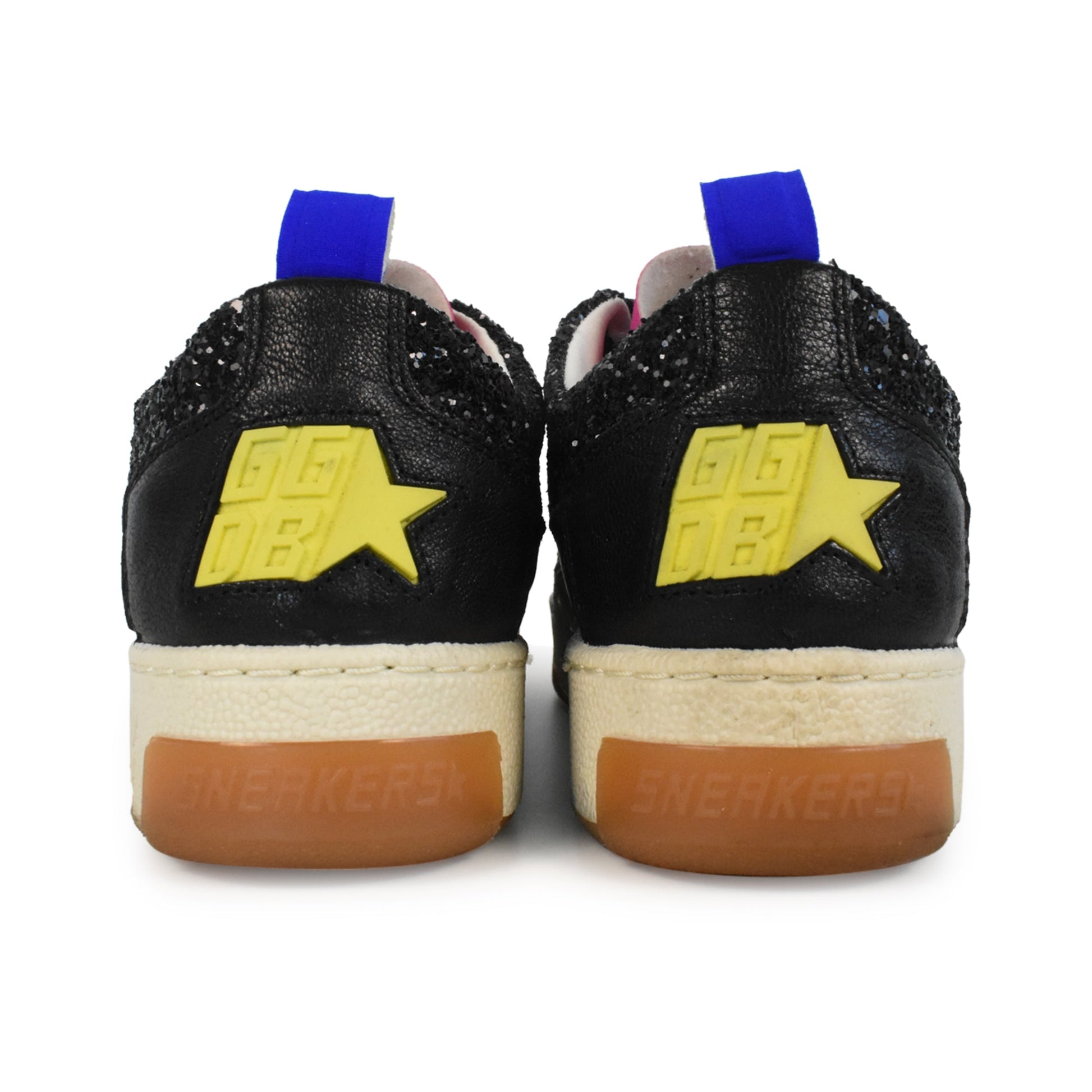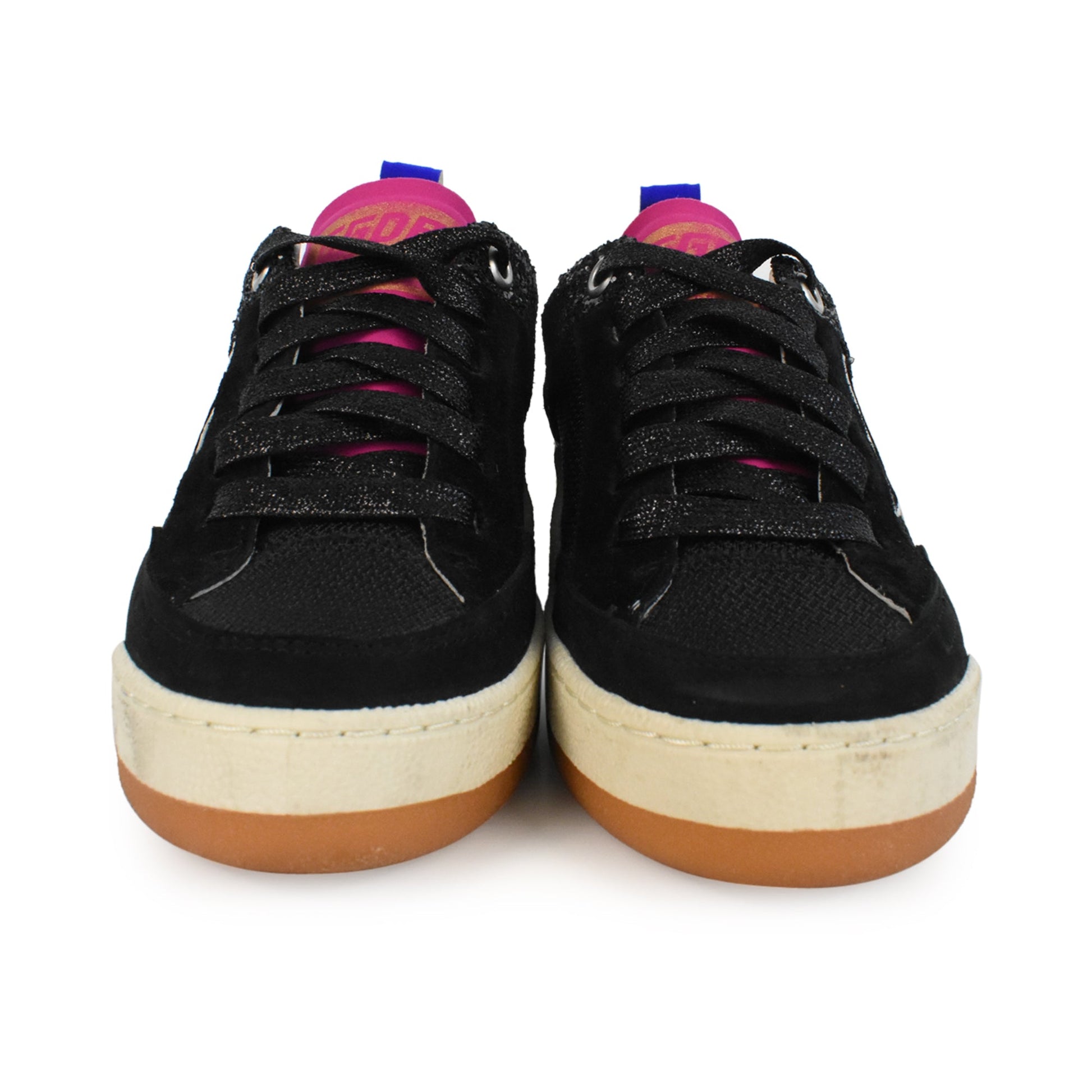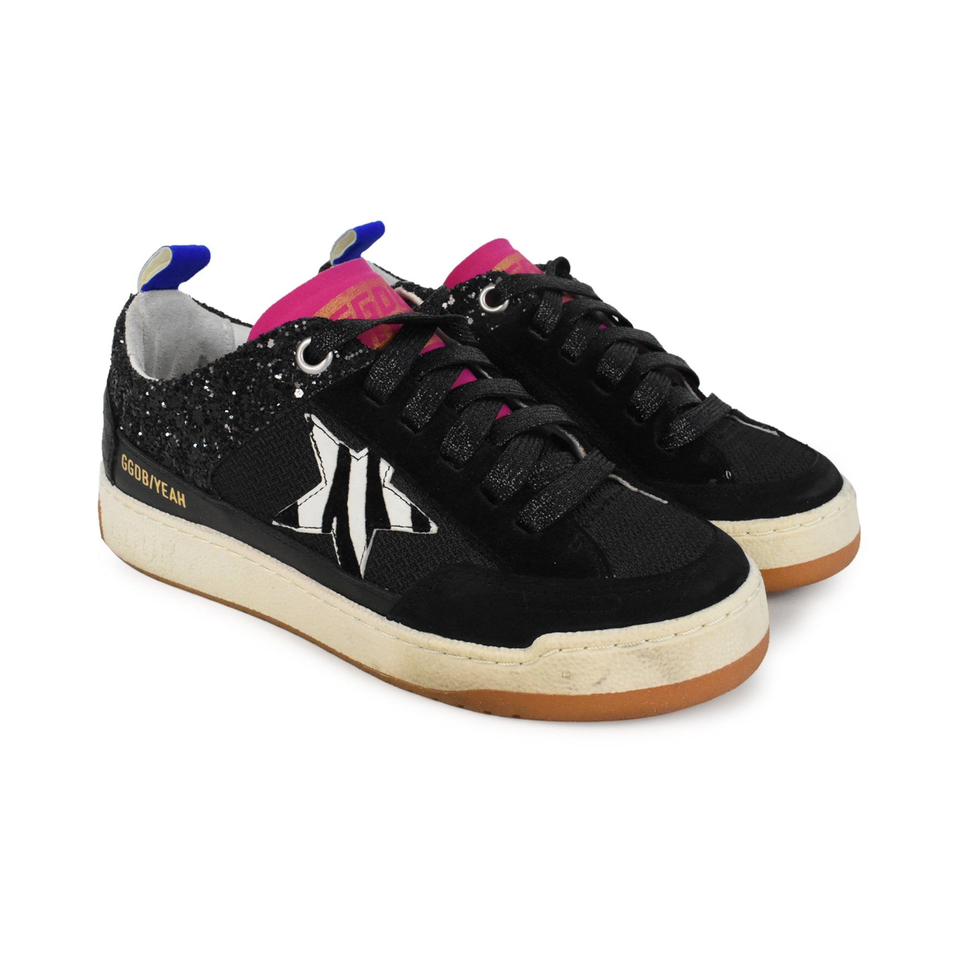Golden Goose 'Yeah' low-top sneakers in black suede and canvas. Features black glitter, black and white velvet zebra star patch, bright pink tongue, black glitter flat laces, green rubber logo on the heel, cobalt blue heel tab, and cream and brown rubber sole.