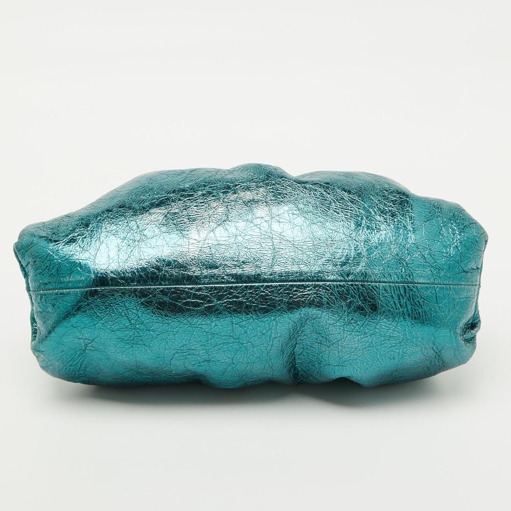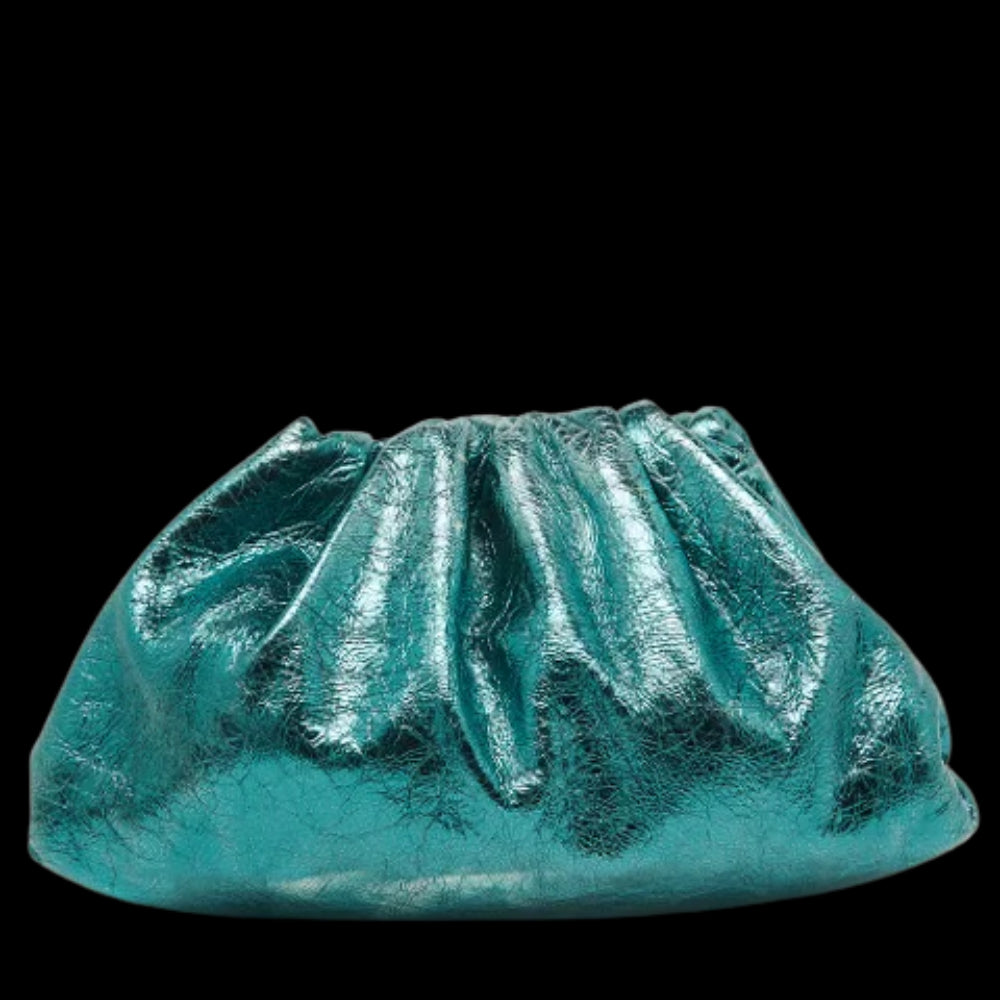 Elevate your look with this Bottega Veneta Teen Pouch in metallic green leather. Its signature soft design and bold color make it a standout accessory. - Good - In good condition with minor scuff/darkening/crease in some areas, discoloration on lining, wear on metal.