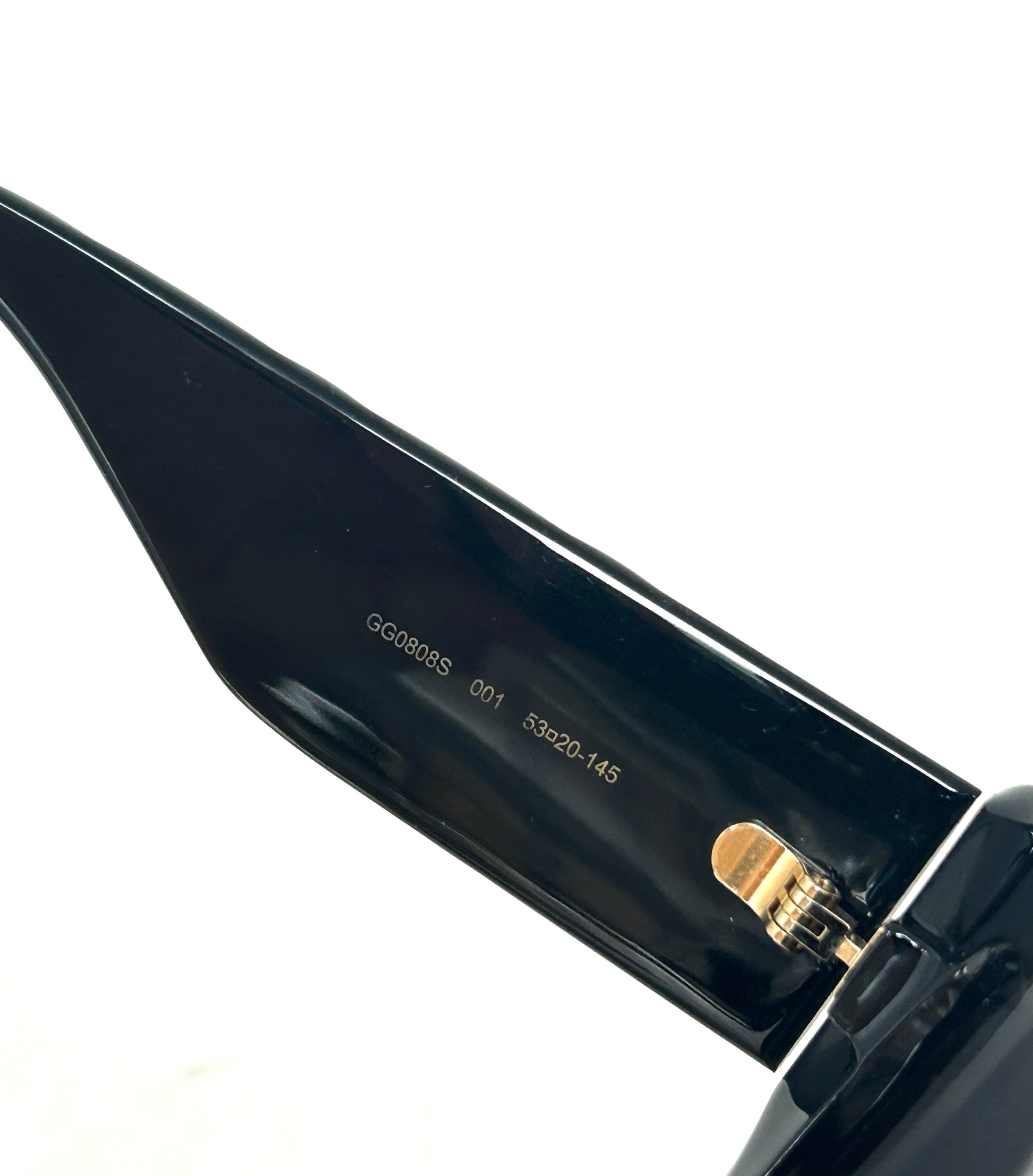 - Shiny black oversized cat eye sunglasses featuring a 60's inspired silhouette, dark grey lenses, temples are etched with textured detailing and topped with the interlocking gold tone GG logo