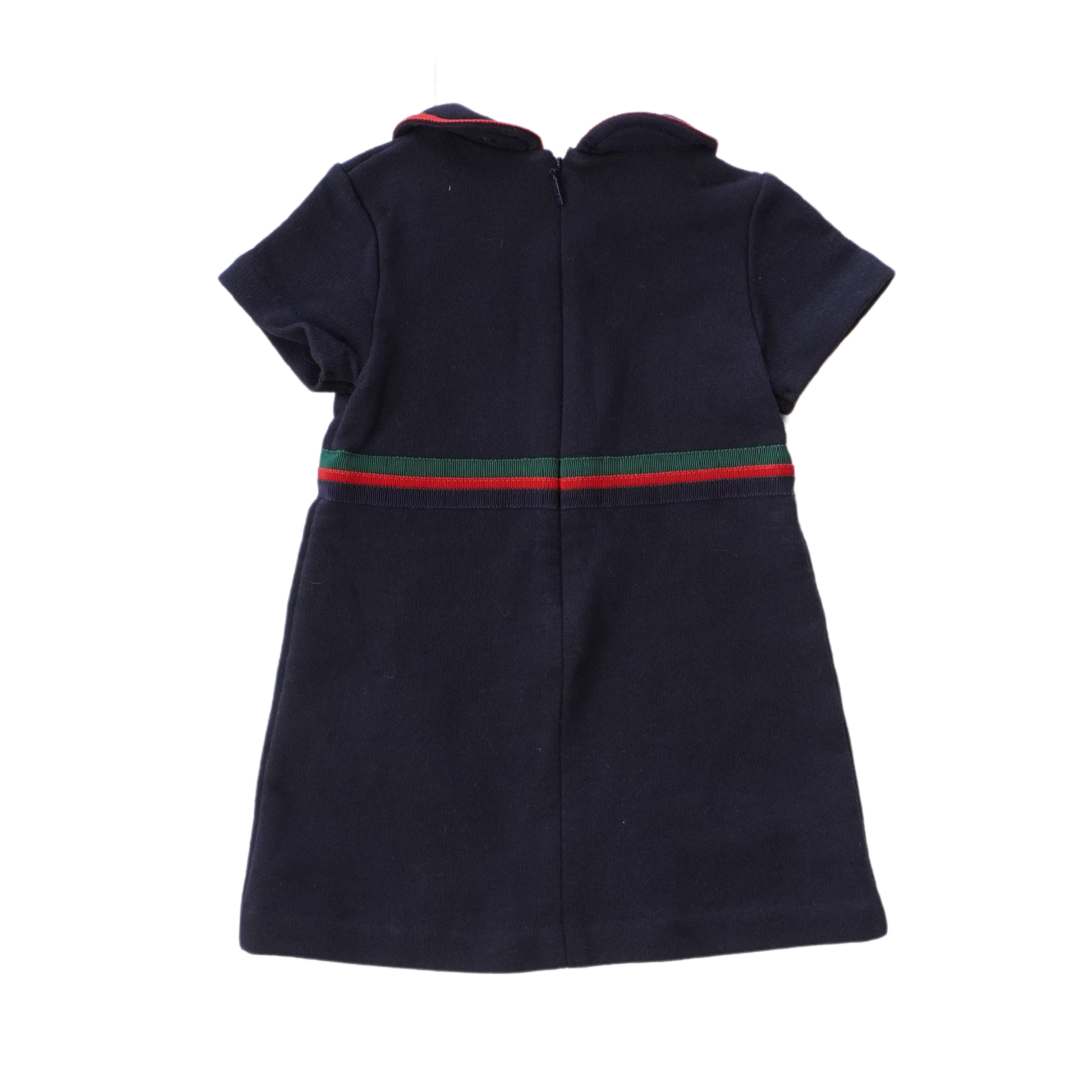 Gucci a-line dress in navy blue cotton with a red, green, and navy racing stripe around the waist, a rounded collar, and a bow detail at the chest.