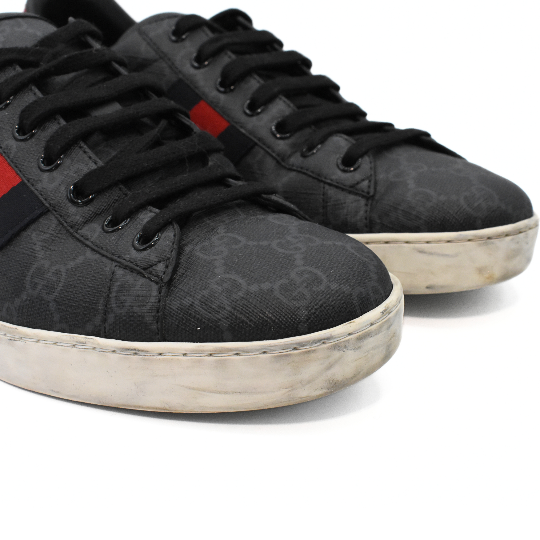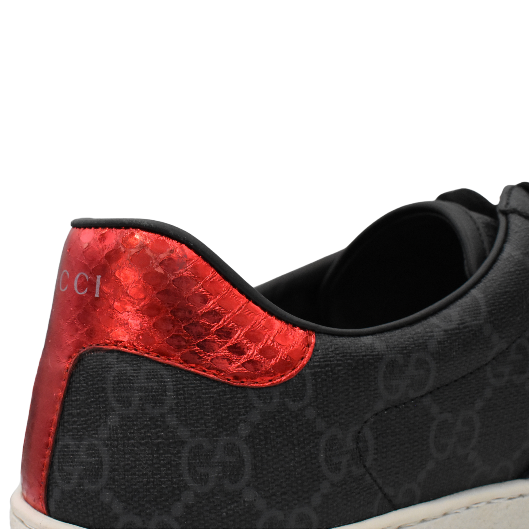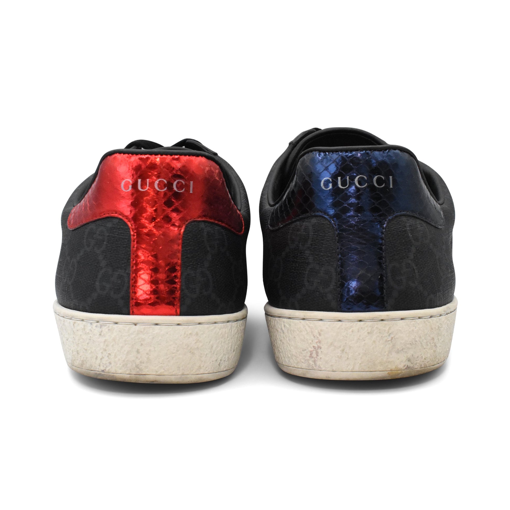 Gucci 'Ace' low-top sneakers in black and grey monogram coated canvas with white rubber soles. Features navy blue and red metallic snakeskin heel caps, black flat laces, and navy blue and red racing stripes on the sides.