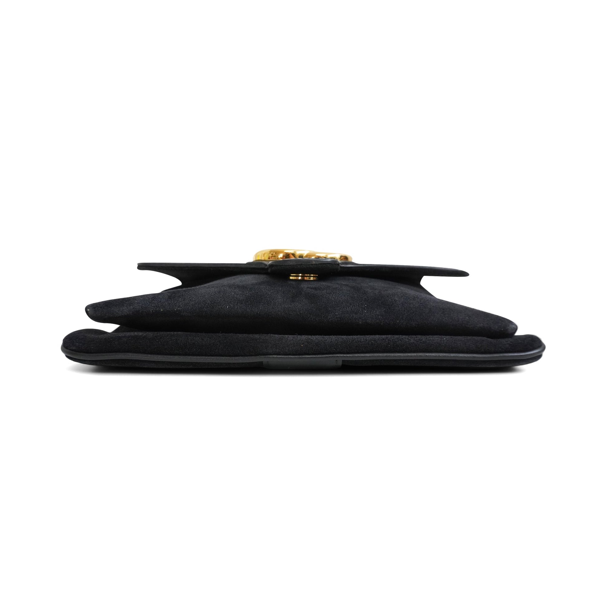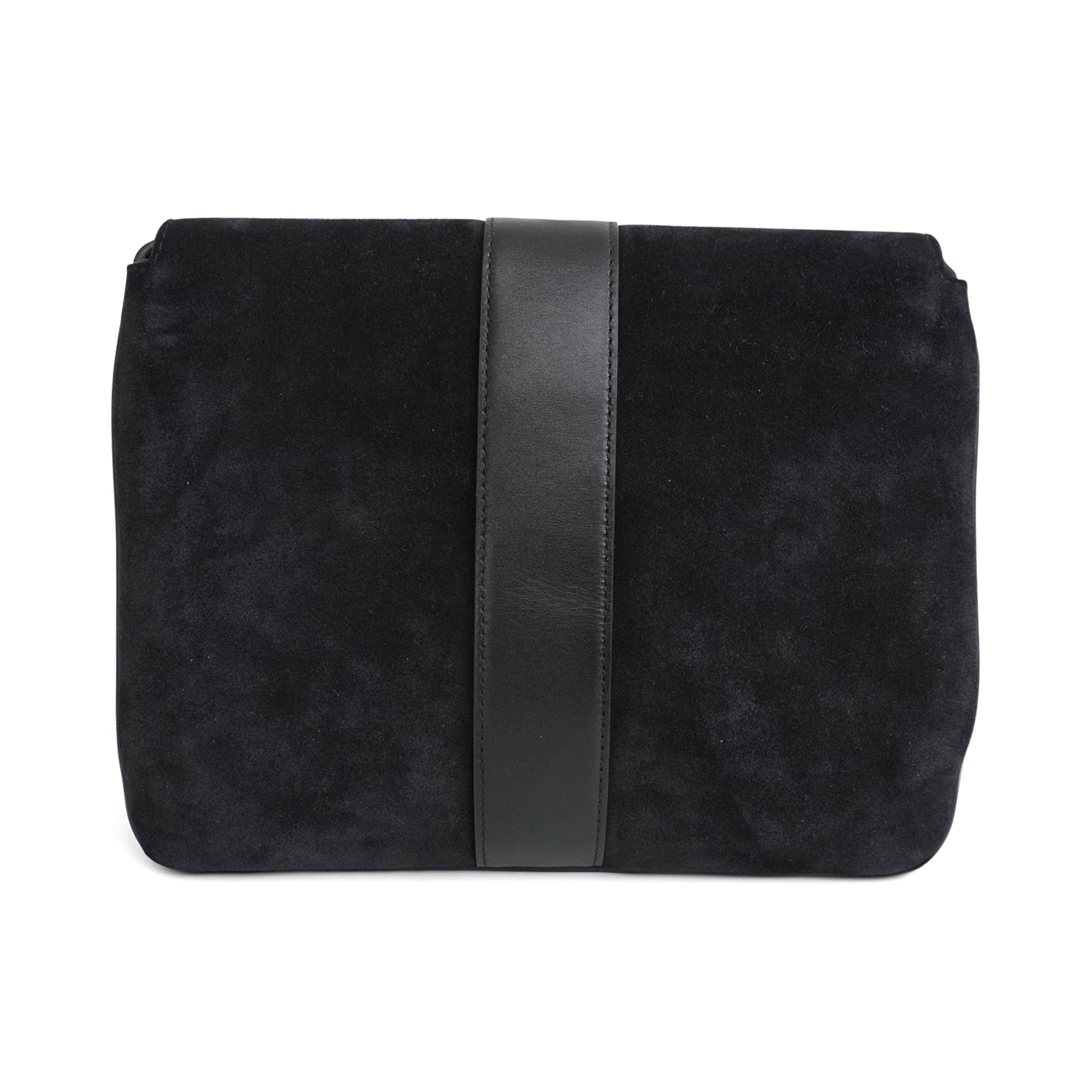 Gucci 'Arli' crossbody bag in black suede with leather accents and large gold GG Marmont hardware. Features a magnetic closure and two interior pockets with pink fabric lining.