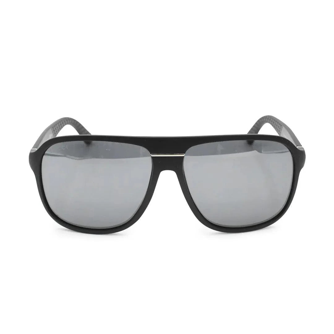 Gucci aviator style sunglasses in black plastic with silver reflective lenses, a racing stripe on the arms, and silver logo plate hardware.