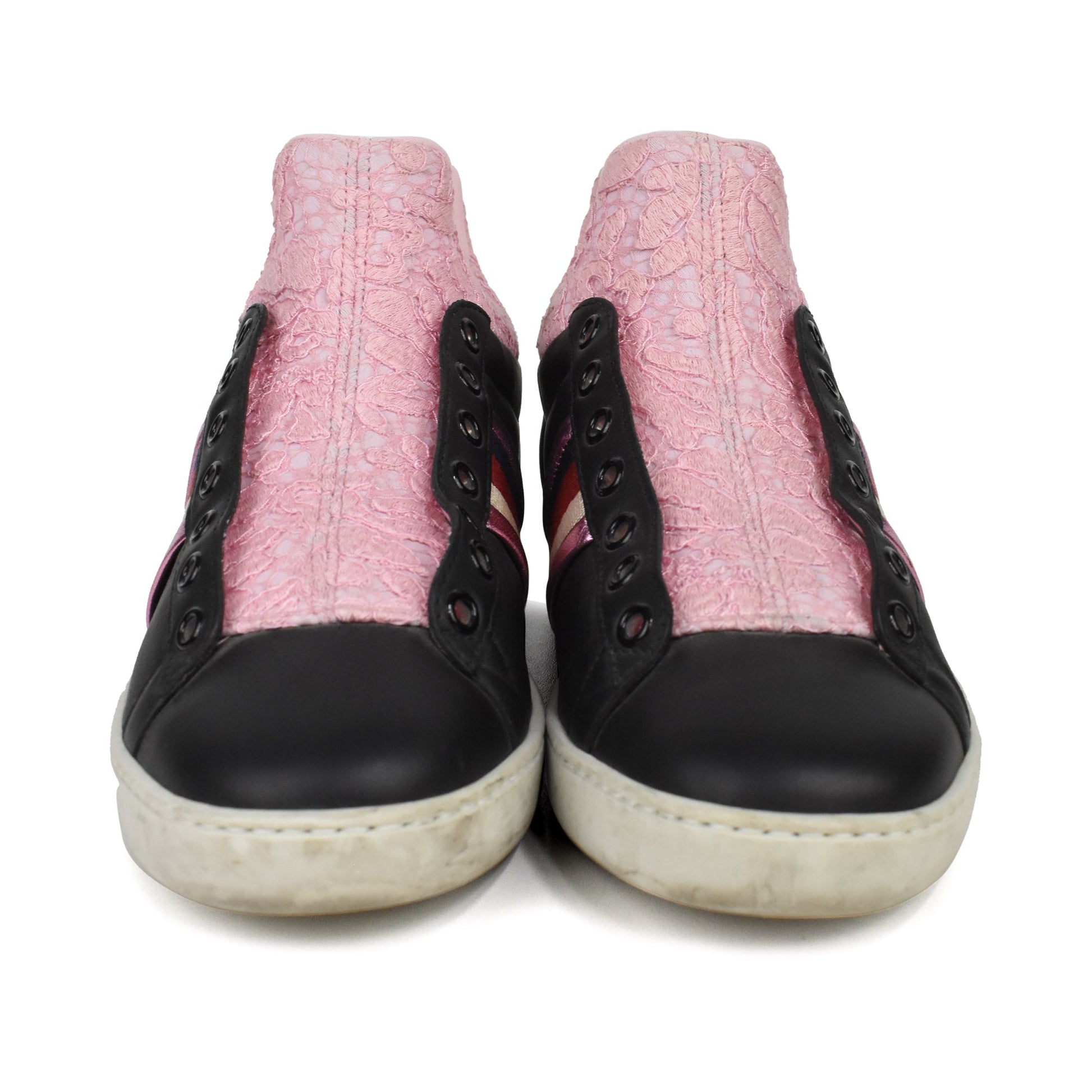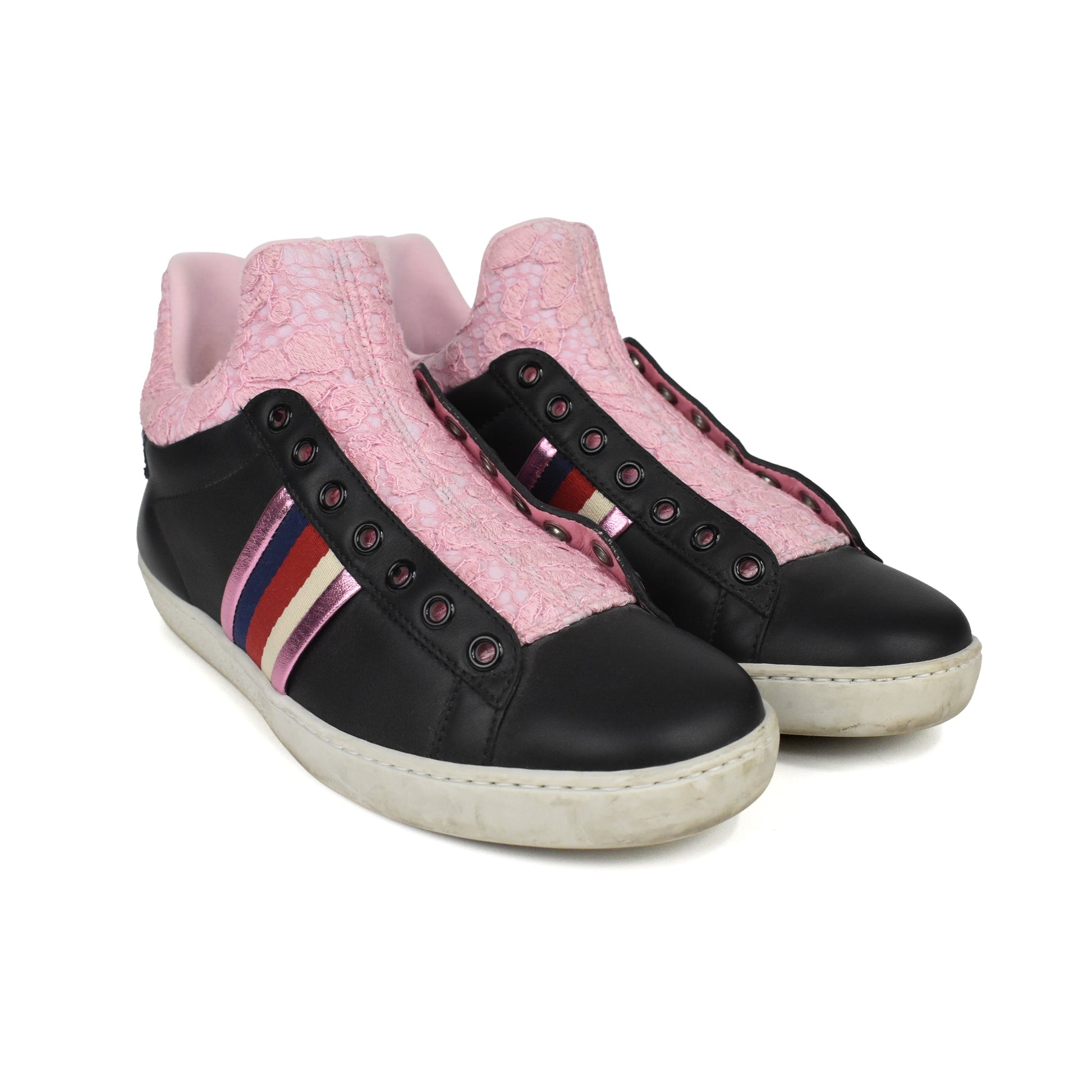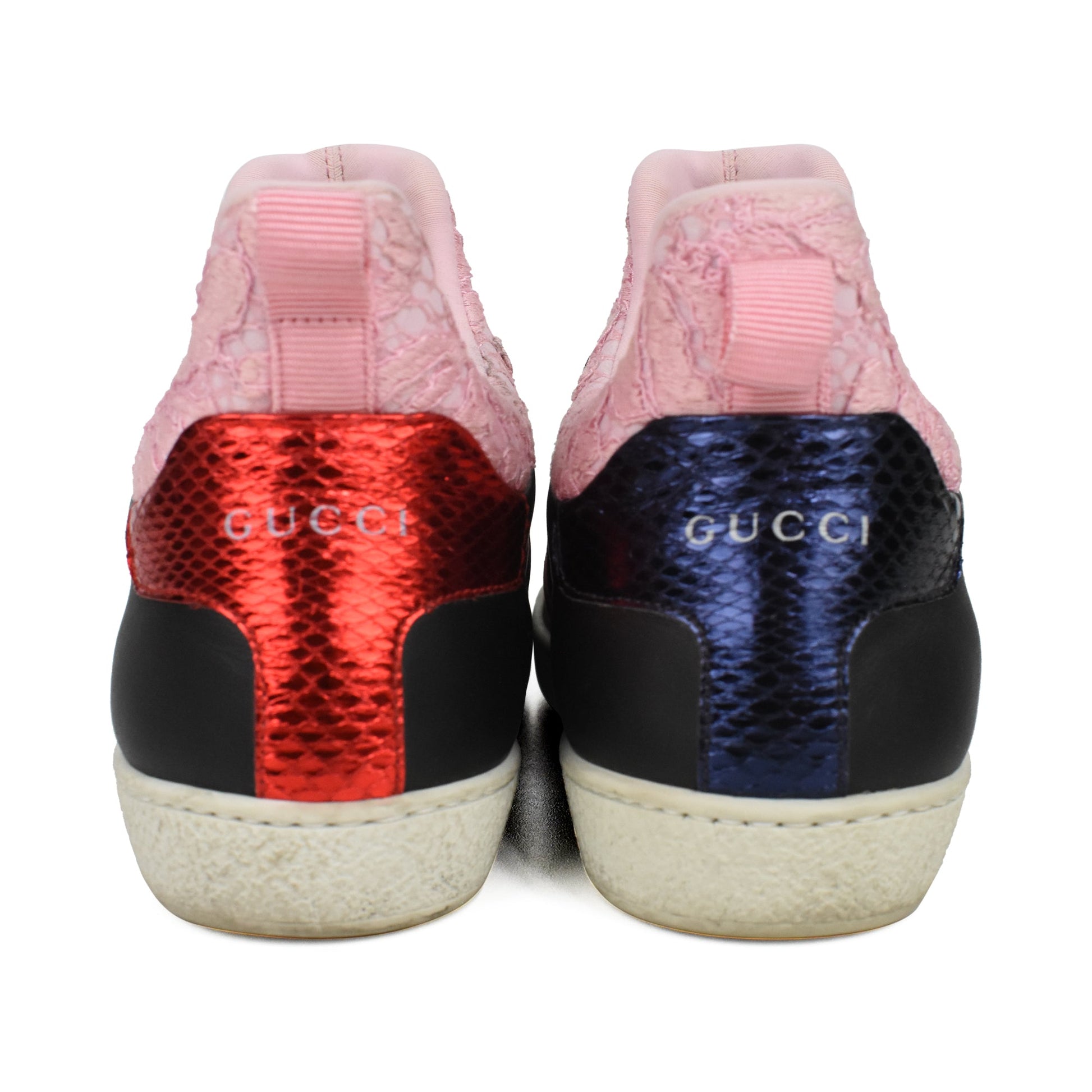 Gucci 'Ayers Sylvie Web' high-top sneakers in black leather with a pink lace top panel, blue, red, white and pink racing stripe trim on the sides, and a metallic red and blue snake-embossed leather panel on the back heel.