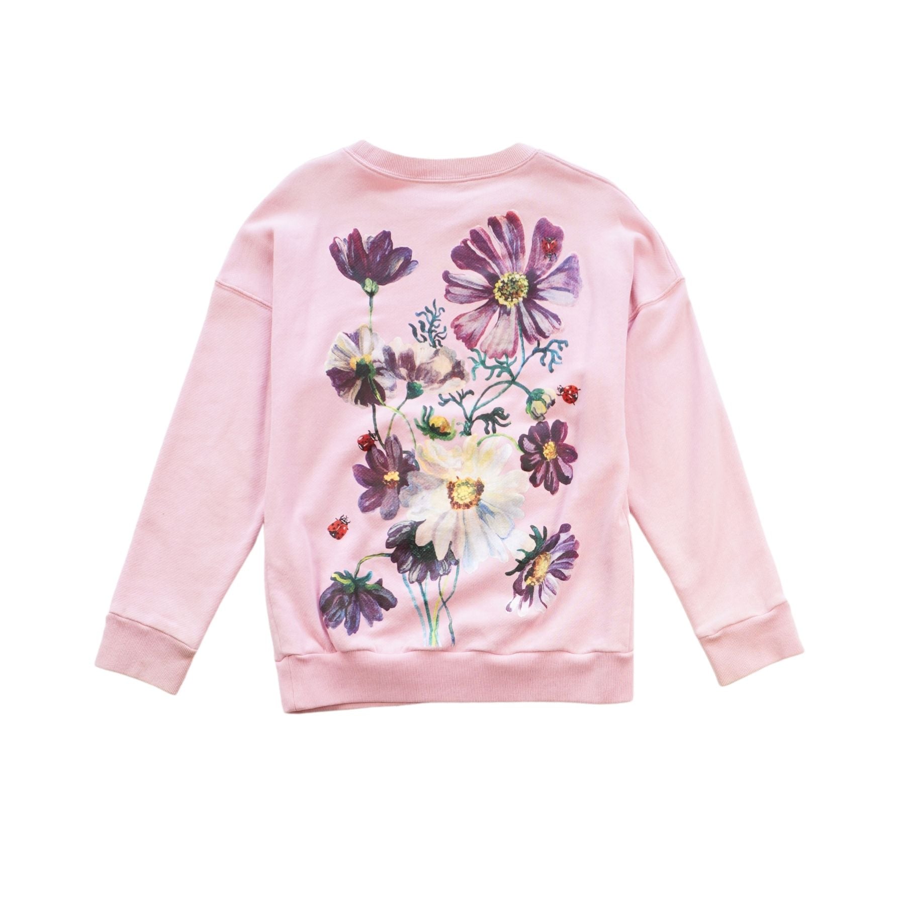 Gucci 'Bambi' crewneck sweater in pink cotton with a green logo and 'Bambi' printed graphic across the chest and large floral design on the back.