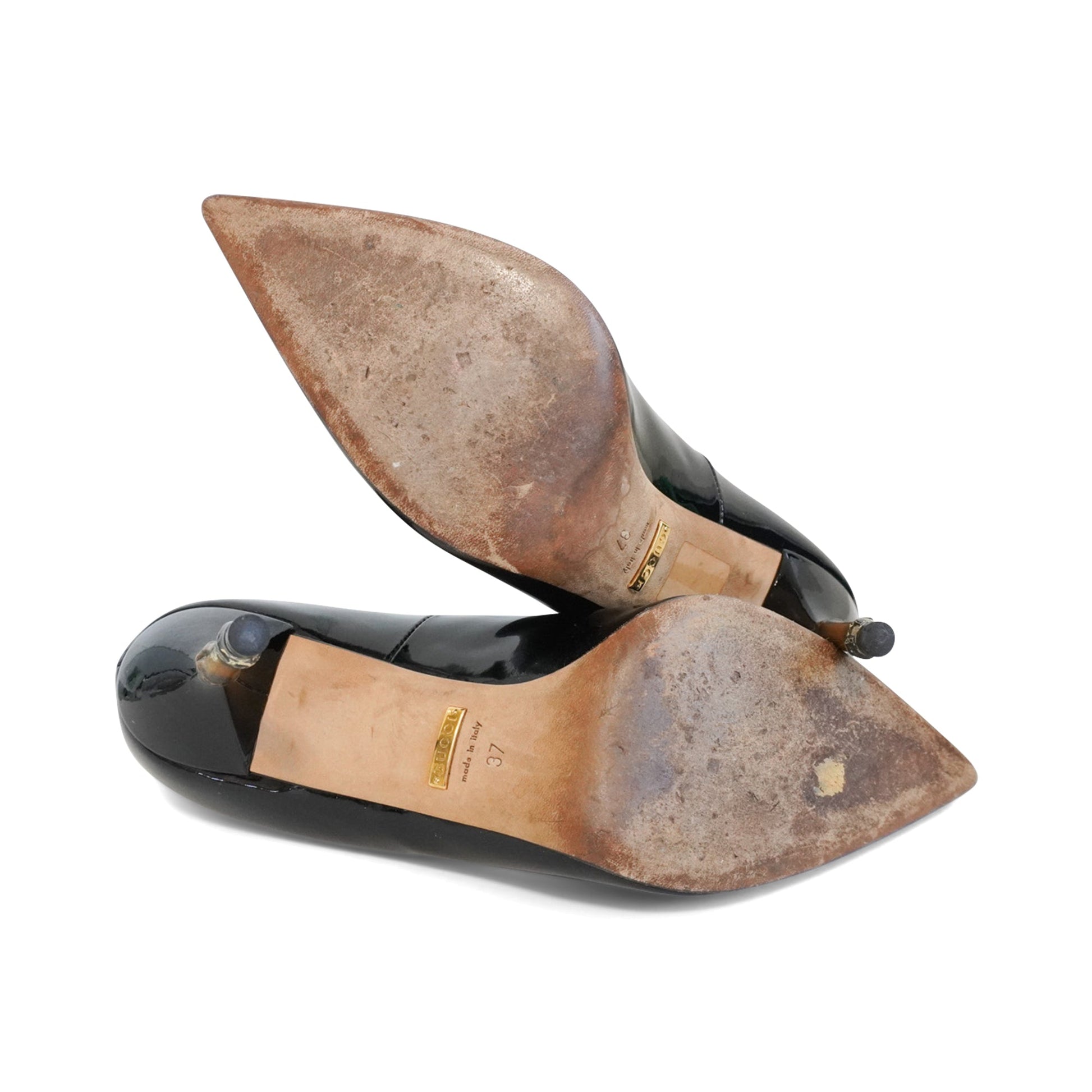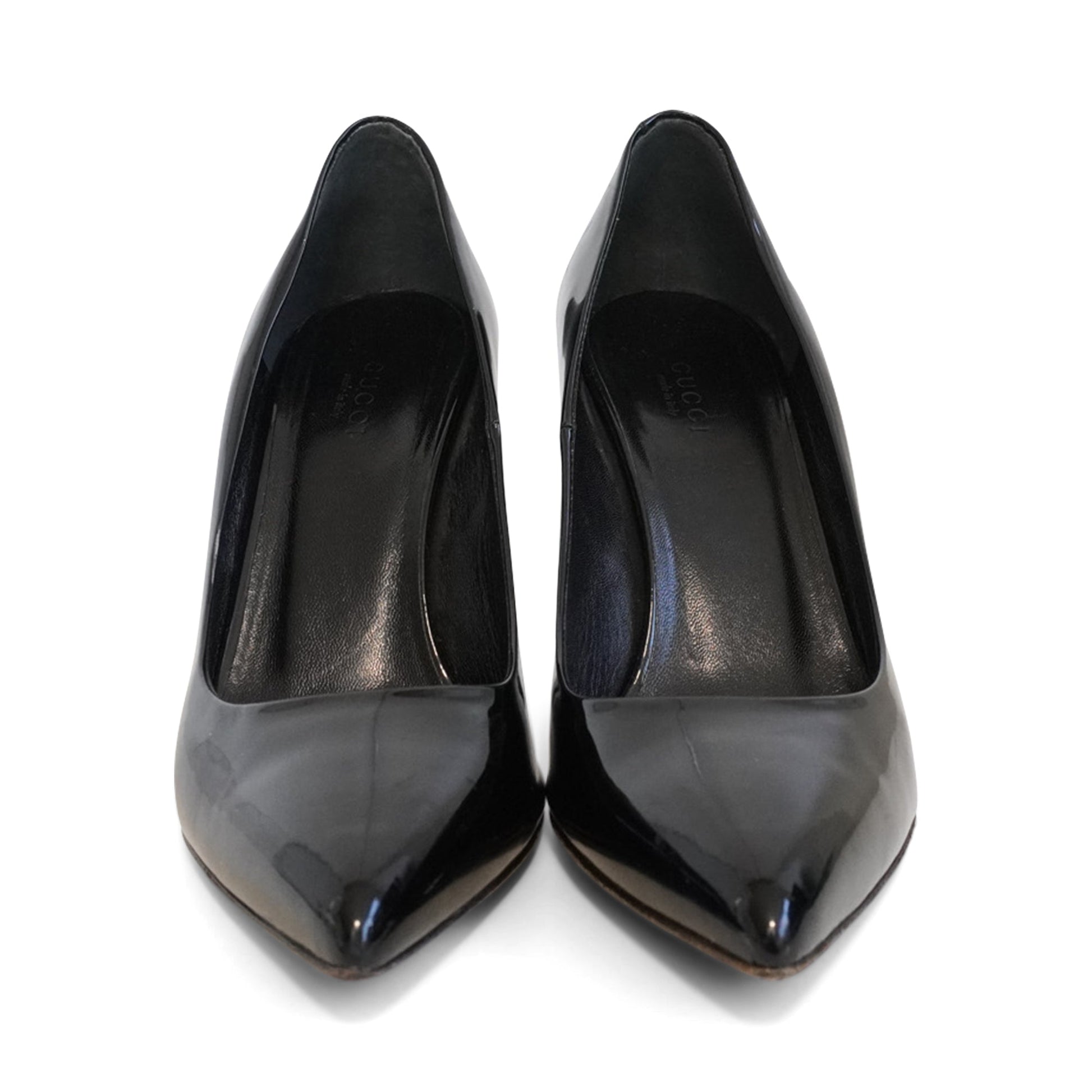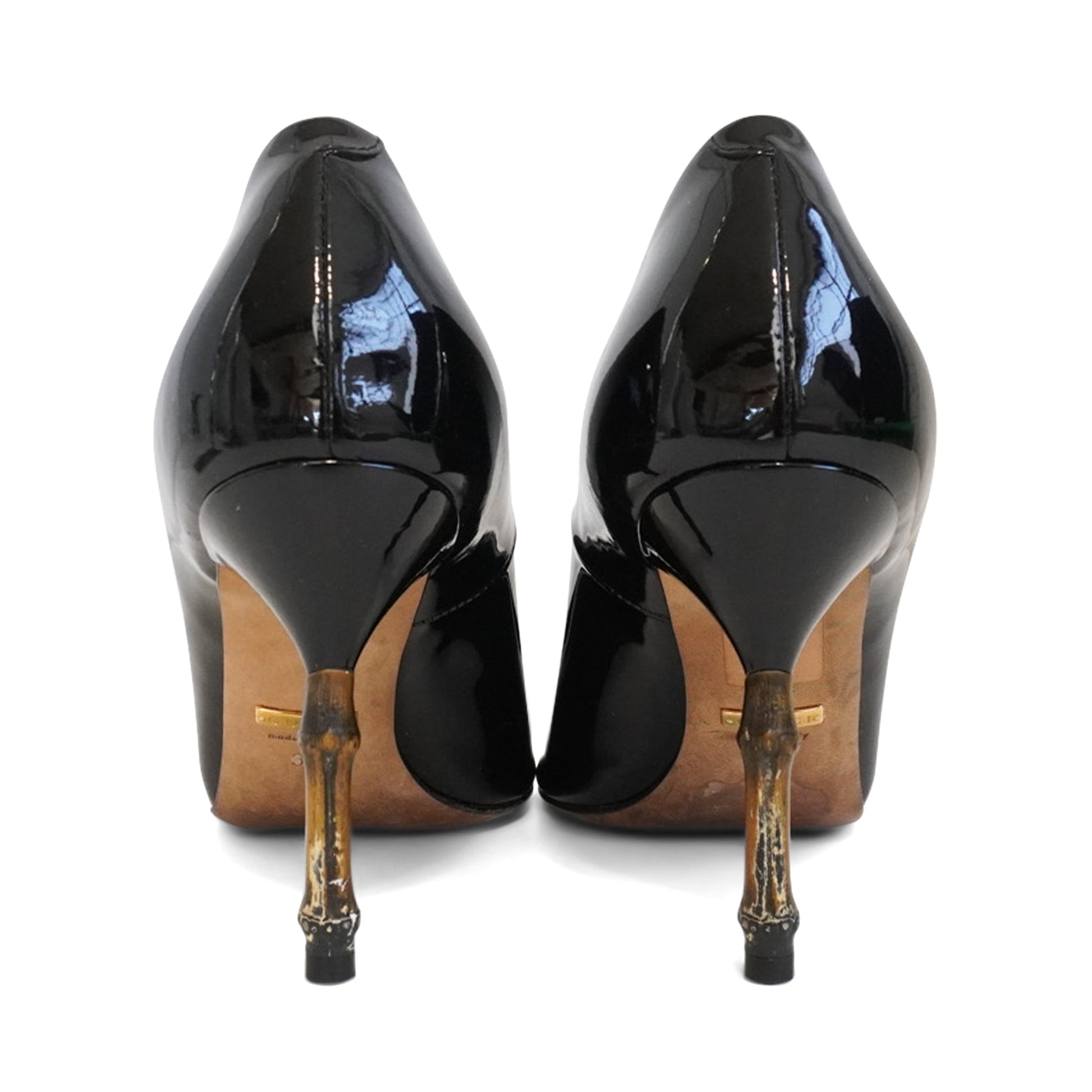 Gucci pointed toe pumps in black patent leather with bamboo heel detailing.