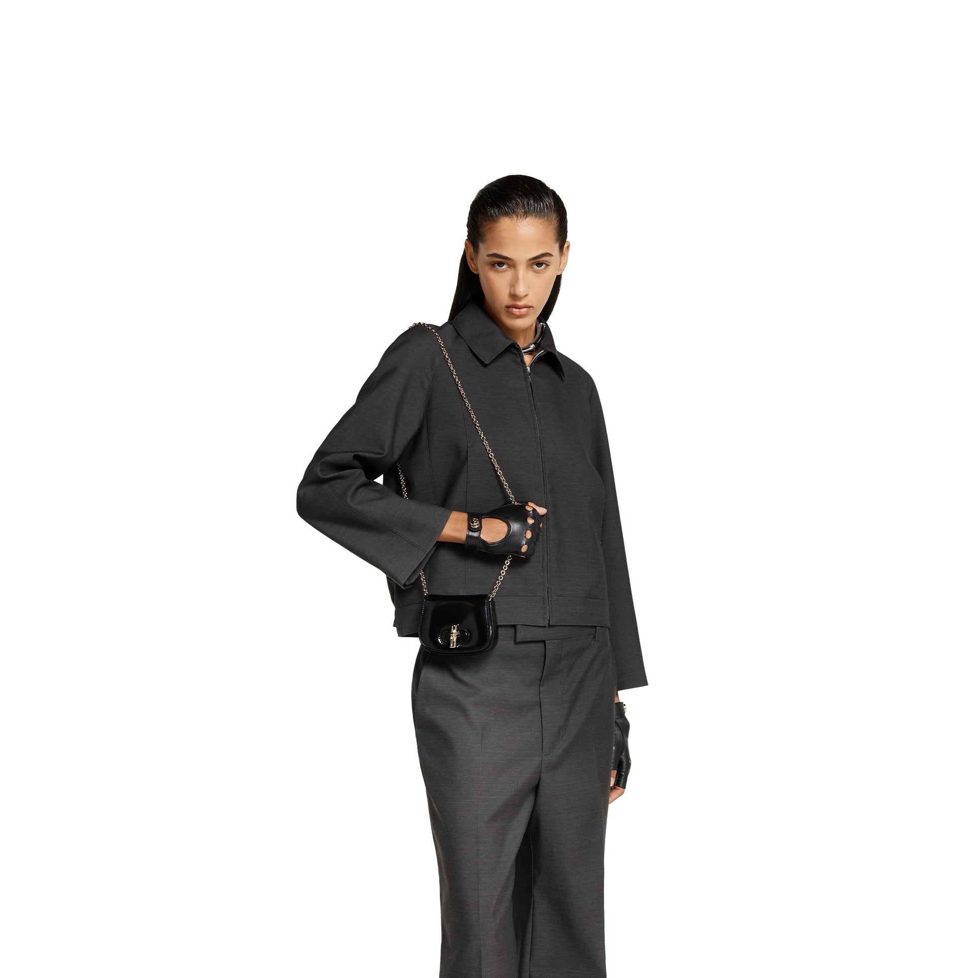 In the Spring Summer 2025 collection, this super mini bag reinterprets the House's bamboo motif, and can be worn on the shoulder with its intricate chain strap or held as an evening accessory. Gucci Bamboo Night brings the beauty of evening to life.