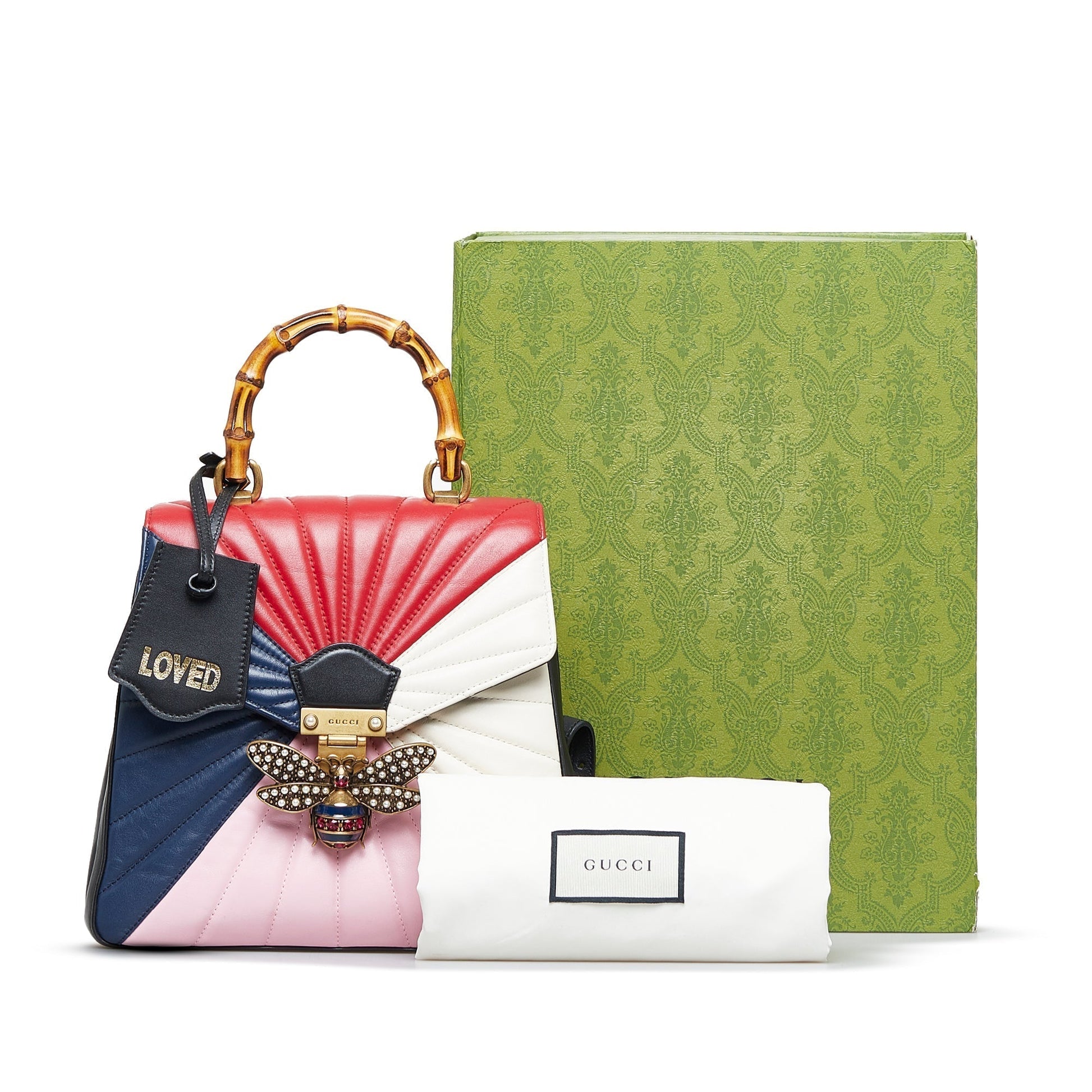 Discover the chic and luxurious Gucci Queen Margaret backpack, crafted from multicolored leather with a charming bamboo handle. Featuring adjustable shoulder straps, a front flap with butterfly magnetic snap closure, gold-tone and practical zipped and slip pockets inside, this backpack effortlessly combines style and functionality. Upgrade your everyday look with this elegant accessory suitable for any occasion.