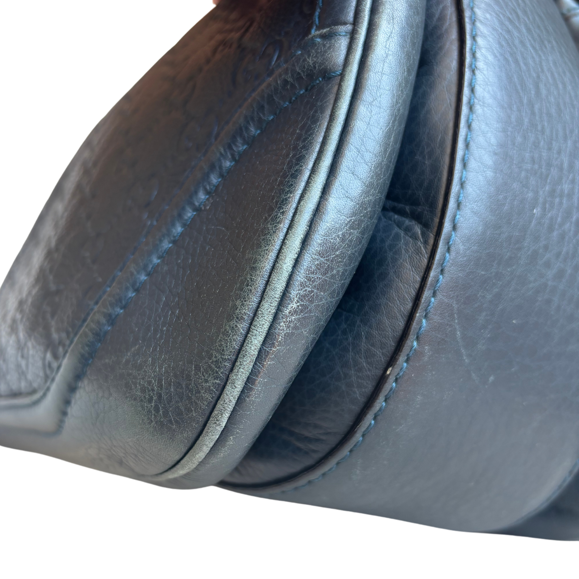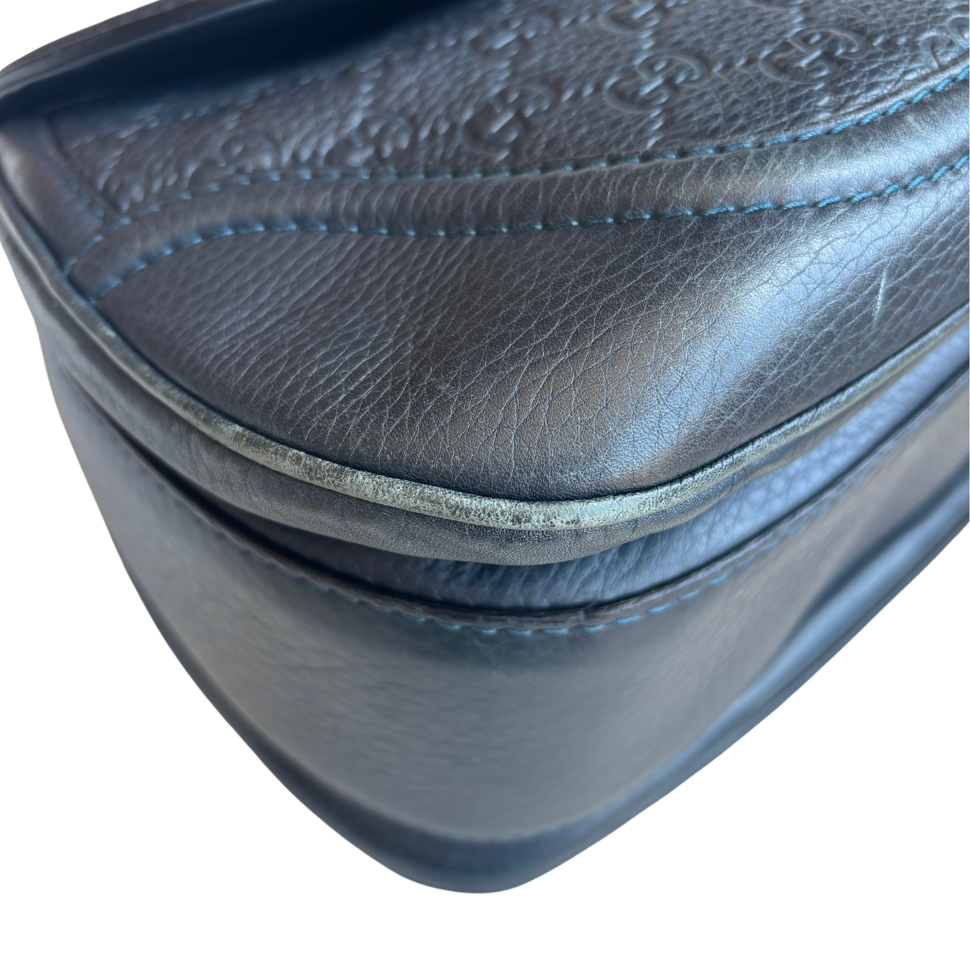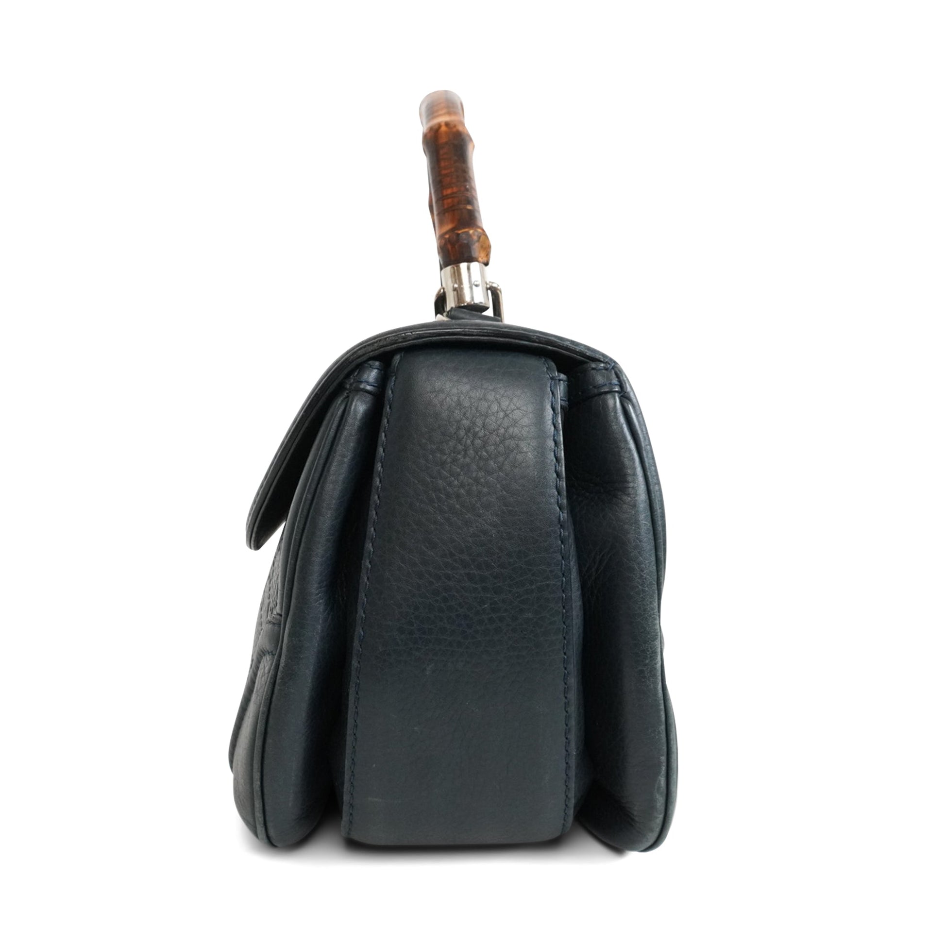 Gucci top handle bag in navy monogram embossed leather with a bamboo top handle, tassel charms, a top flap opening with a bamboo turn lock, and a beige canvas interior with zip and slip pockets. The bag includes a removable and adjustable shoulder strap with silver chain hardware.