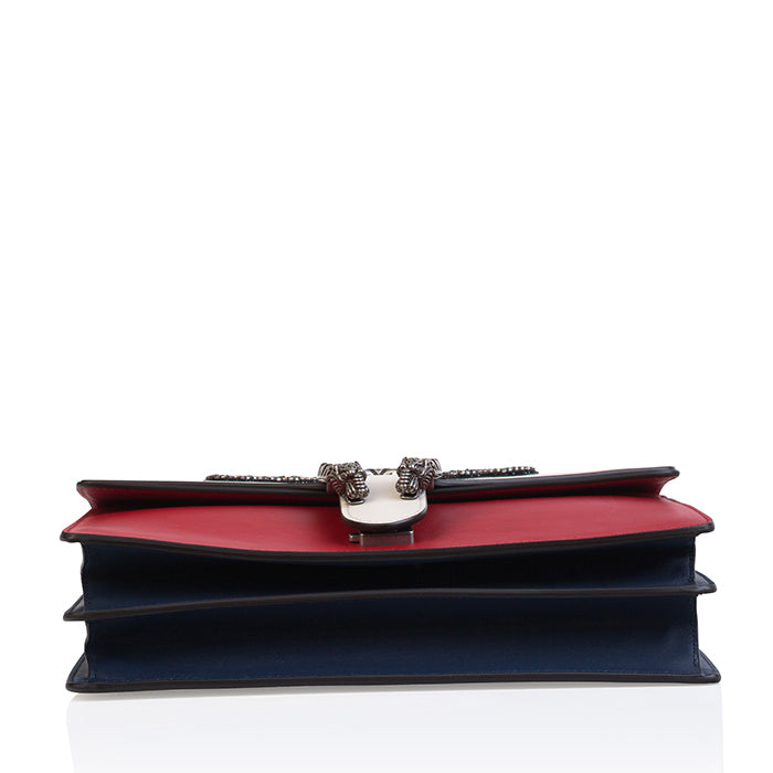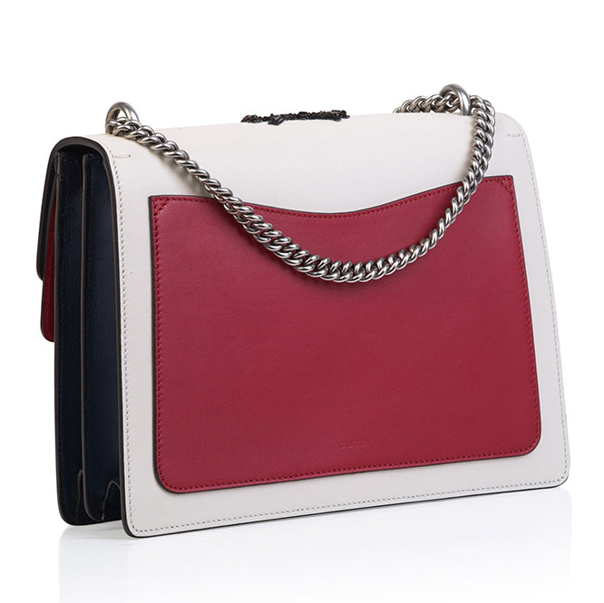 A true statement piece that every woman with an eccentric sense of style needs in her wardrobe. Carefully crafted from red, blue and white leather, this bag features Gucci's signature bee embellished on the front flap. Complimented with silver tone hardware and Gucci's classic Dionysus tiger plaque, this bag is sure to make all heads turn wherever you go. Given its bright colour palette and unique detailing, this bag is best suited with a monochrome or neutral-toned outfit to further accentuate it. Wear this Dionysus with a pair of simple black trousers and a silk blouse for a dressier look or dress it down with a pair of white jeans and a basic top for a more casual look. Wherever you go and regardless of what you wear this piece with, you'll be sure to have all eyes on you.