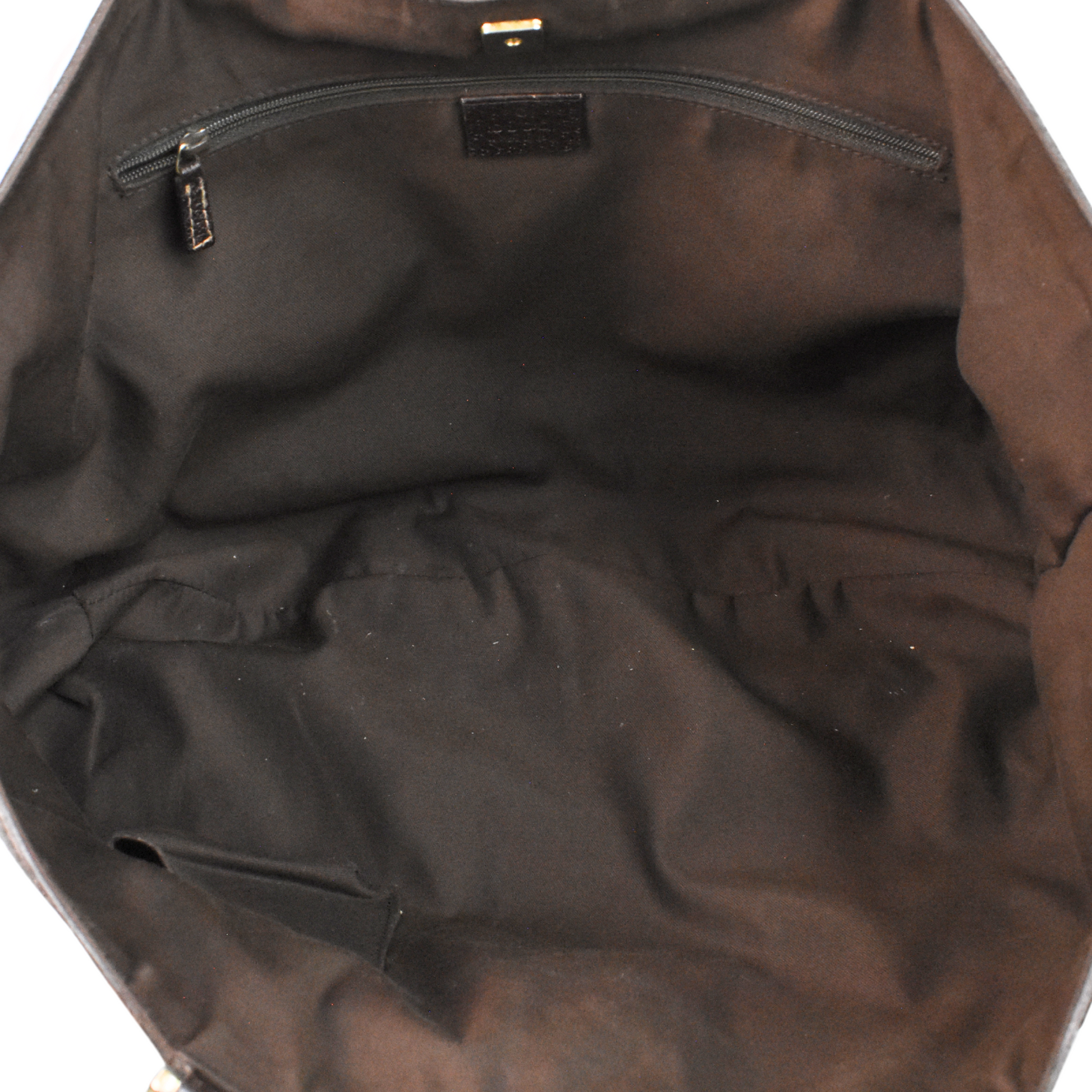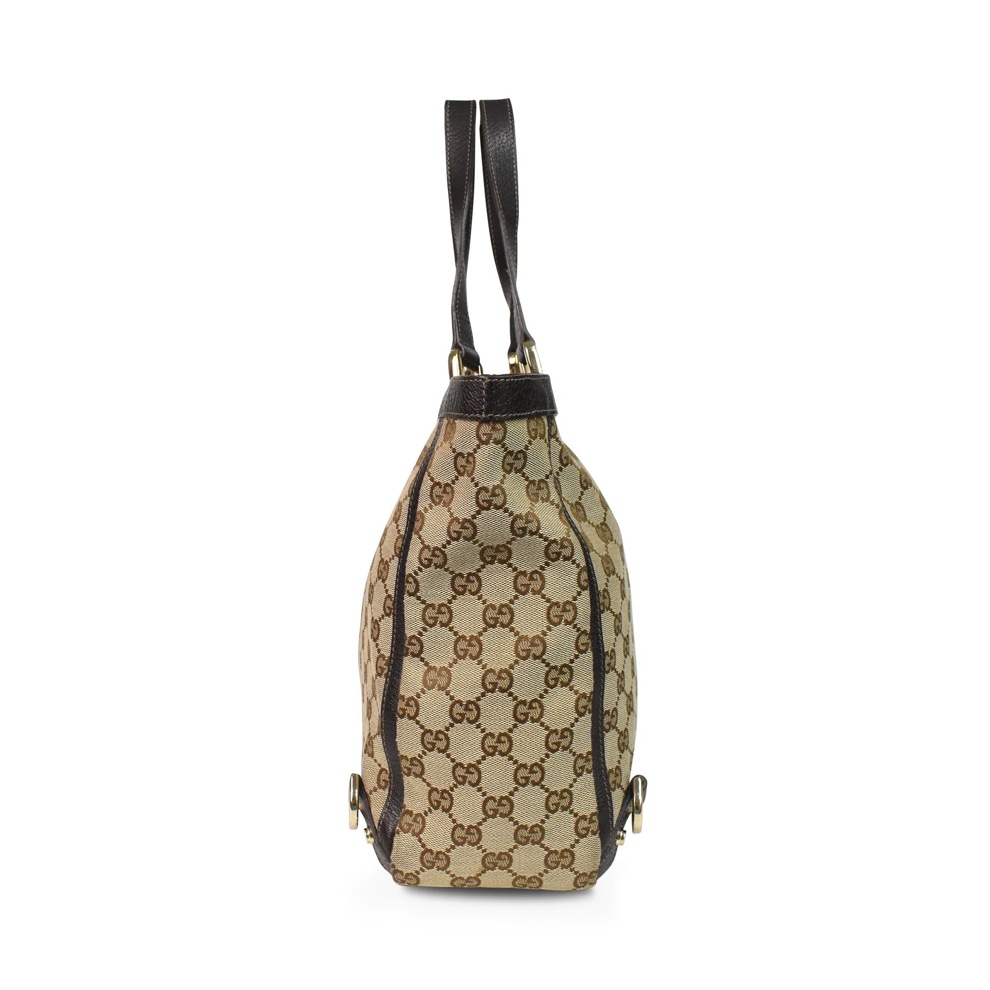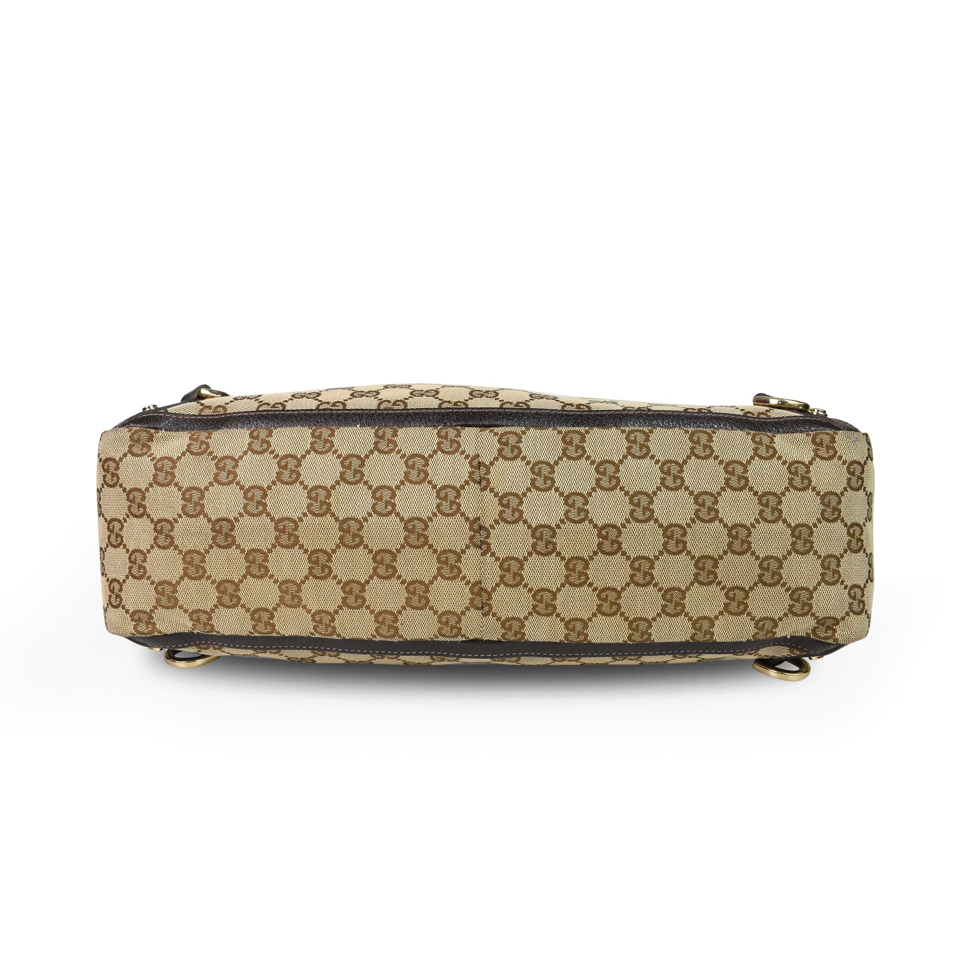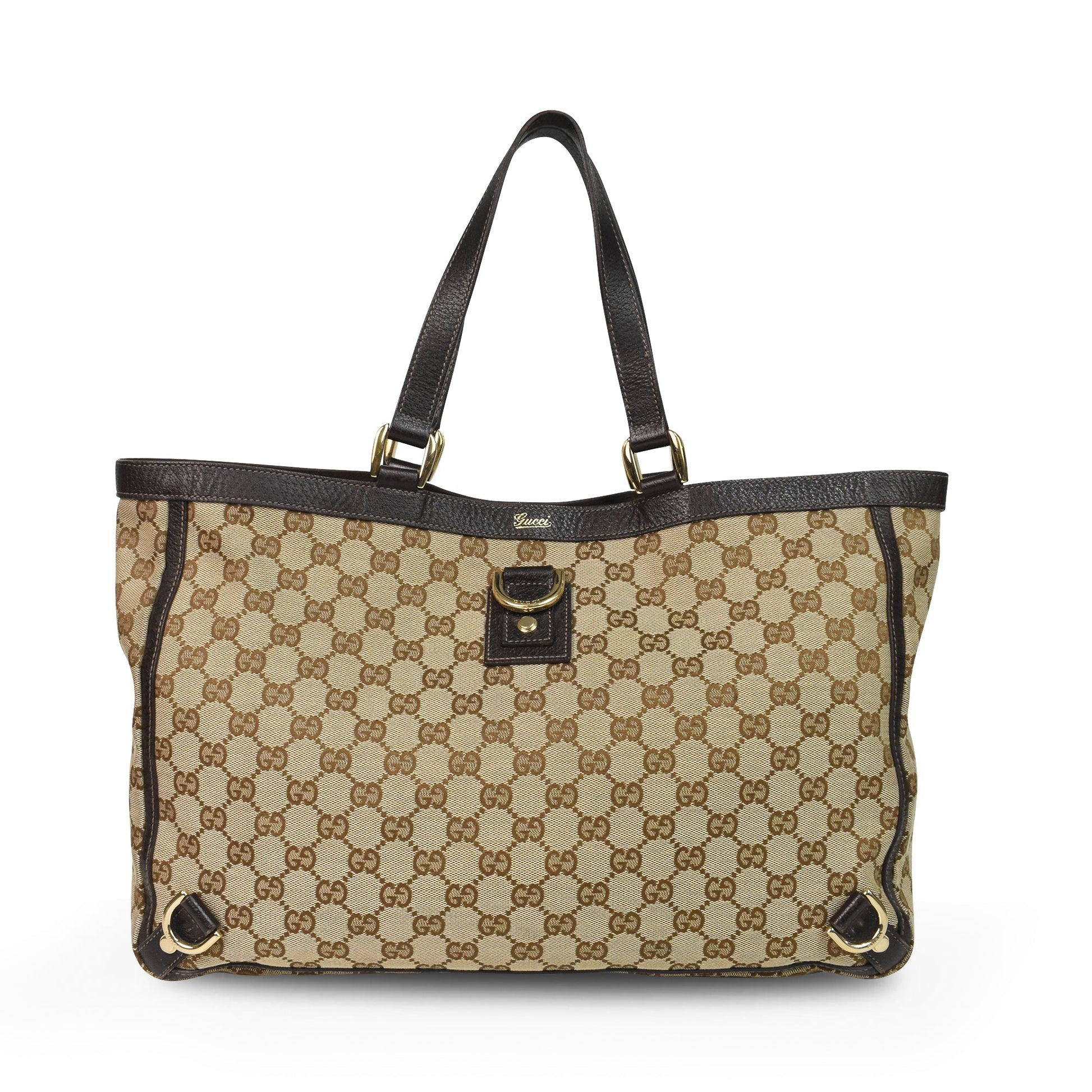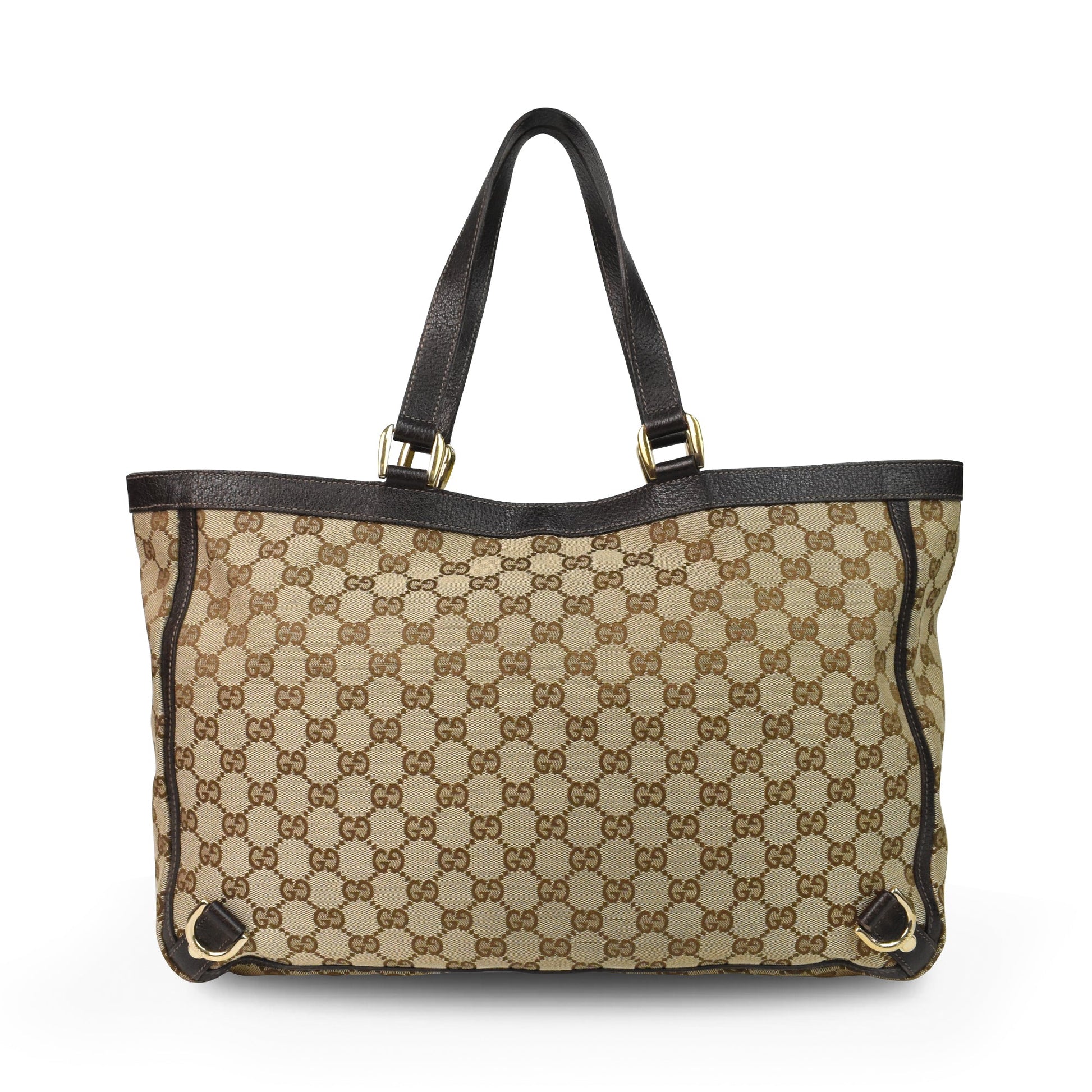 Gucci 'Abbey' tote bag in beige GG monogram canvas with D-ring detailing in gold hardware and a brown leather trim. Features dual flat leather handles, an open top, and an interior zip with slip pockets.