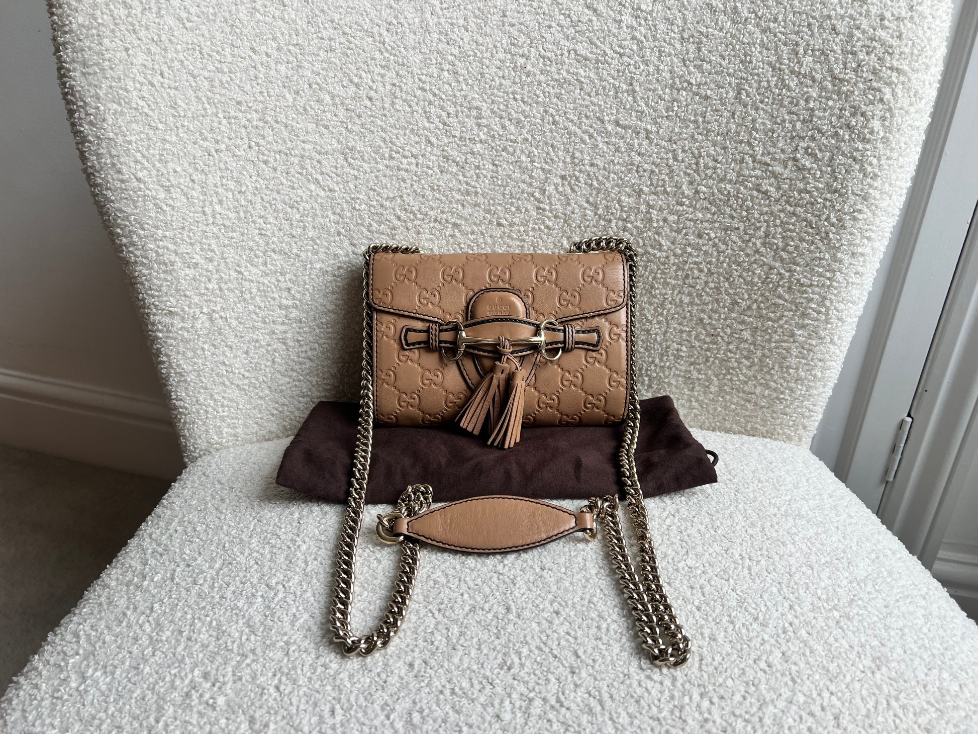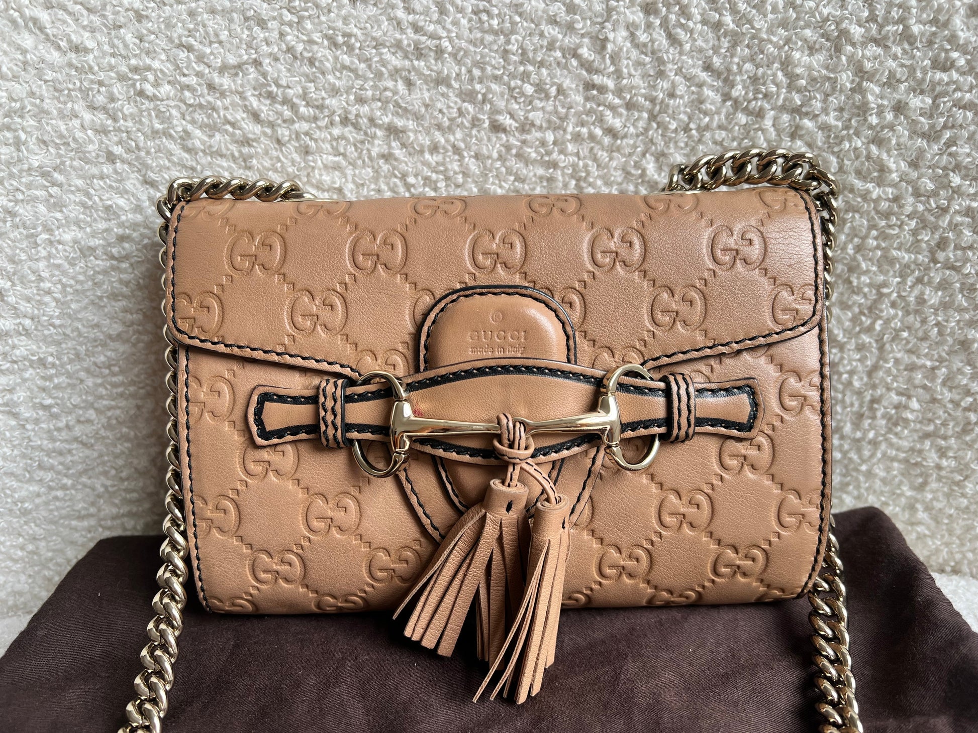 Gucci Guccissima Mini Emily Shoulder Bag in Beige embossed calf leather with pale gold hardware. The mini Emily shoulder bag features sleek lines, luxurious beige leather with the iconic horse bit hardware. Ideal for evening use and can be comfortably carried over shoulder using the single chain strap with leather shoulder pad. Fits the essentials.