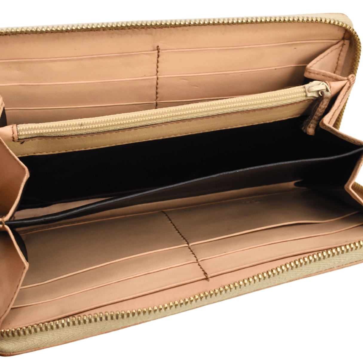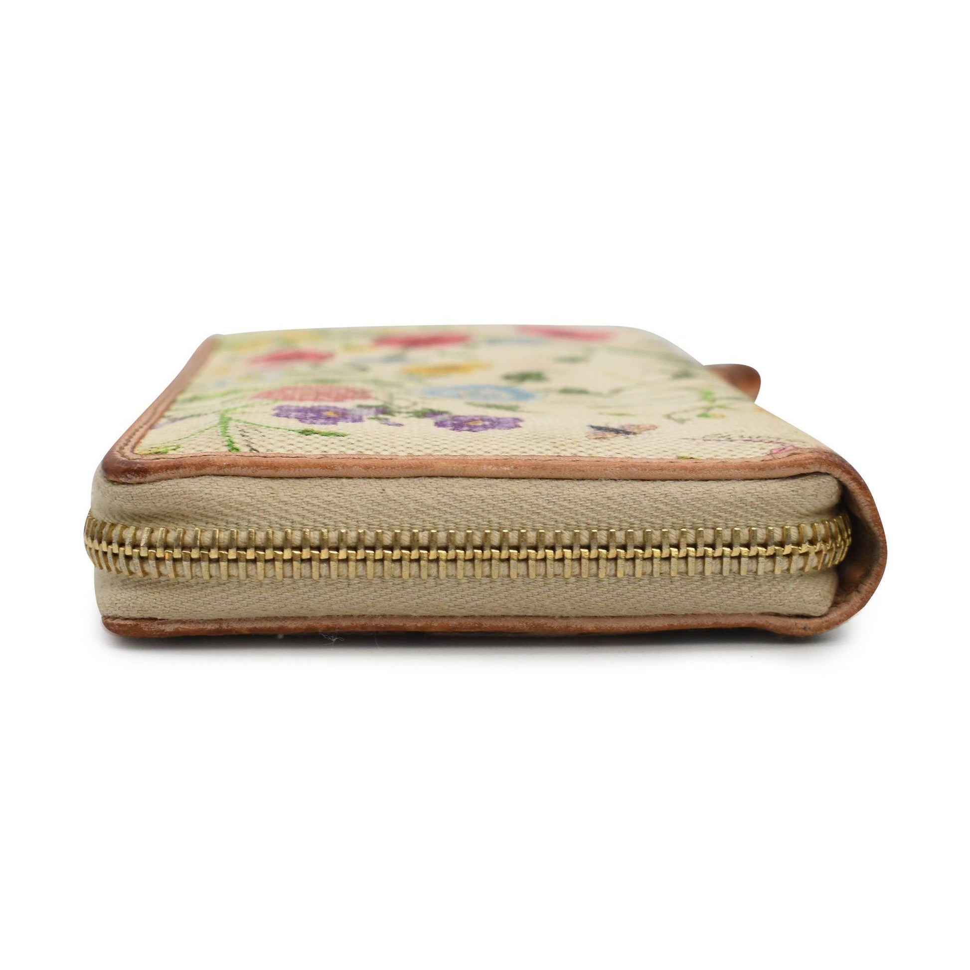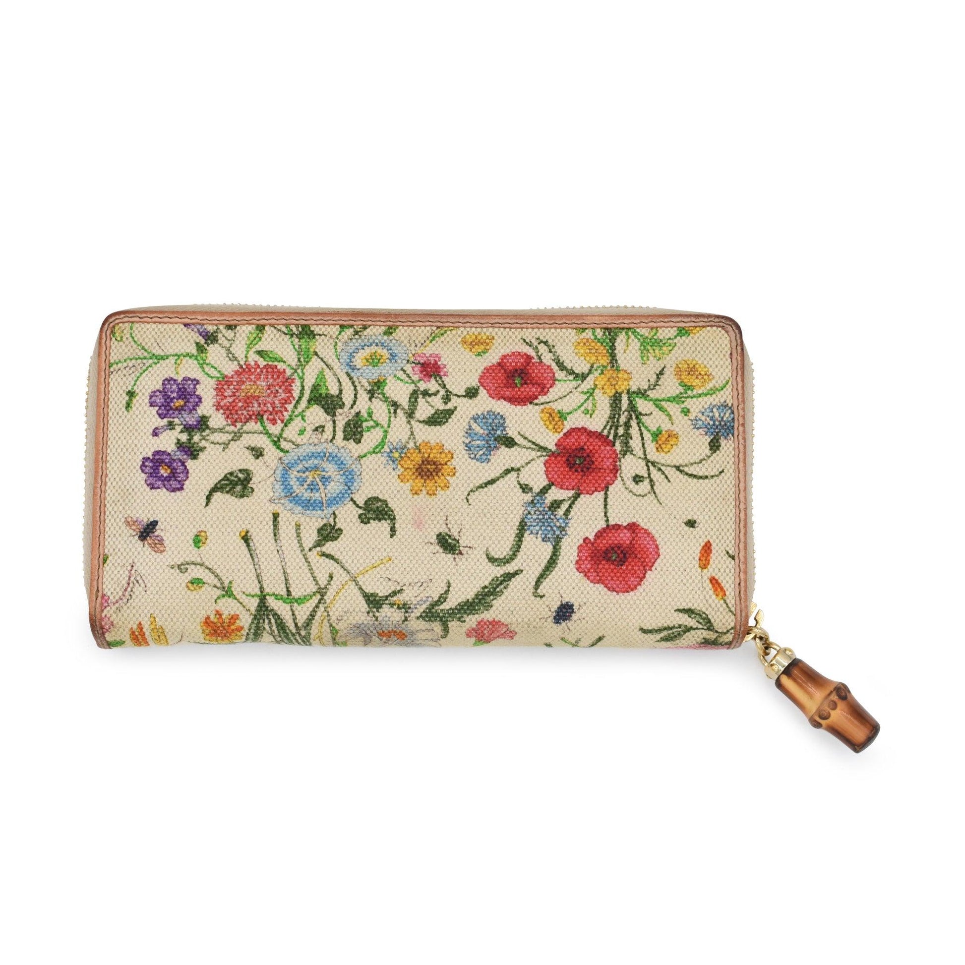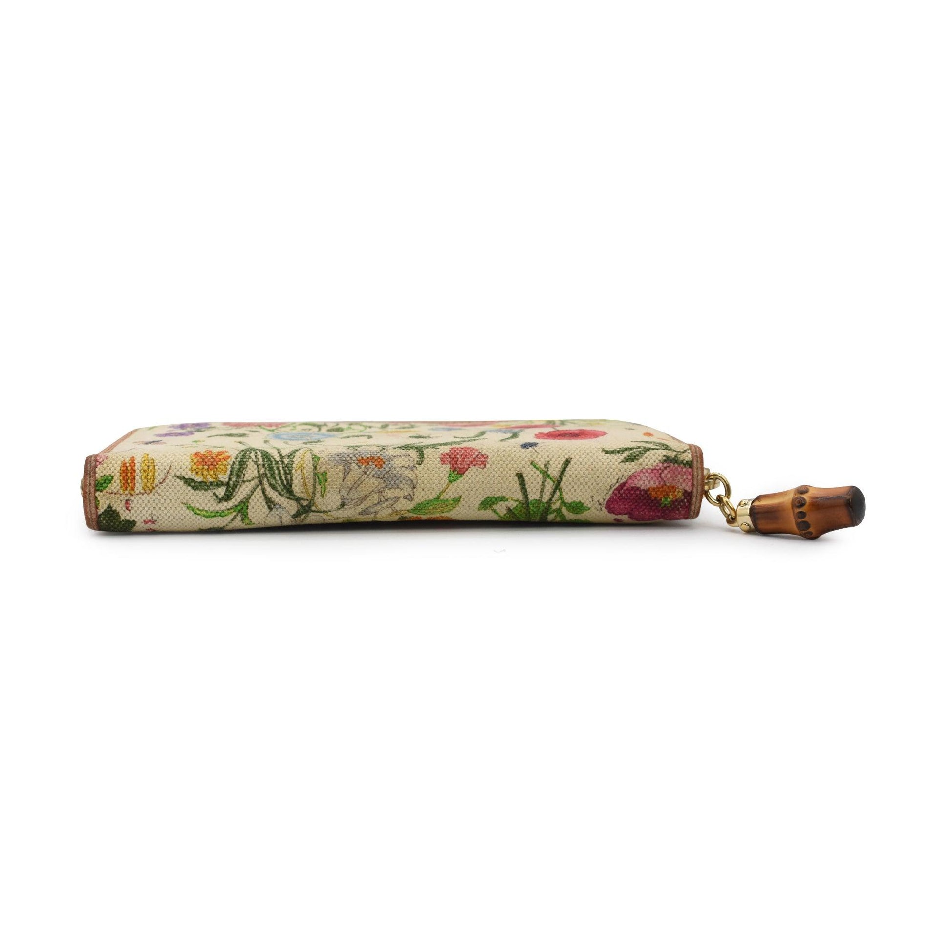 Gucci Continental Wallet in beige canvas with multicolour floral print. Features a zip closure in gold hardware with a bamboo tassel zip pull and beige leather interior.