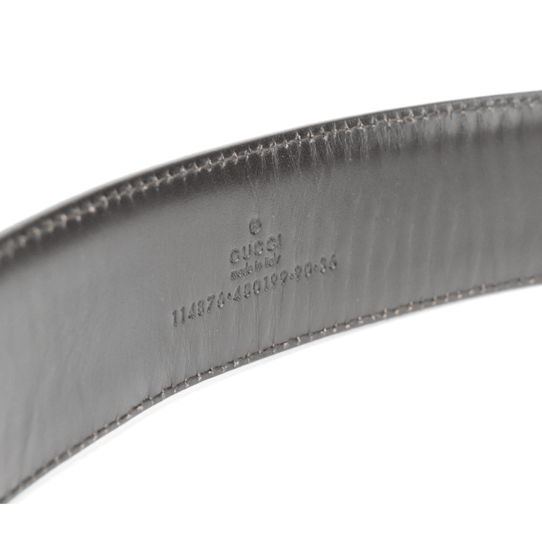 Gucci belt in beige monogram canvas with brown leather trim and a 'GG' buckle in gunmetal hardware.
