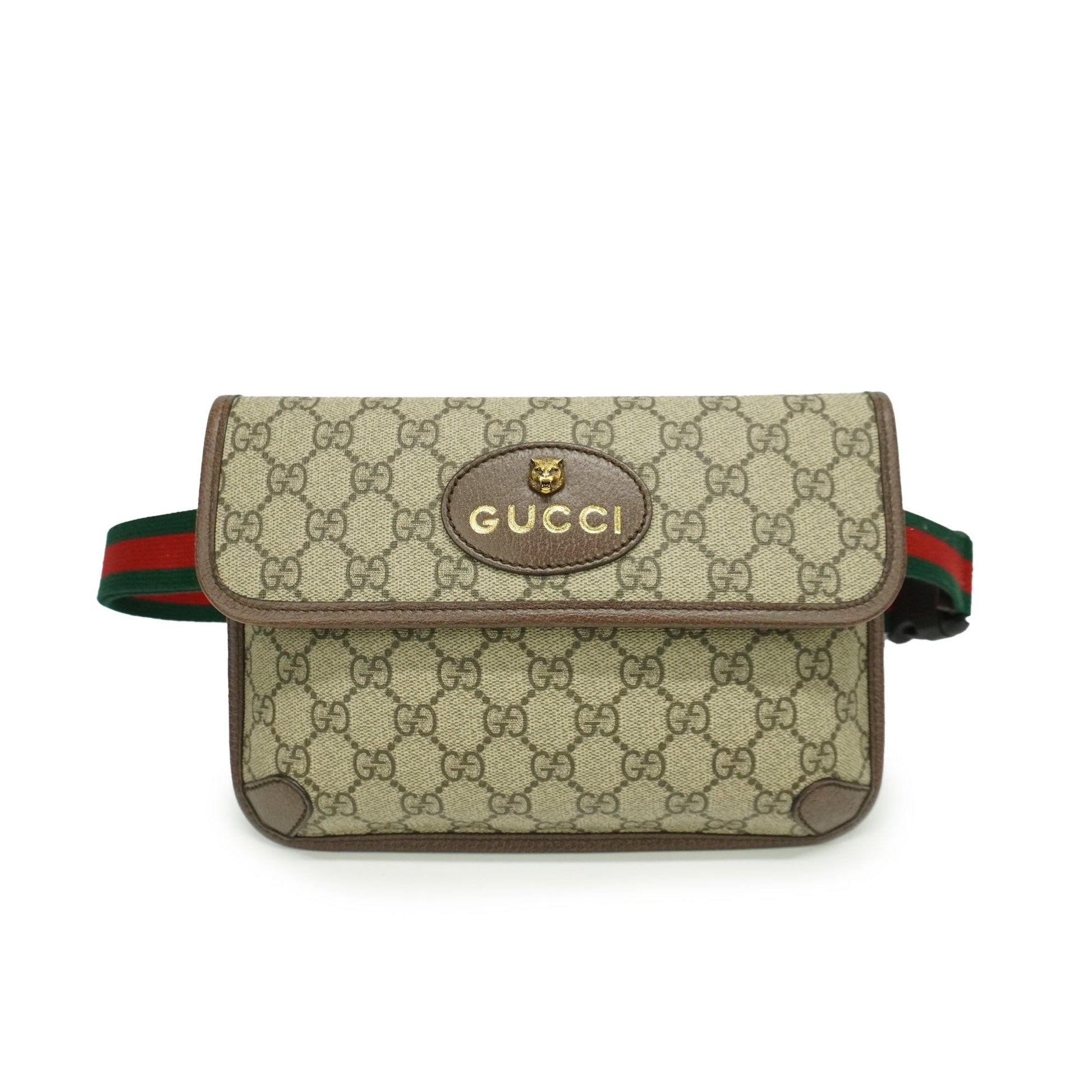 Gucci belt bag in beige logo monogram coated canvas with brown leather trim detailing. Features a canvas red and green racing stripe adjustable belt with plastic side-release buckle, gold hardware, magnetic top flap closure, and leather plaque with gold-foil embossed logo and gold tiger head on the top flap. The interior features cream canvas lining.