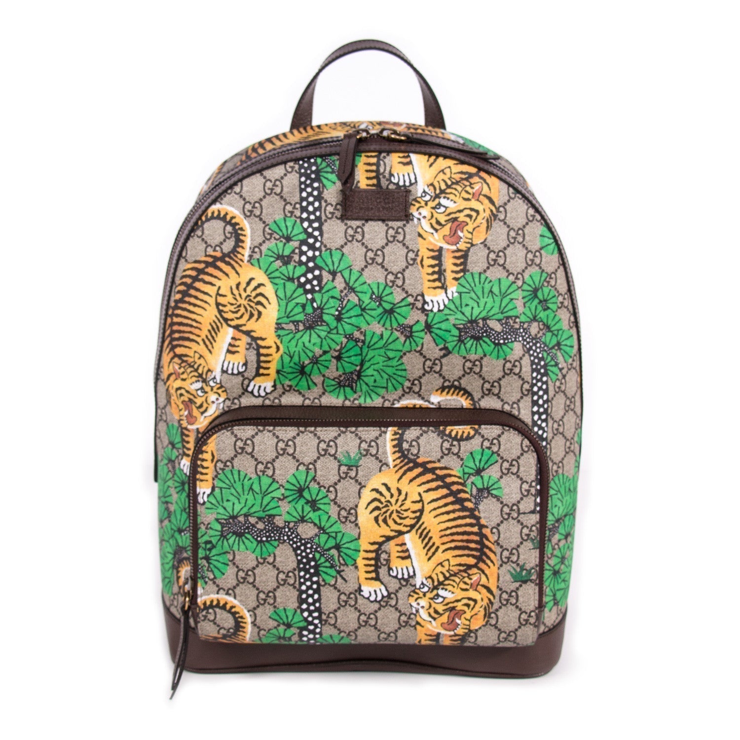 Details: Beige-Ebony GG Supreme Coated Canvas With Gucci Bengal Print / Brown Leather Trim / Embossed Logo Patch At Front Face / Adjustable Signature Green And Red Web Straps / Flat Leather Handle / Brass Hardware / Exterior Zip Pocket At Front Face / Microfiber Lining With Suede Finish At Interior / Interior Pocket For Laptop / Two Smartphone Pocket / Two-Way Zip-Around Closure