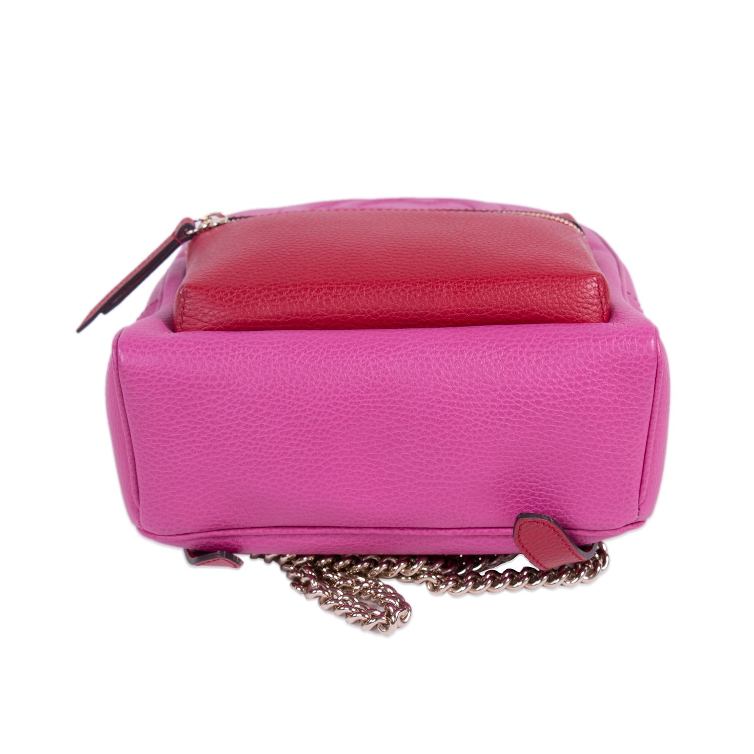 Details: Pink and Red Textured-Leather / Gold-Tone Hardware / Embossed Interlocking GG Logo / Leather Top Handle / Dual Chain-Link Straps / Zipper Pocket at Front / Fabric Interior Lining with Open Pockets / Two-Way Zipper Closure
