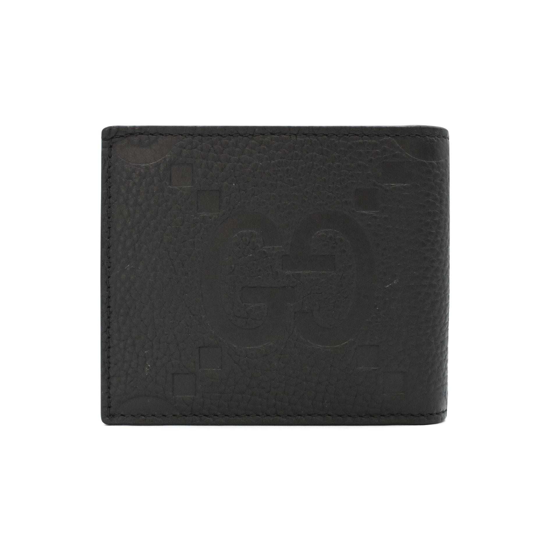 Gucci 'GG Jumbo' bi-fold wallet in black pebbled leather with large embossed logos. The interior features a cash slot and multiple card slots.