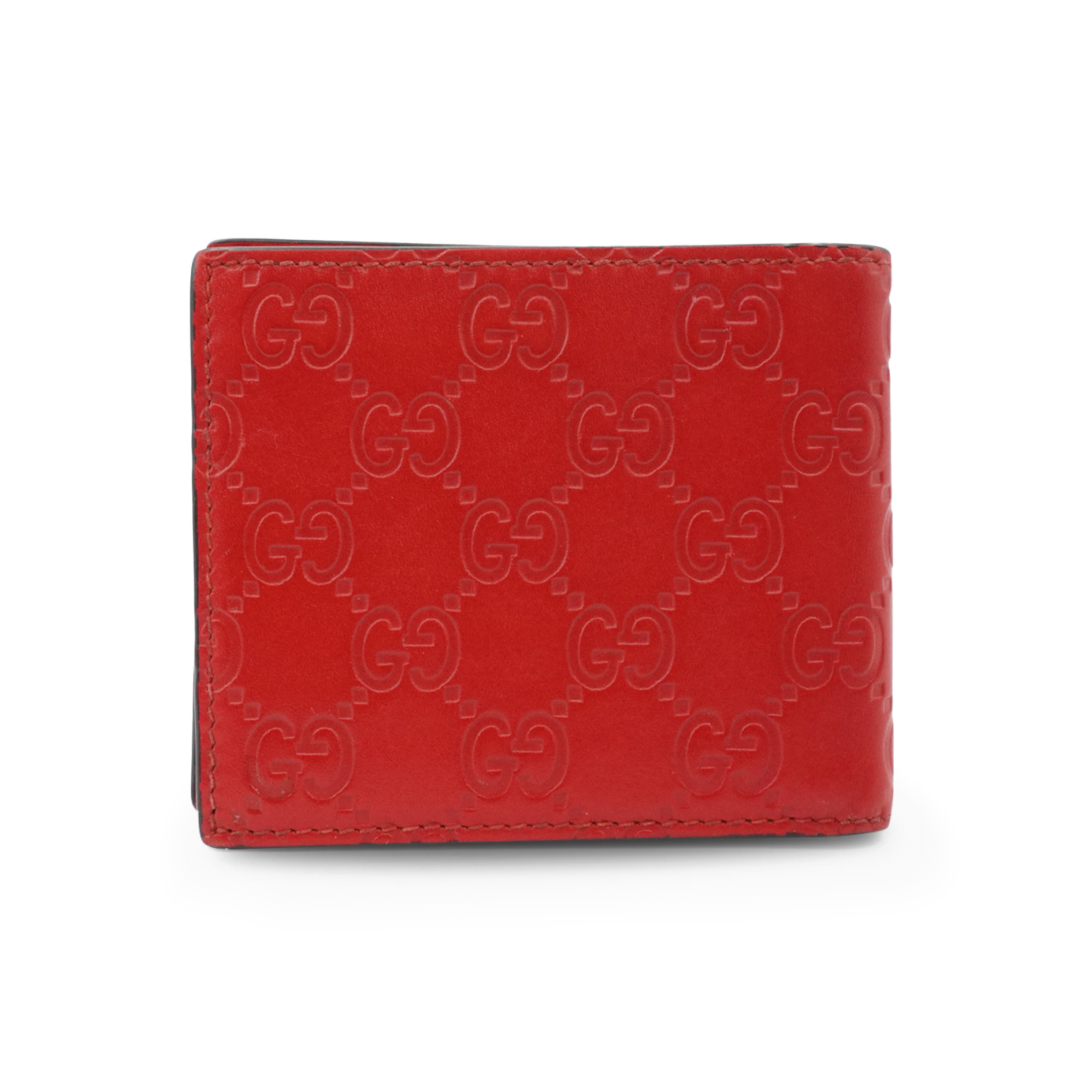 Gucci bi-fold wallet in red leather with all-over 'GG' monogram embossing and a smooth leather lined interior with various card and cash pockets.
