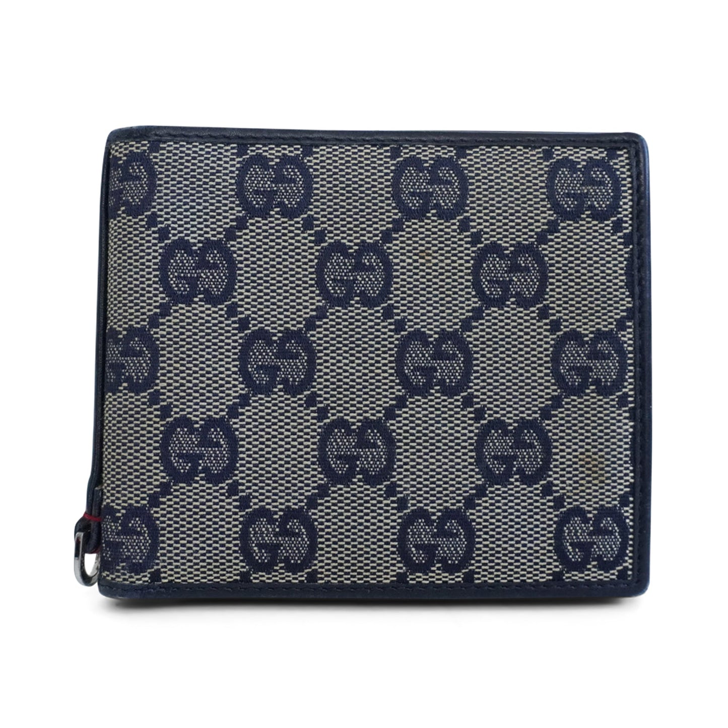 Gucci bifold wallet in navy and grey monogram canvas with navy leather trim and lining. Features navy-red racing stripe webbing down the spine with a silver D-ring at the base. The wallet has 8 card slots and 2 cash pockets