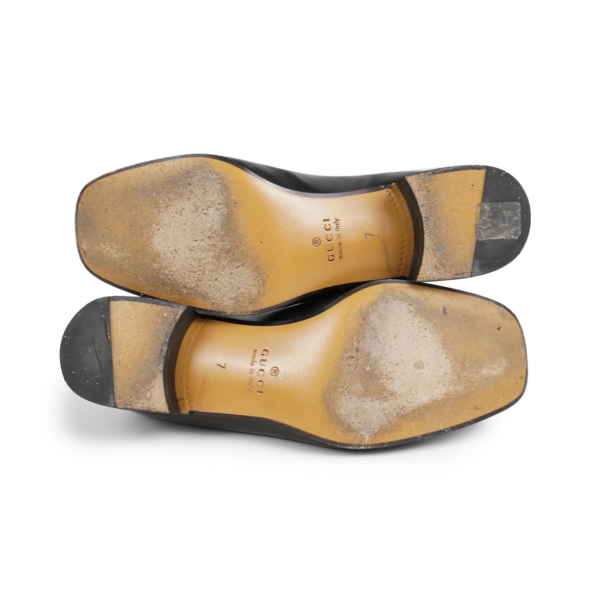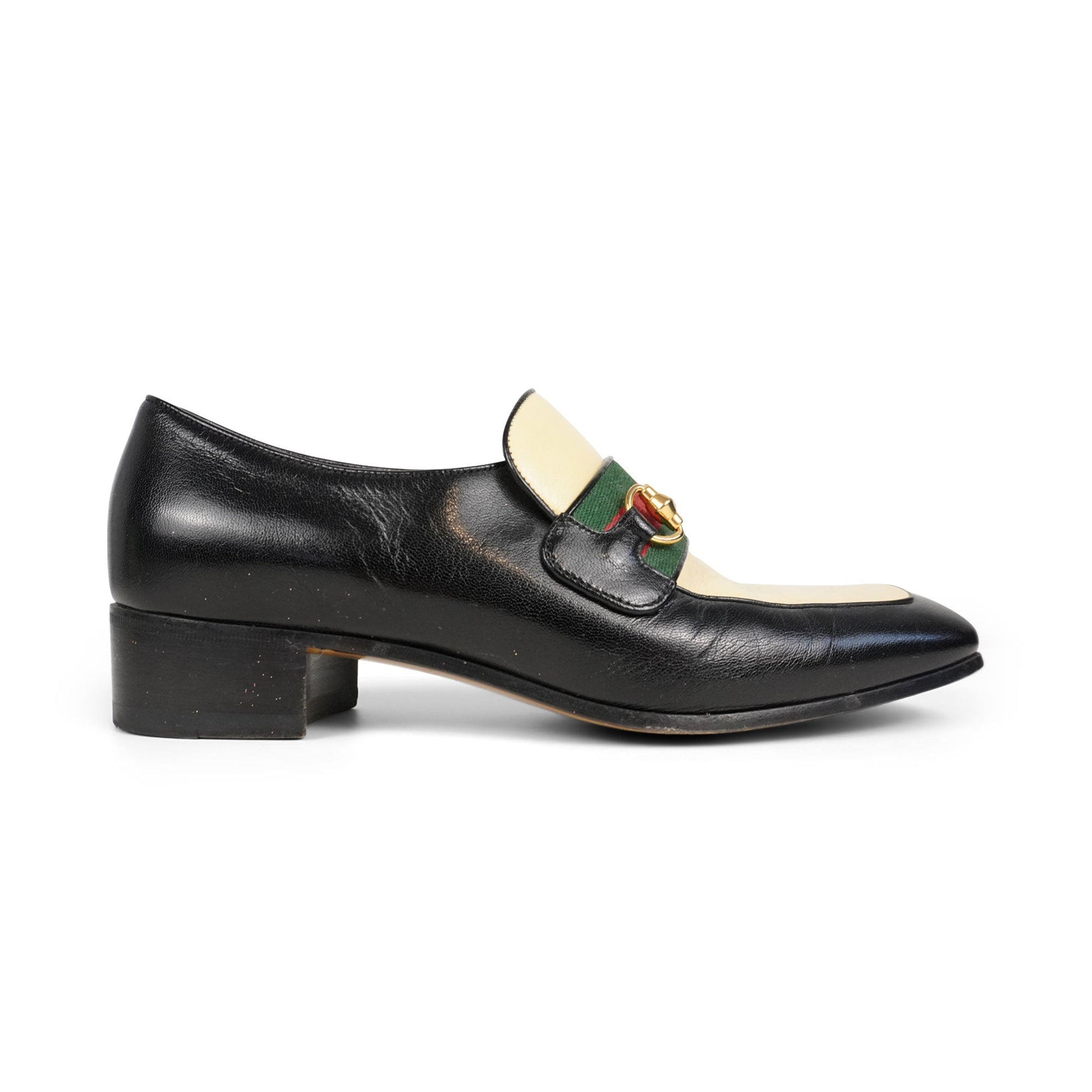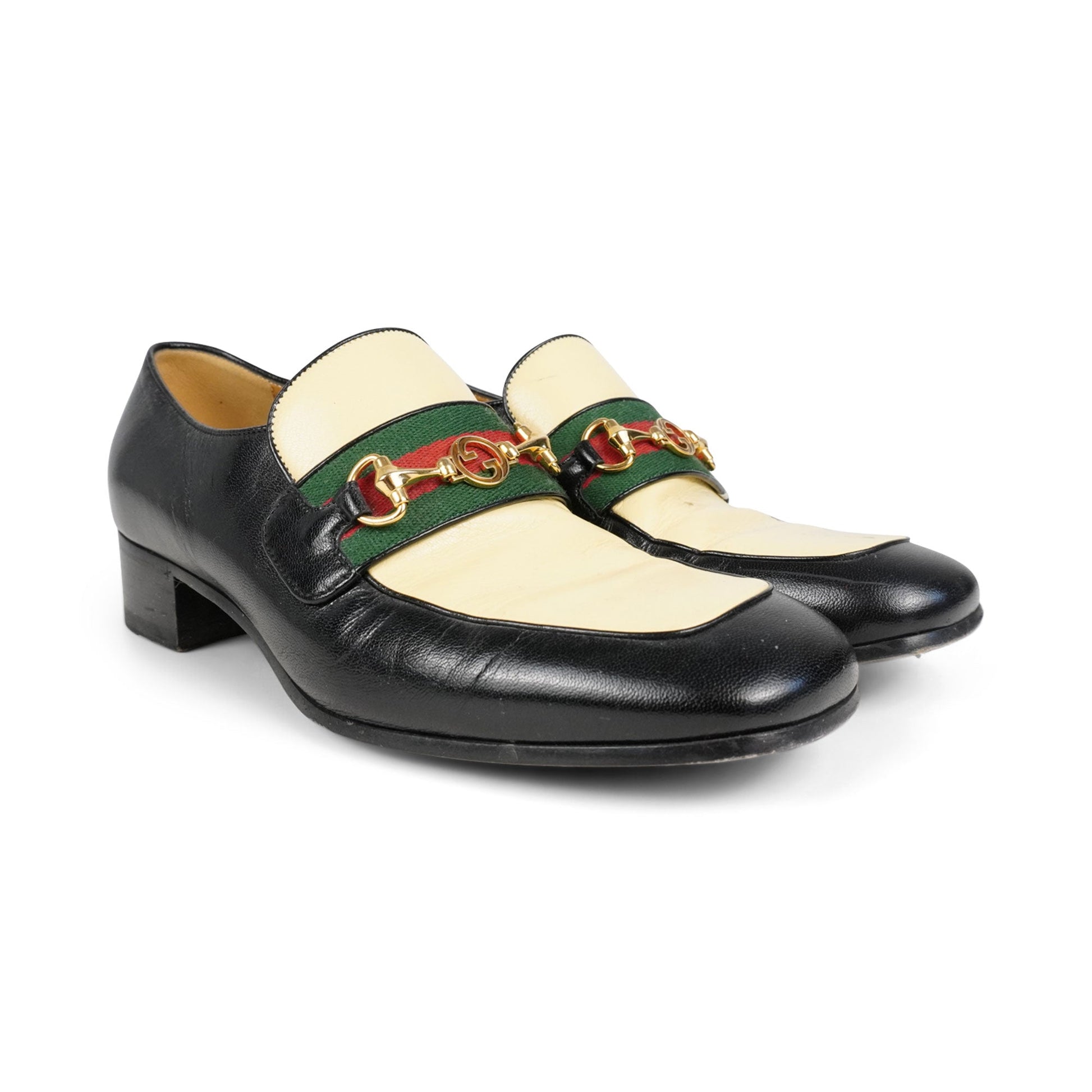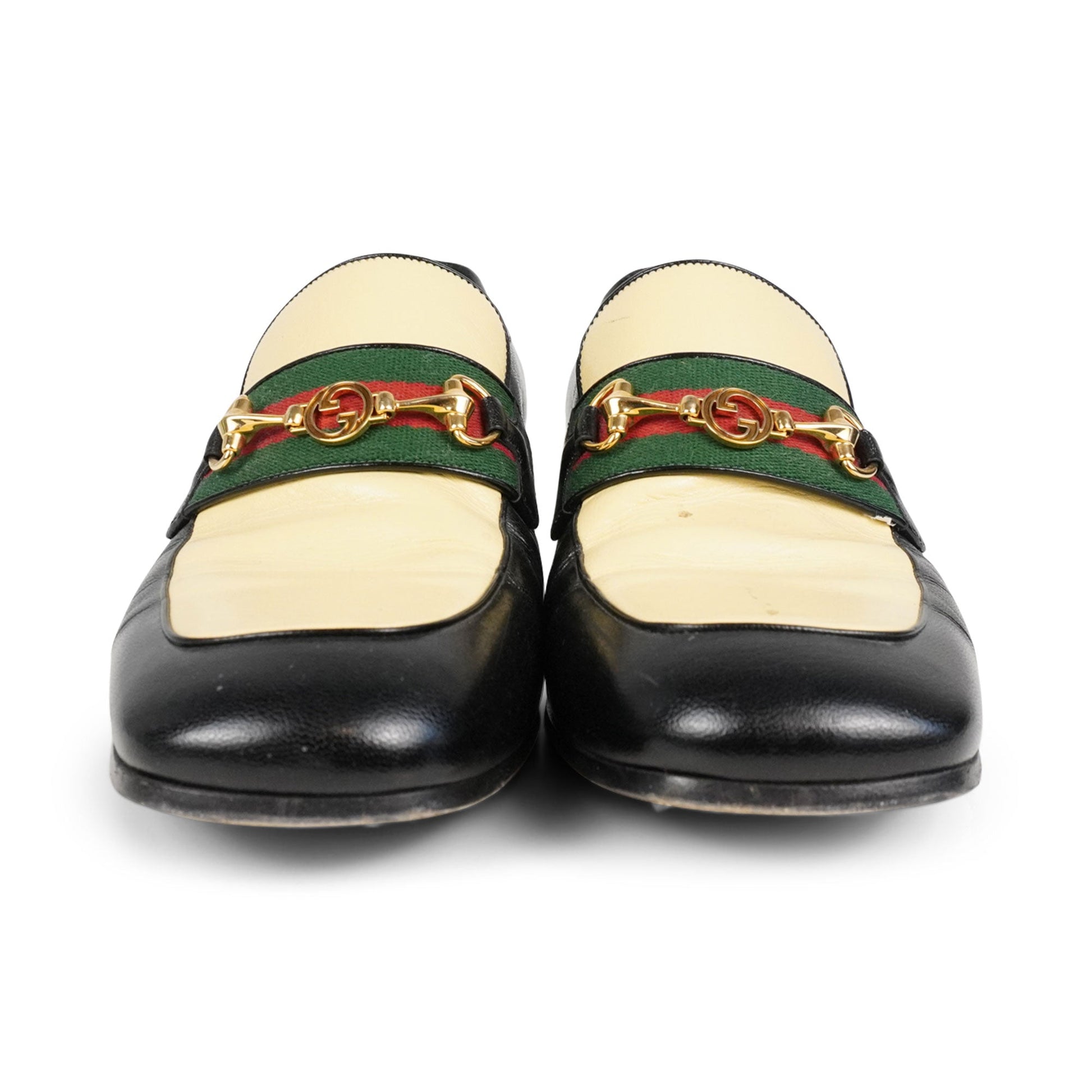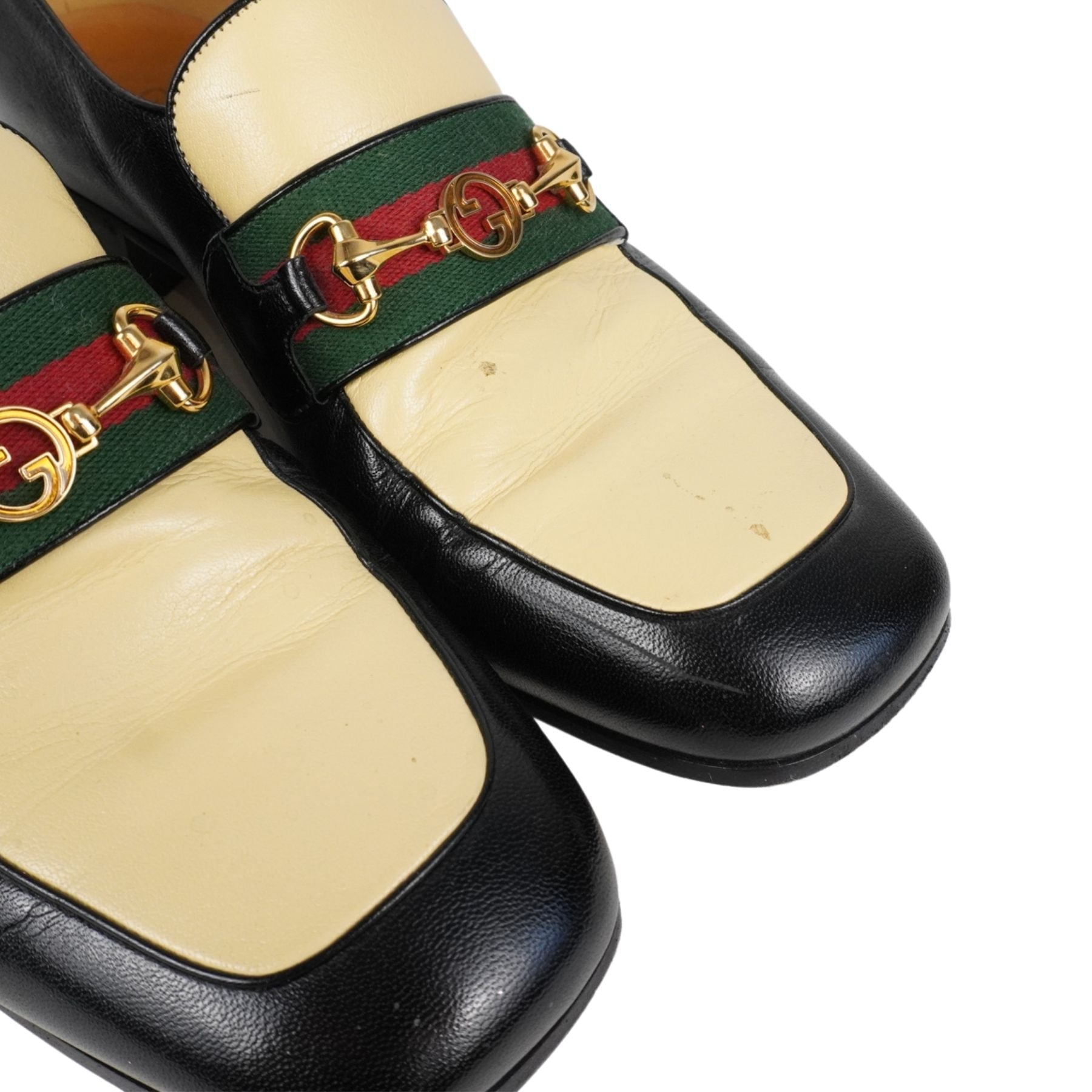 Gucci square-toe loafers in black leather with a cream front panel, web racing stripe, and a vintage horse-bit logo buckle on the tongue in gold hardware.