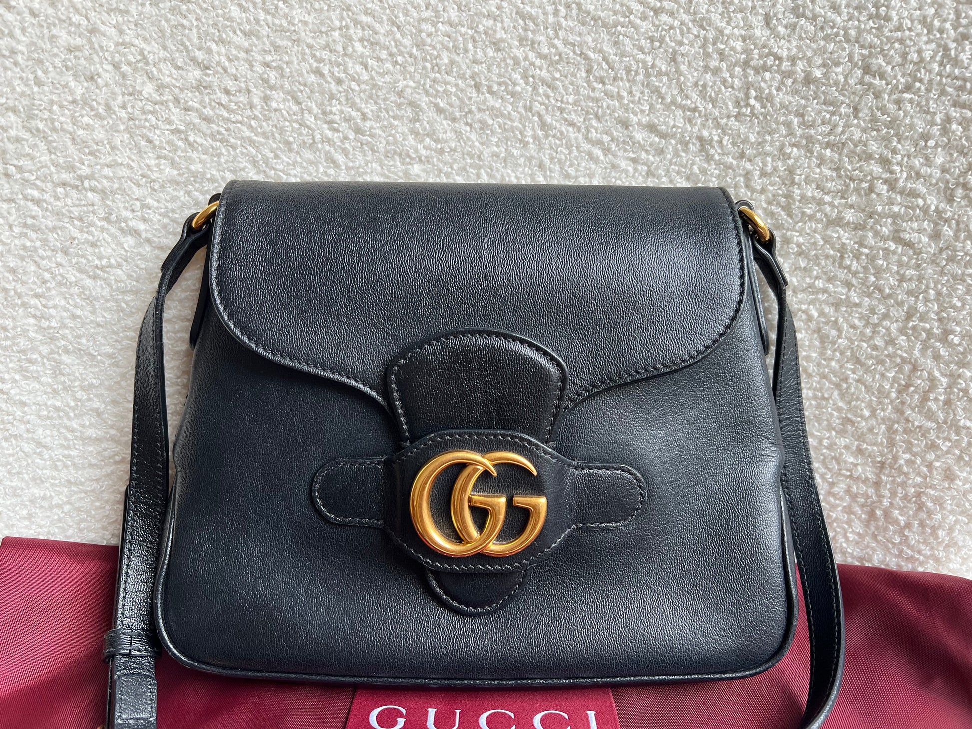 Gucci Dahlia Bag in Black Calfskin with gold hardware. Gucci’s Pre-Fall 2023 collection captures the essence of Gucci. This slim cross body bag is presented in black soft leather and enriched with the instantly recognisable Double G. Can be carried cross body using the strap.