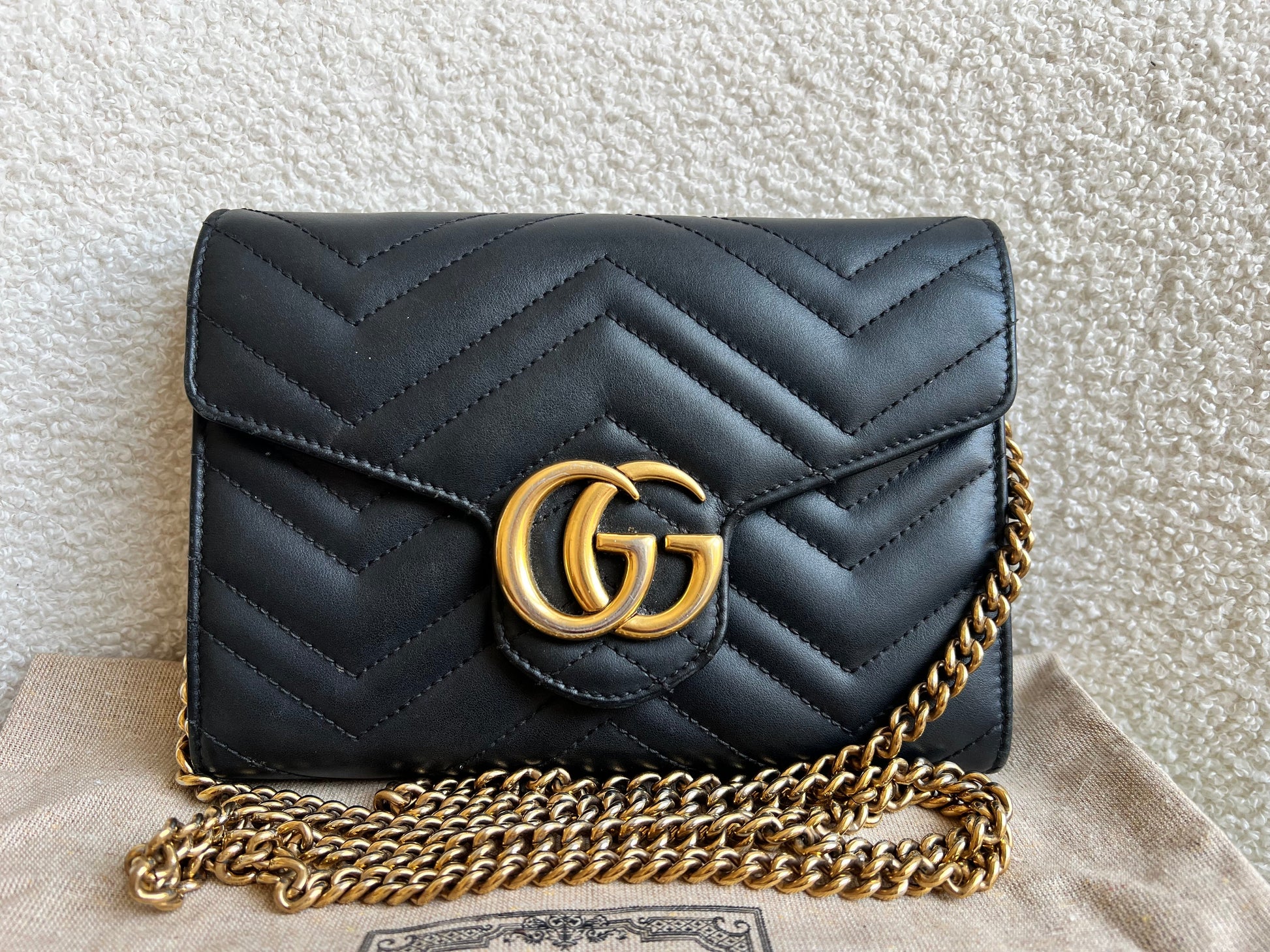 Gucci GG Marmont Matelasse Mini in black matelasse chevron leather with antique gold hardware. This classic wallet on chain is the perfect addition to an outfit for evening or event wear. The chain is detachable so can be worn cross body or used as a hand held clutch. Featuring GG hardware and flap and press stud closure, there is a zipped section inside and plenty of card slots.