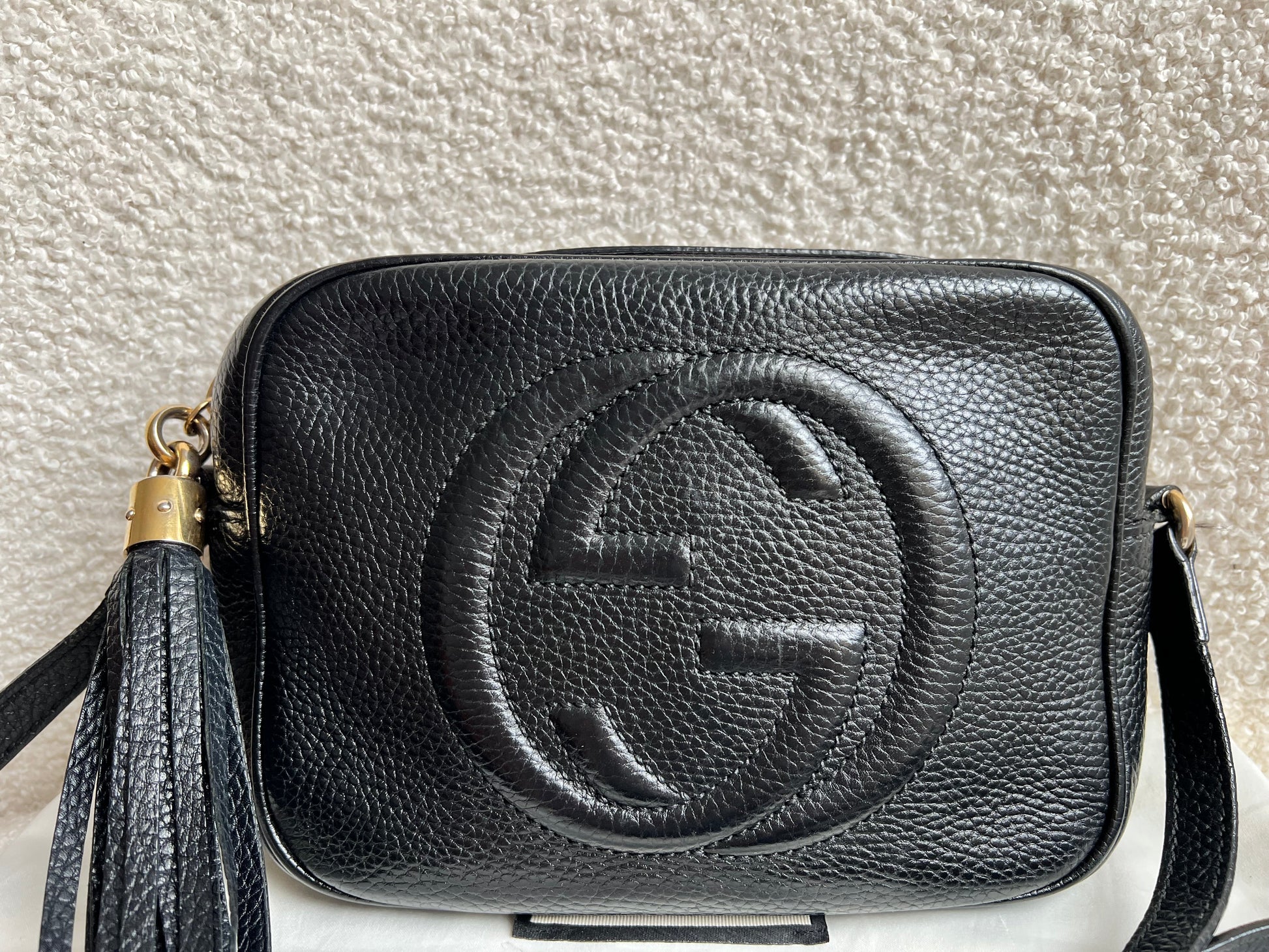 Gucci Soho Disco in Black Leather with pale gold hardware. This practical, cross body, camera style bag is compact in size but still fits a reasonable amount. Can be worn over shoulder or cross body. Gucci's most popular style and goes with any outfit, dressed up or down.