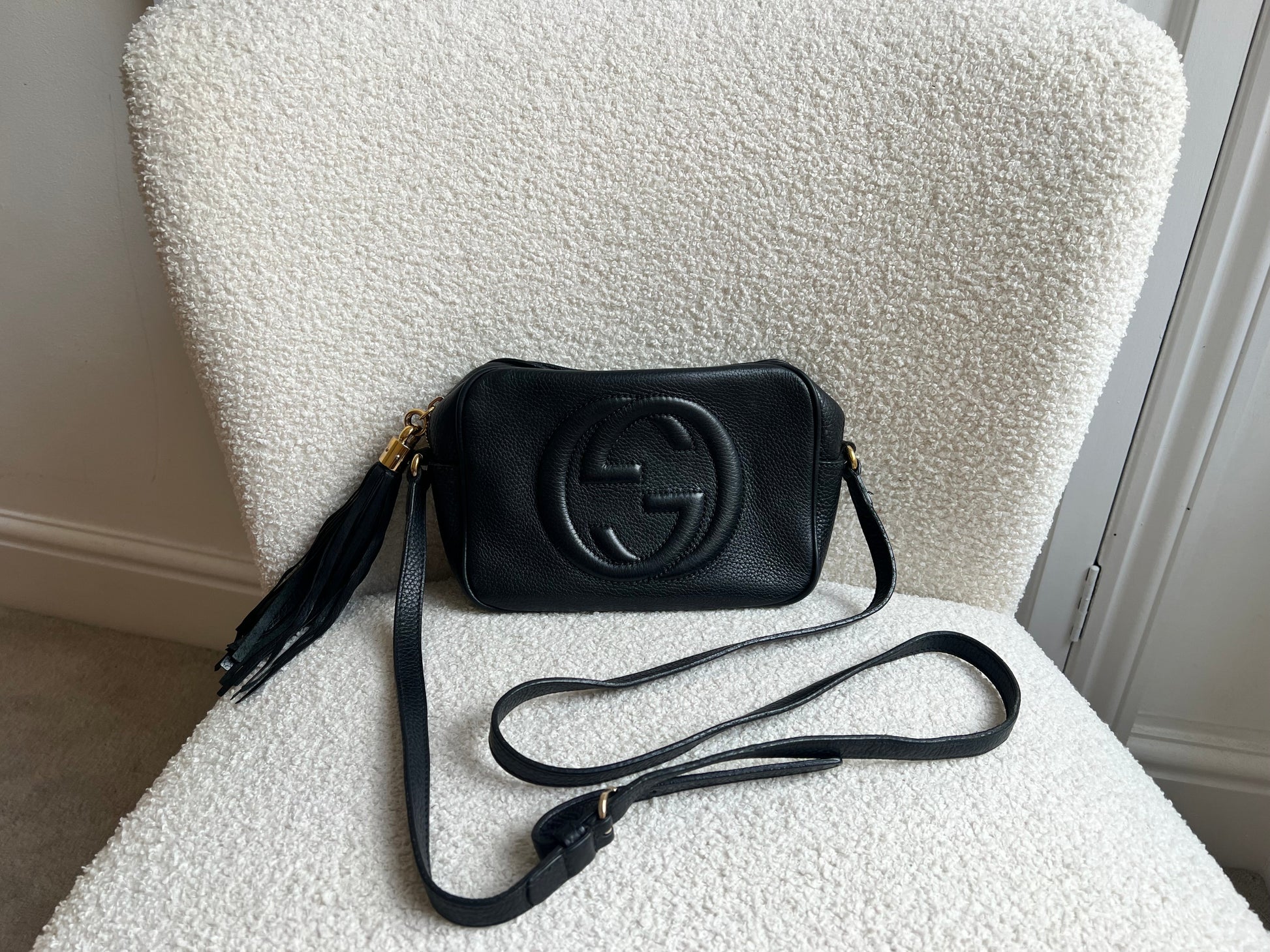 Gucci Soho Disco in Black Leather with pale gold hardware. This practical, cross body, camera style bag is compact in size but still fits a reasonable amount. Can be worn over shoulder or cross body. Gucci's most popular style and goes with any outfit, dressed up or down.