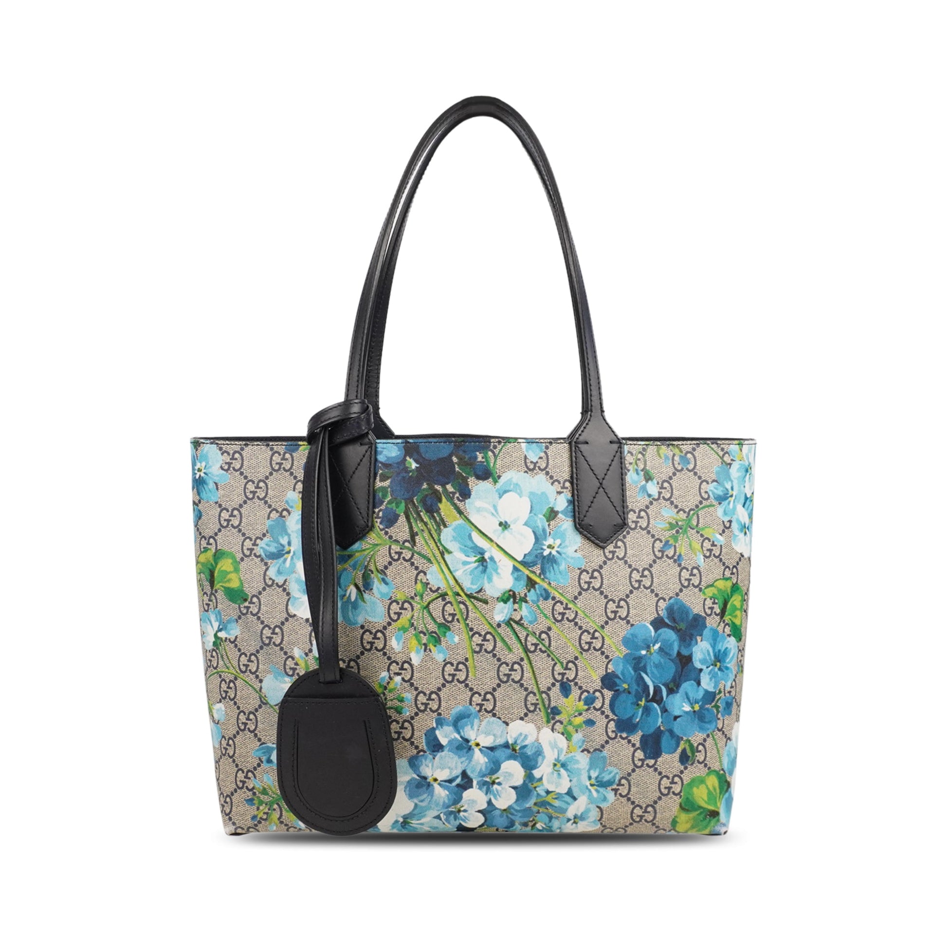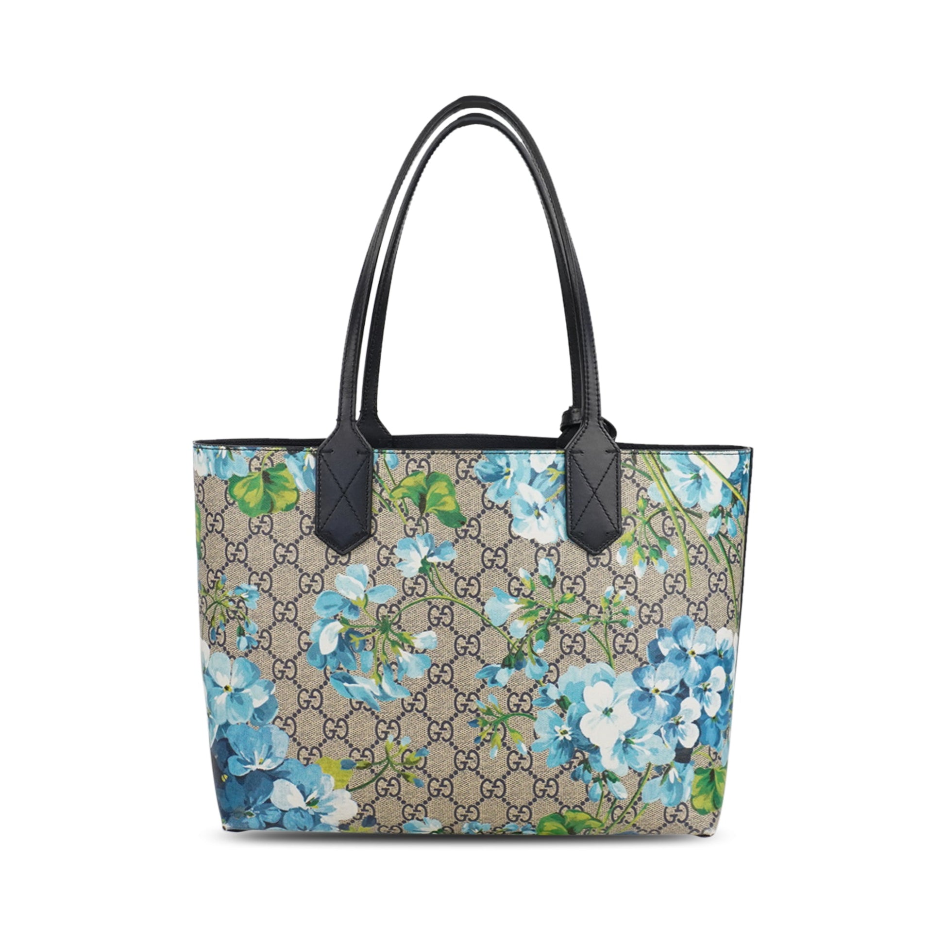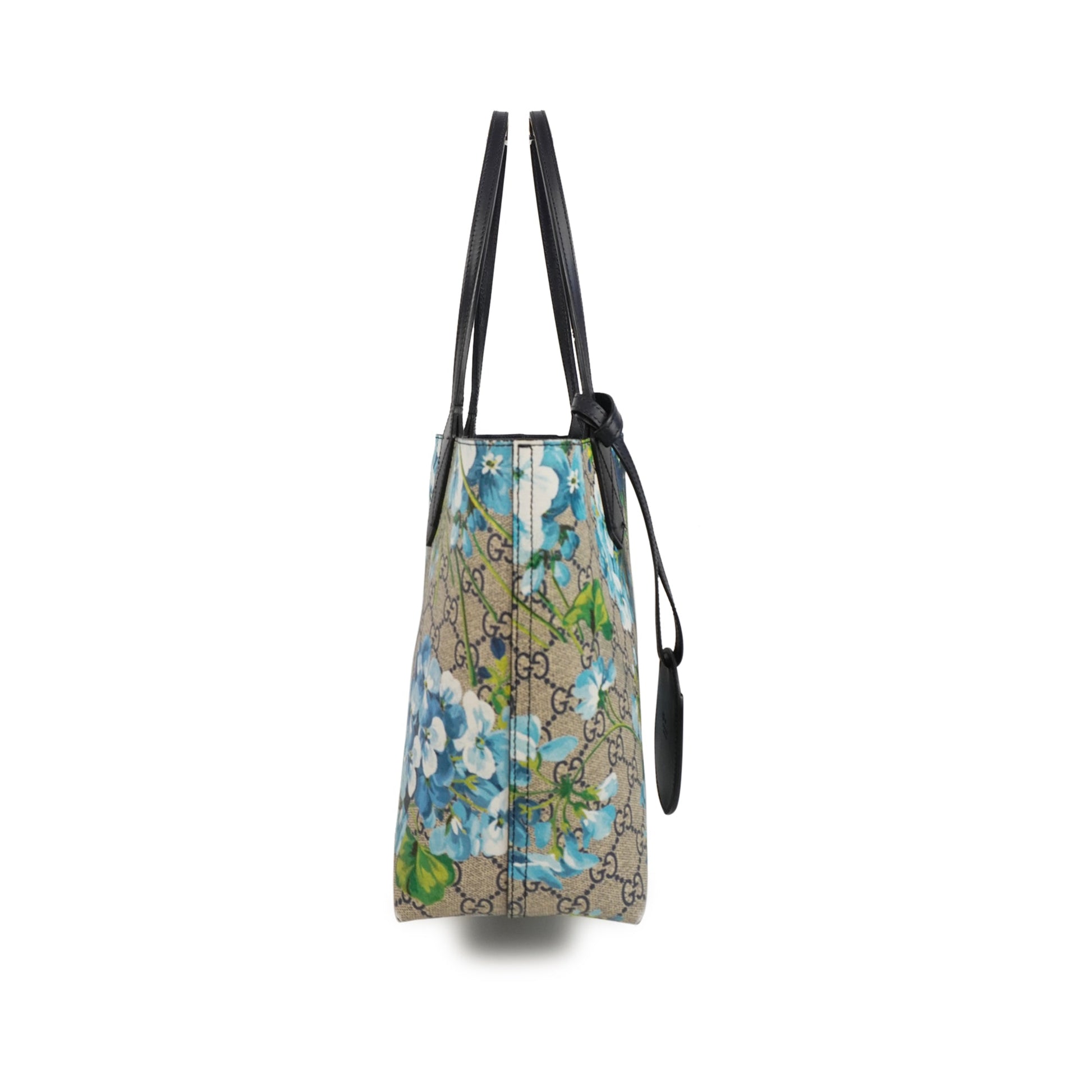 Gucci 'Blooms' small reversible tote bag in beige and navy blue logo monogram coated canvas with blue floral print. Features a navy blue interior that can be reversed to become the exterior, two flat top handles, and a navy blue key tag.