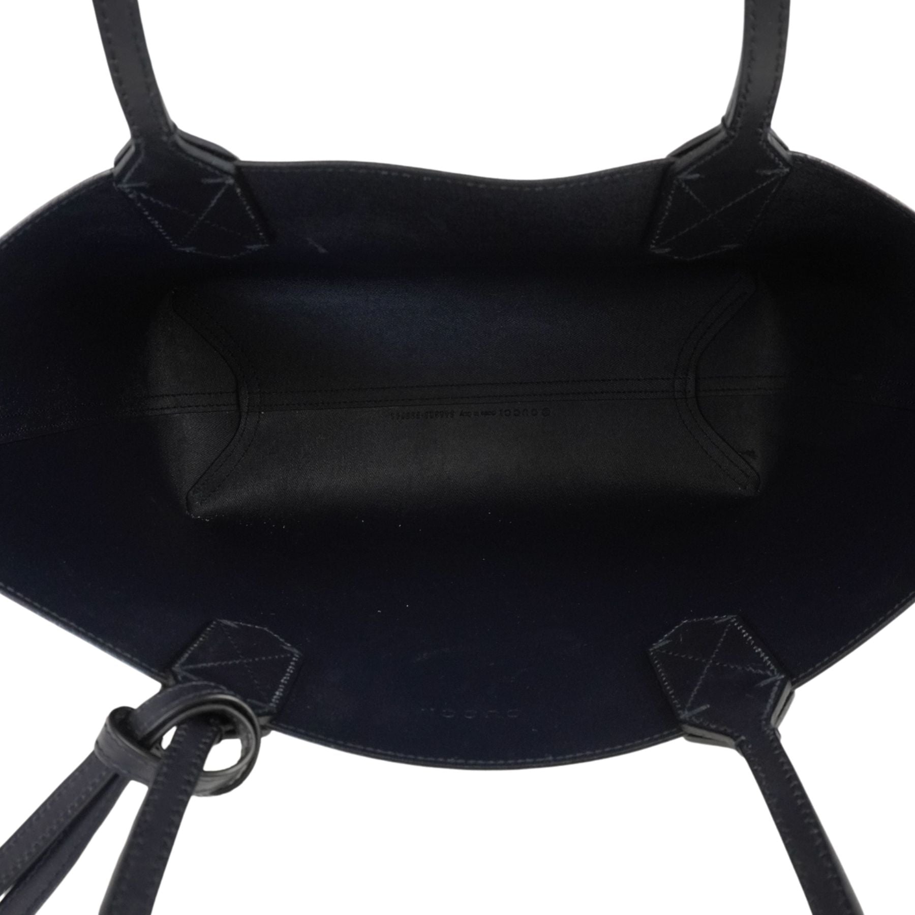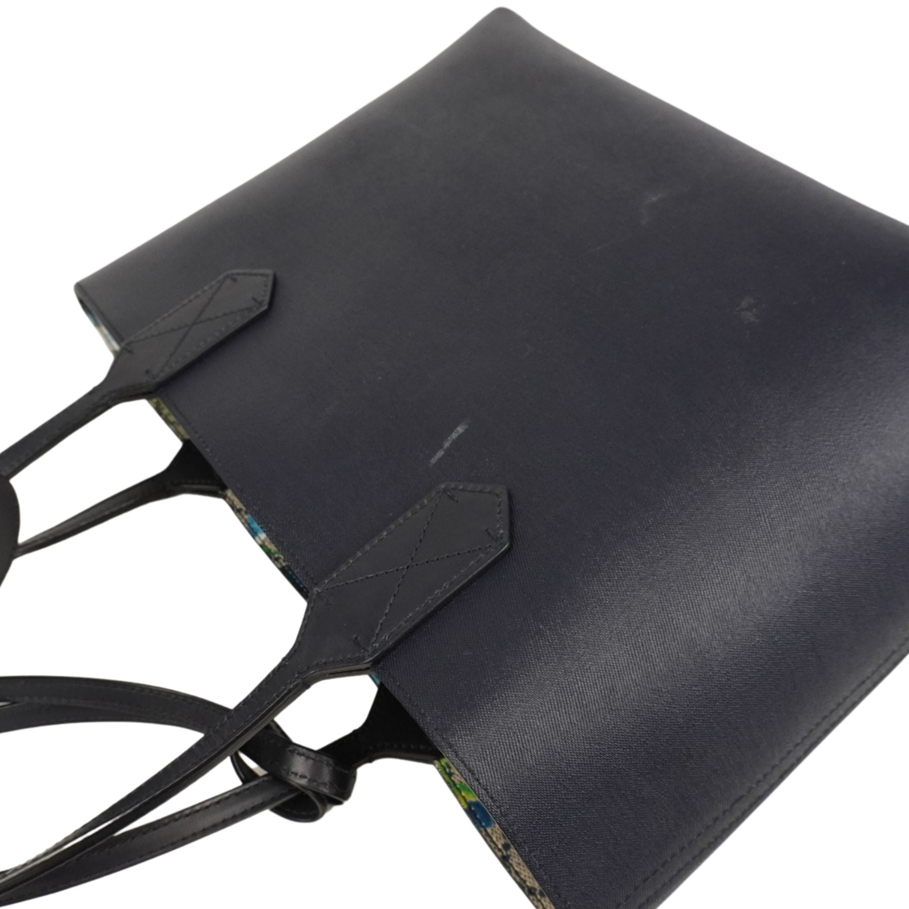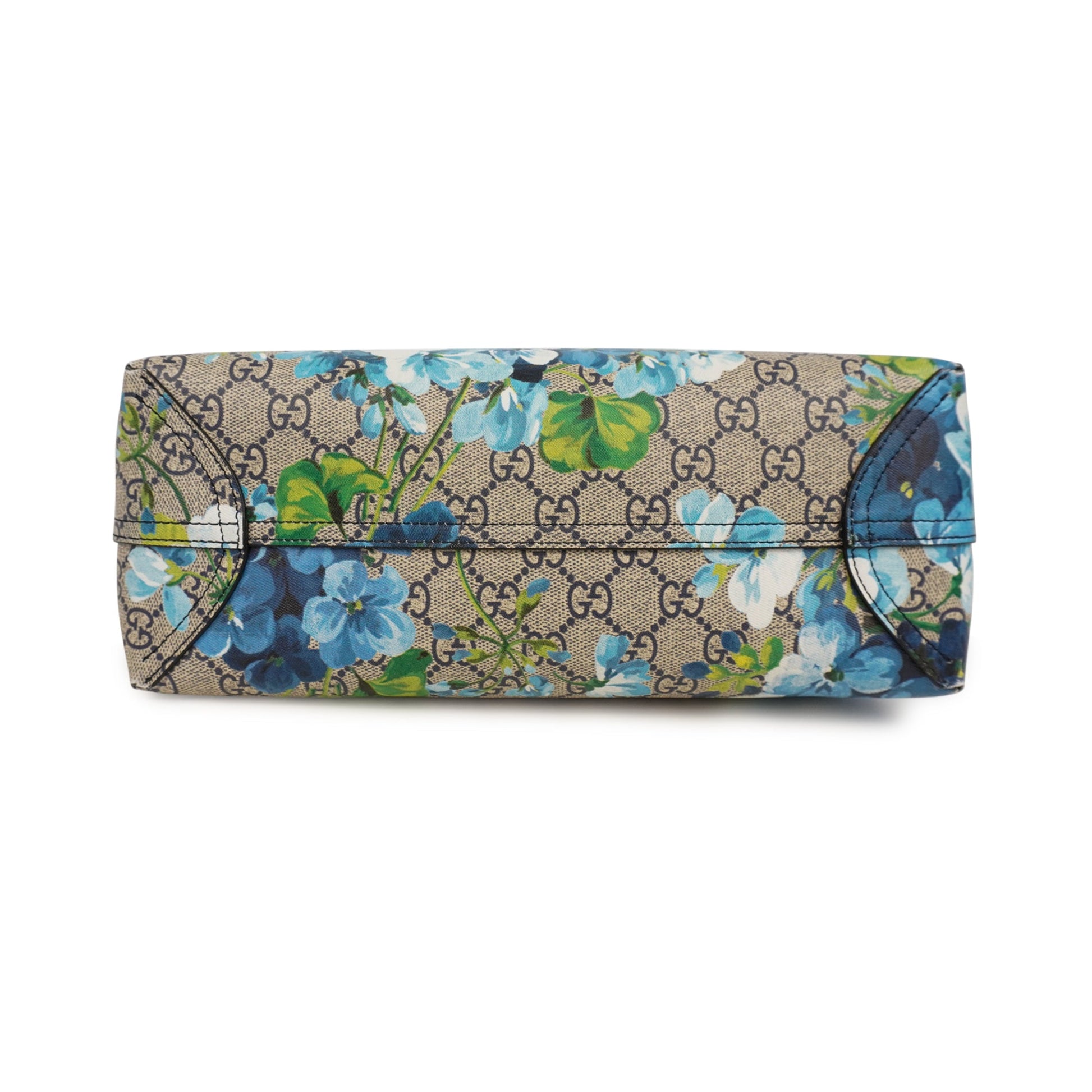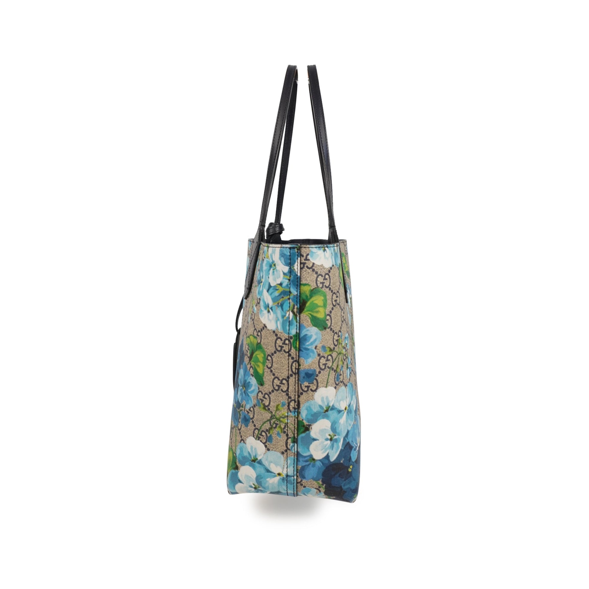 Gucci 'Blooms' small reversible tote bag in beige and navy blue logo monogram coated canvas with blue floral print. Features a navy blue interior that can be reversed to become the exterior, two flat top handles, and a navy blue key tag.