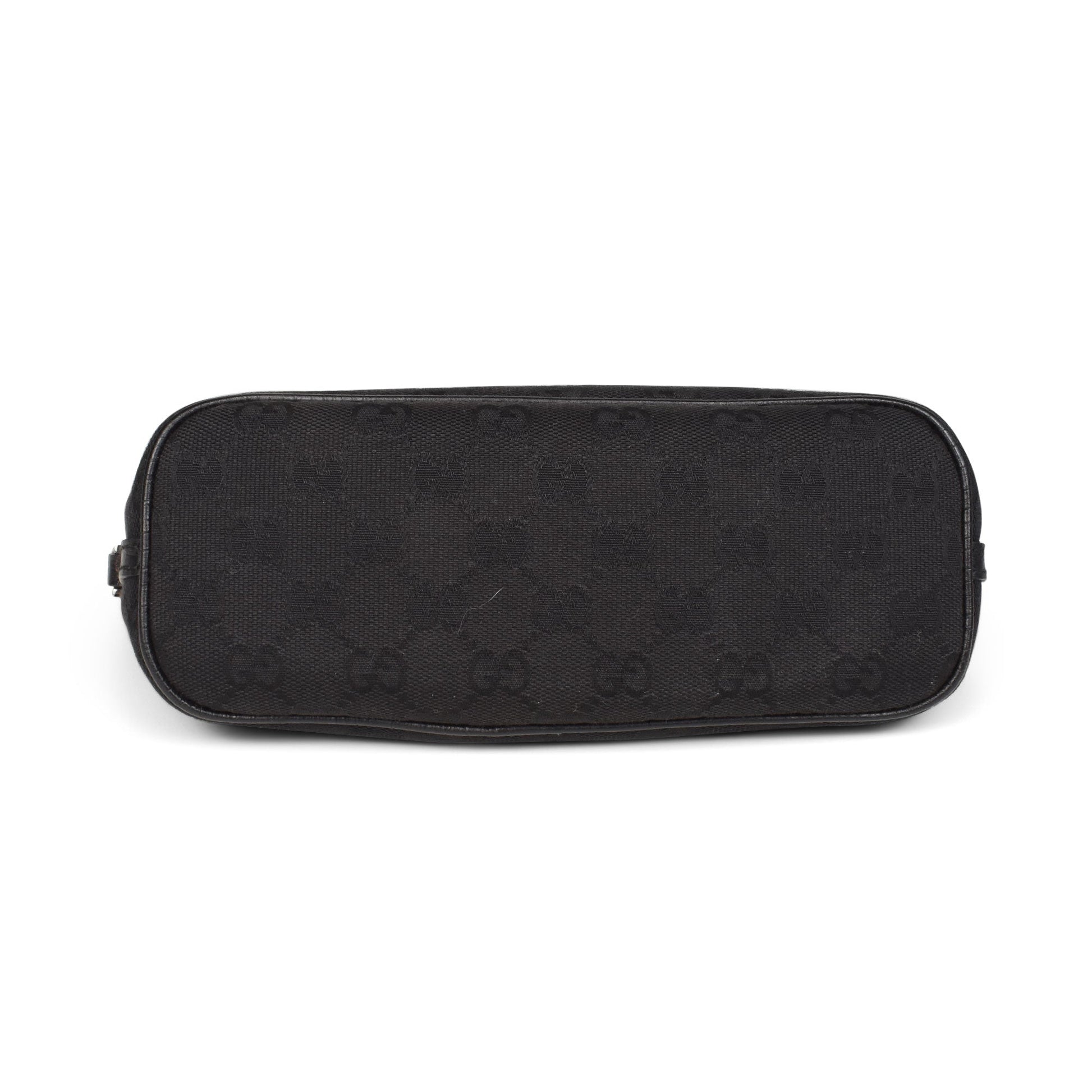 Gucci 'Boat Pochette' shoulder bag in black guccissima monogram printed coated canvas with black leather trim, a shoulder strap, a top zip opening in black hardware, and a canvas lined interior.