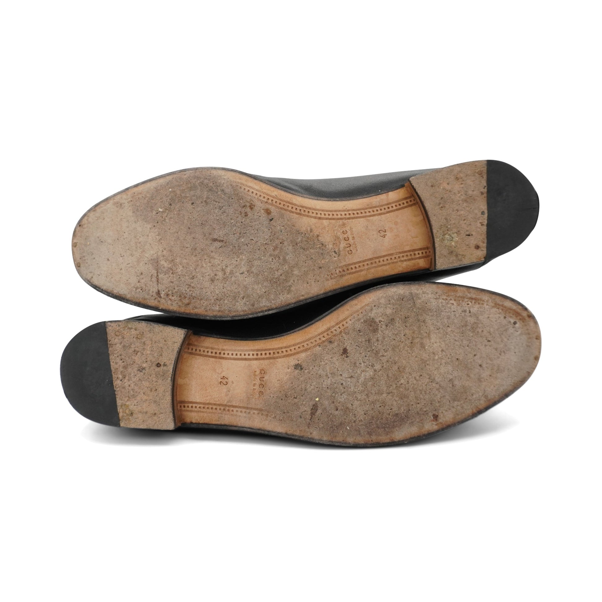 Gucci 'Brixton' loafers in black leather with a gold horsebit buckle detail and a foldable crush-back heel.