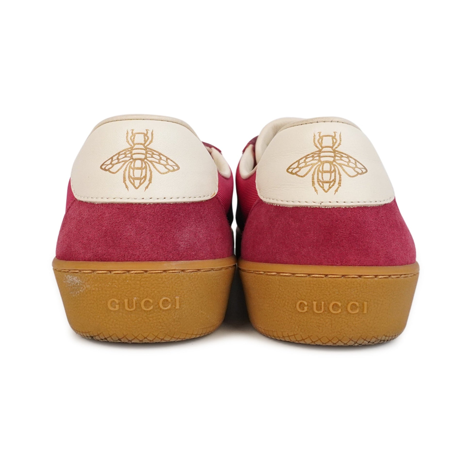 Gucci ‘G74 Web’ low-top sneakers in pink canvas with pink suede detailing. Features red and blue canvas racing stripes on the sides, cream heel caps with gold bee, cream interior lining, beige flat laces with a gold and brass hardware logo charm, gum soles, and white cotton logo label on the tongues.