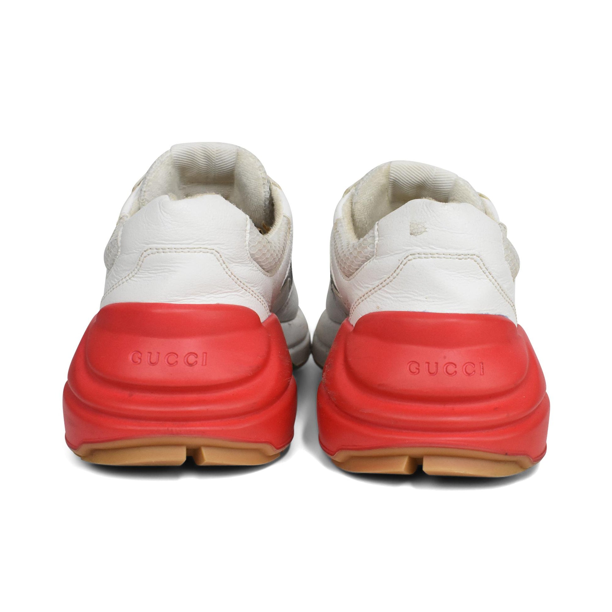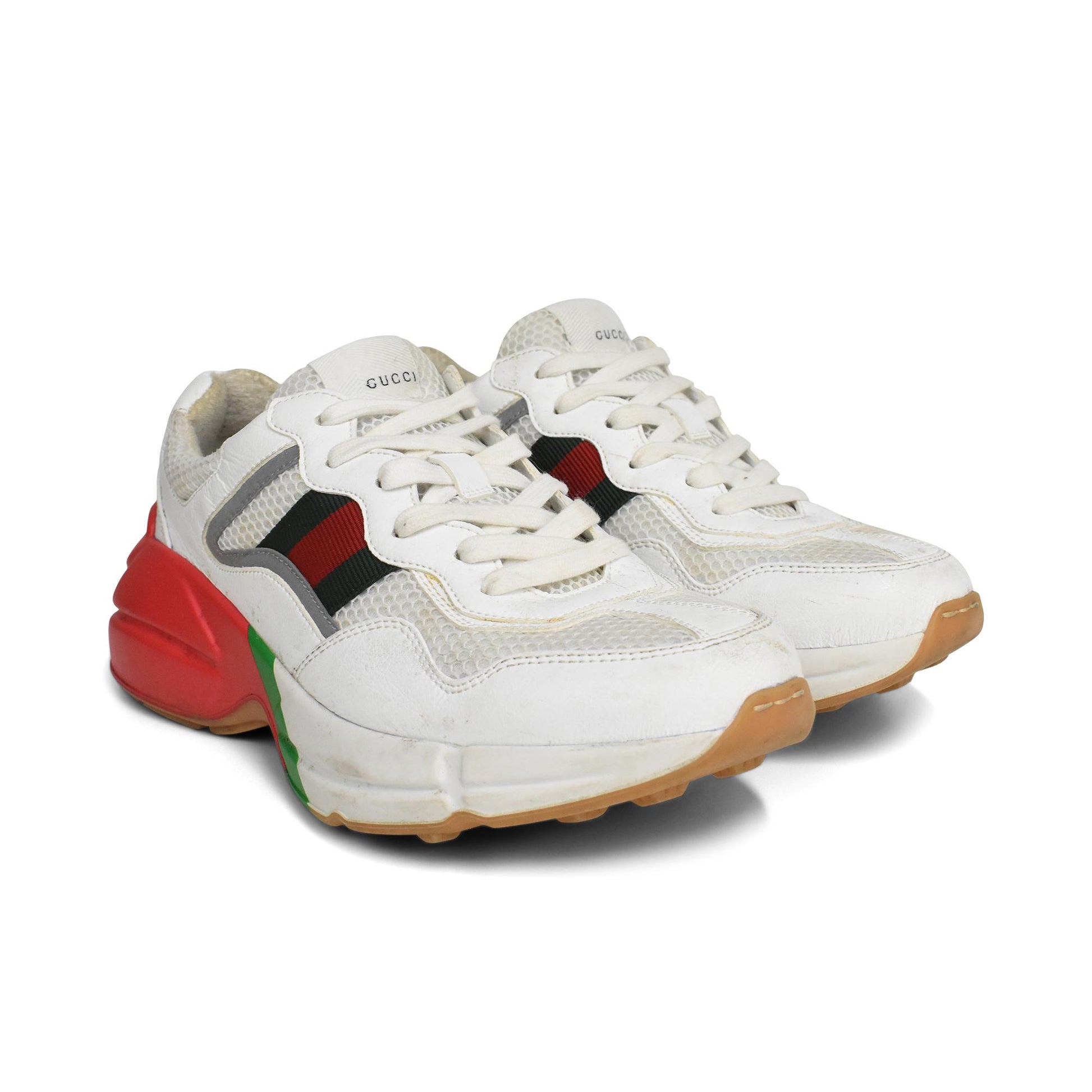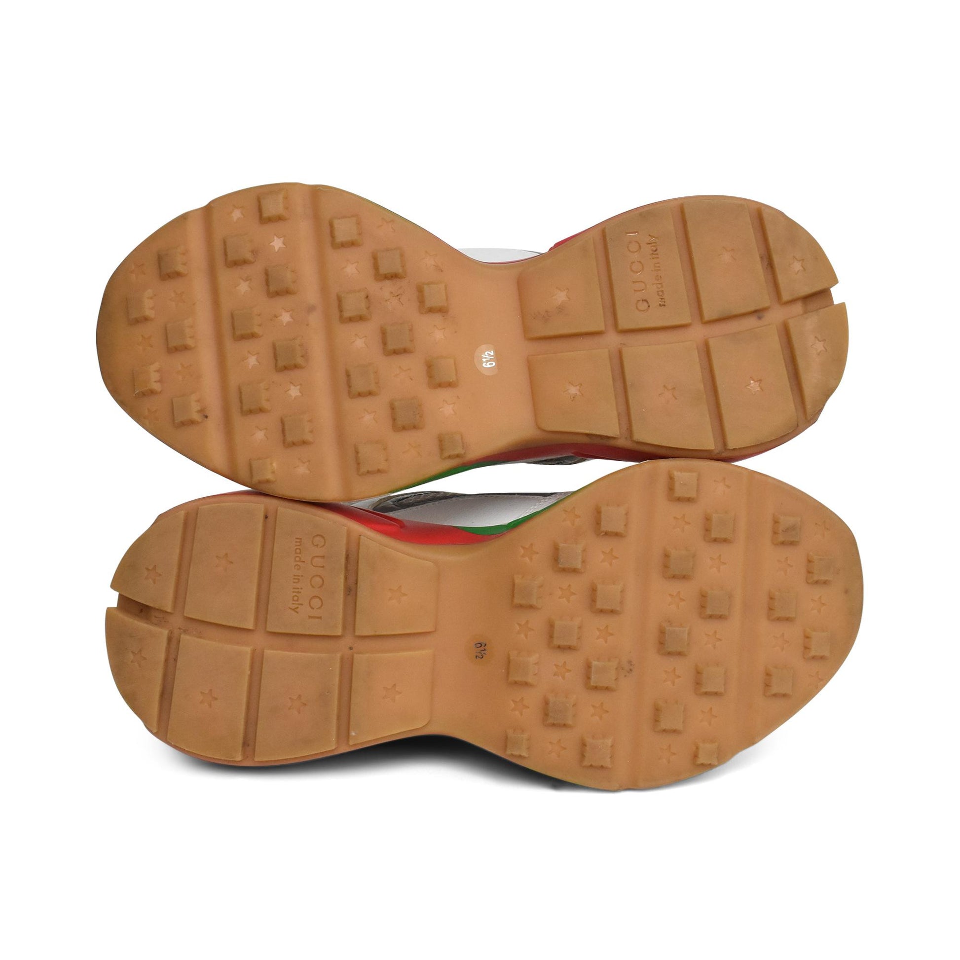 Gucci chunky low-top sneakers in white mesh and leather with red and green chunky sole. Features red and green racing stripe on the sides, a gum under sole, and 3M reflective detail on the sides.
