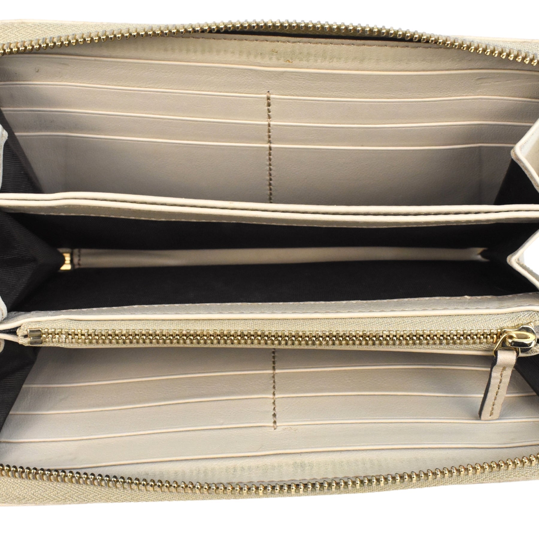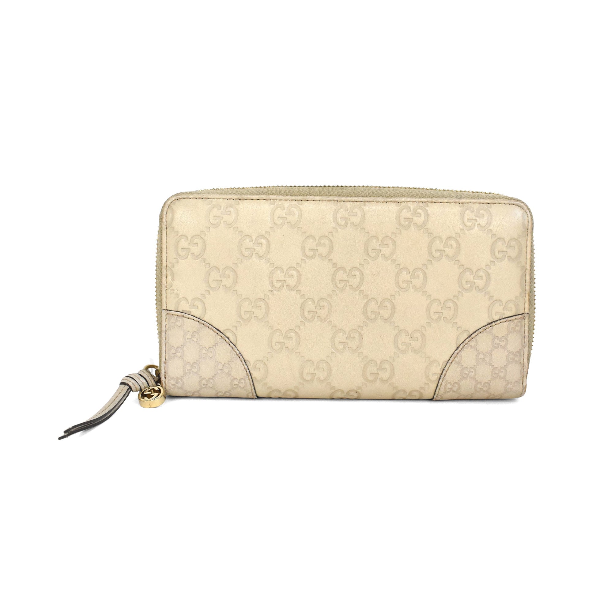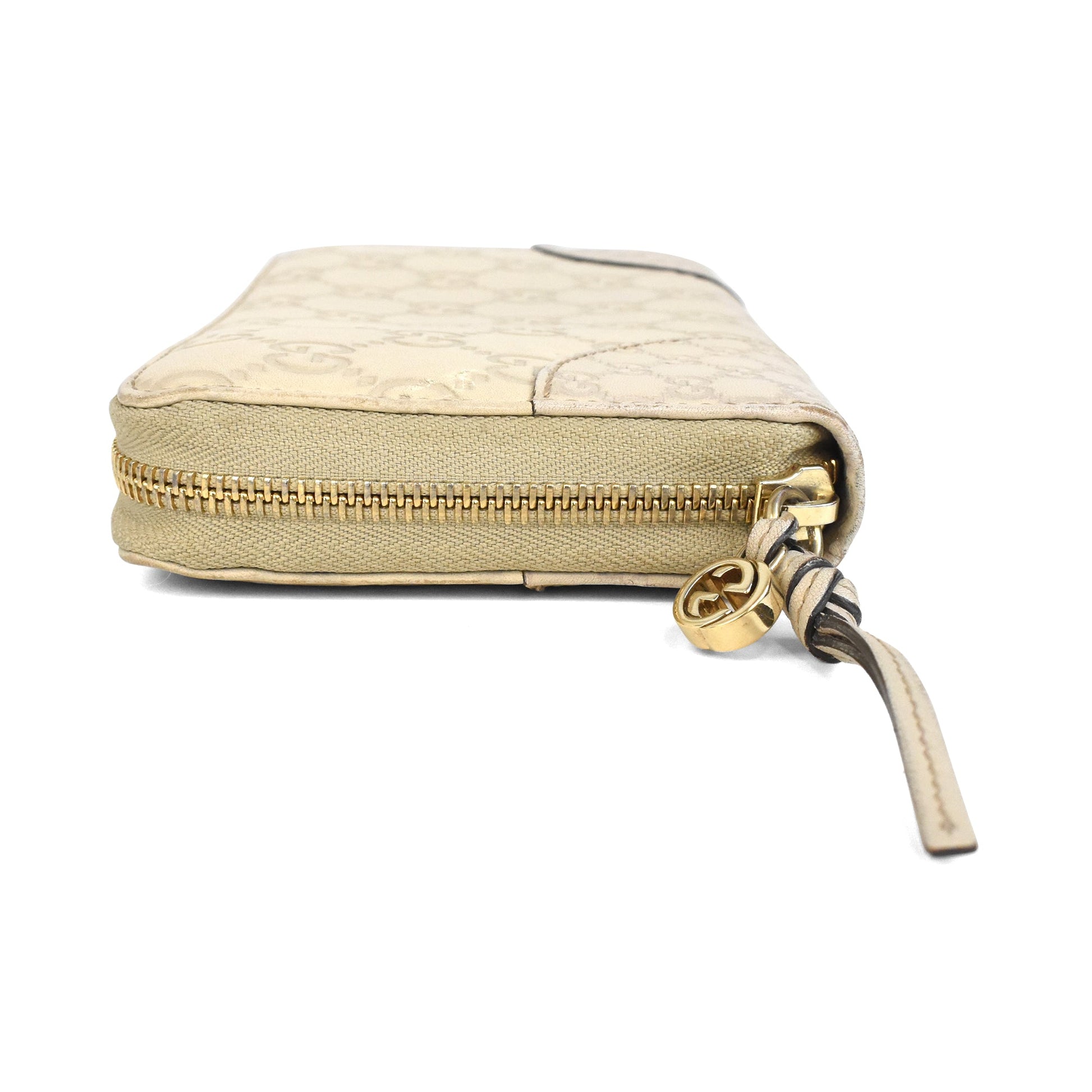Gucci continental zip around wallet in cream monogram embossed Guccissima leather with soft gold hardware. Features micro Guccissima corner panels and an interlocking GG charm on the zipper pull. The accordion style interior is partially leather lined and has 12 card slots, 3 slip pockets, and a zip pocket.