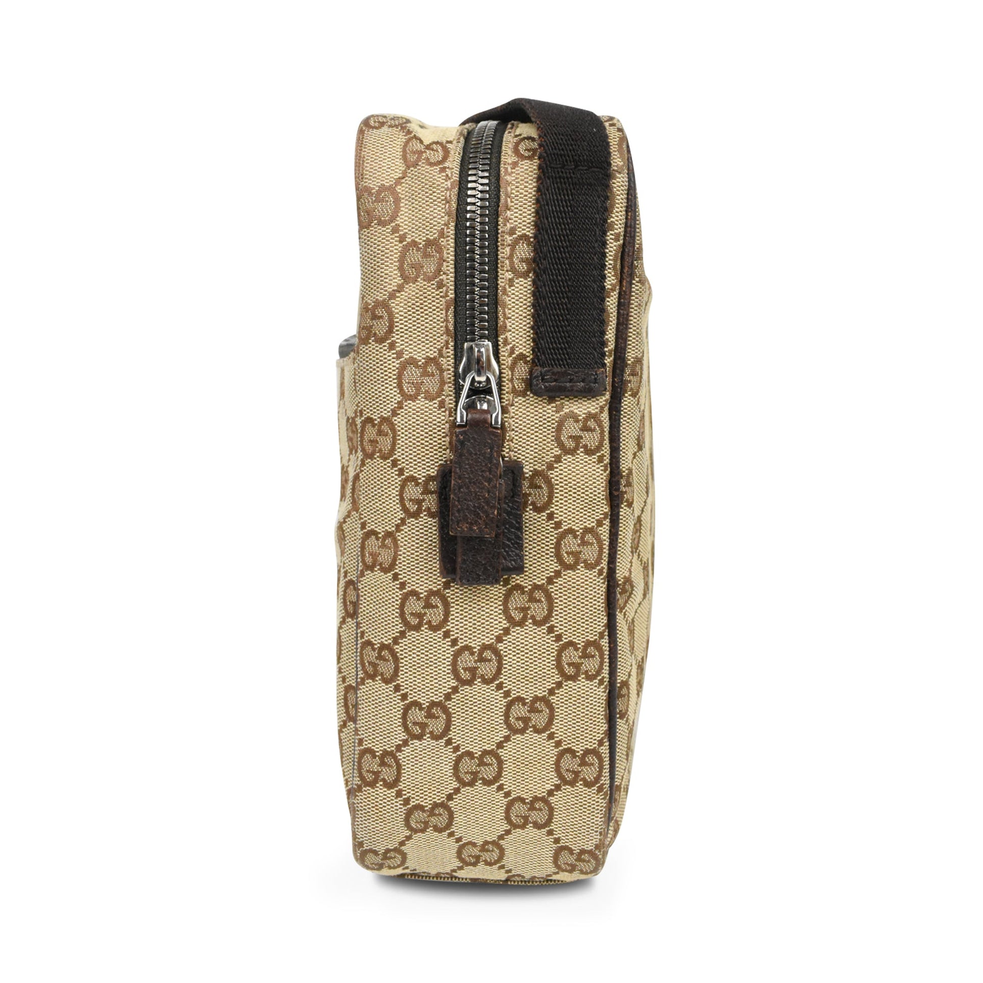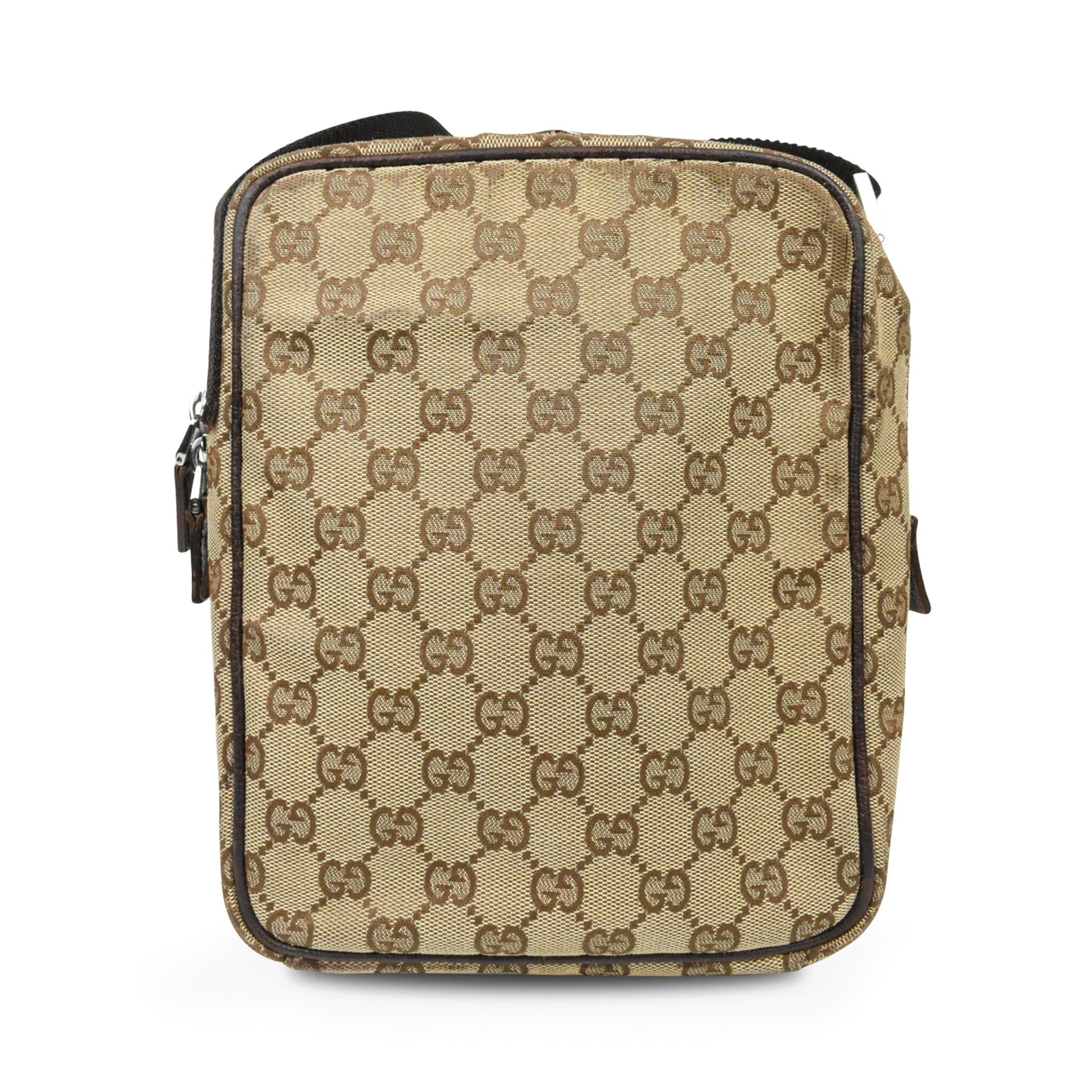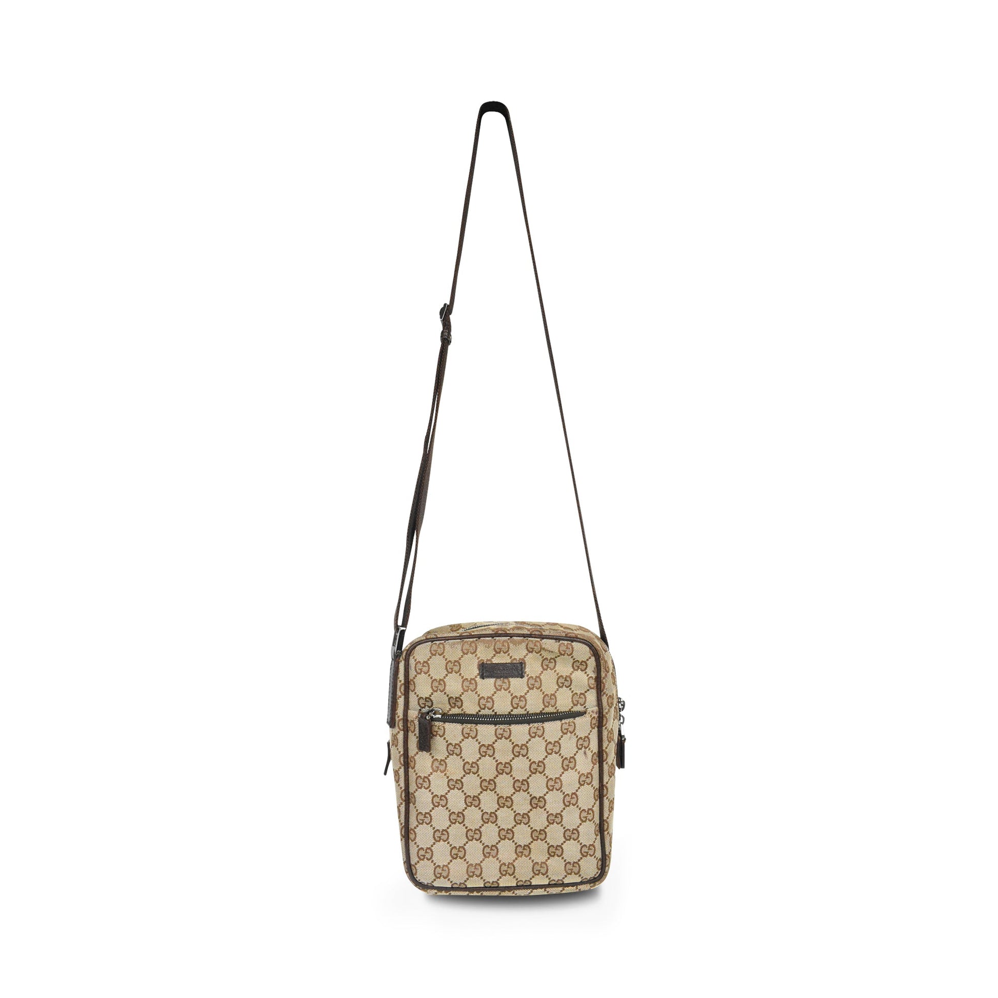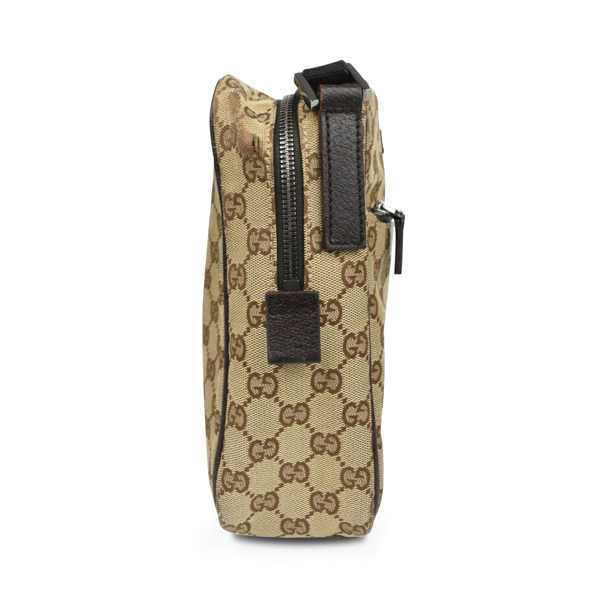 Gucci crossbody bag in brown monogram printed canvas with brown leather trim, an adjustable canvas crossbody strap, a front zip pocket, and a top zip opening in silver hardware.