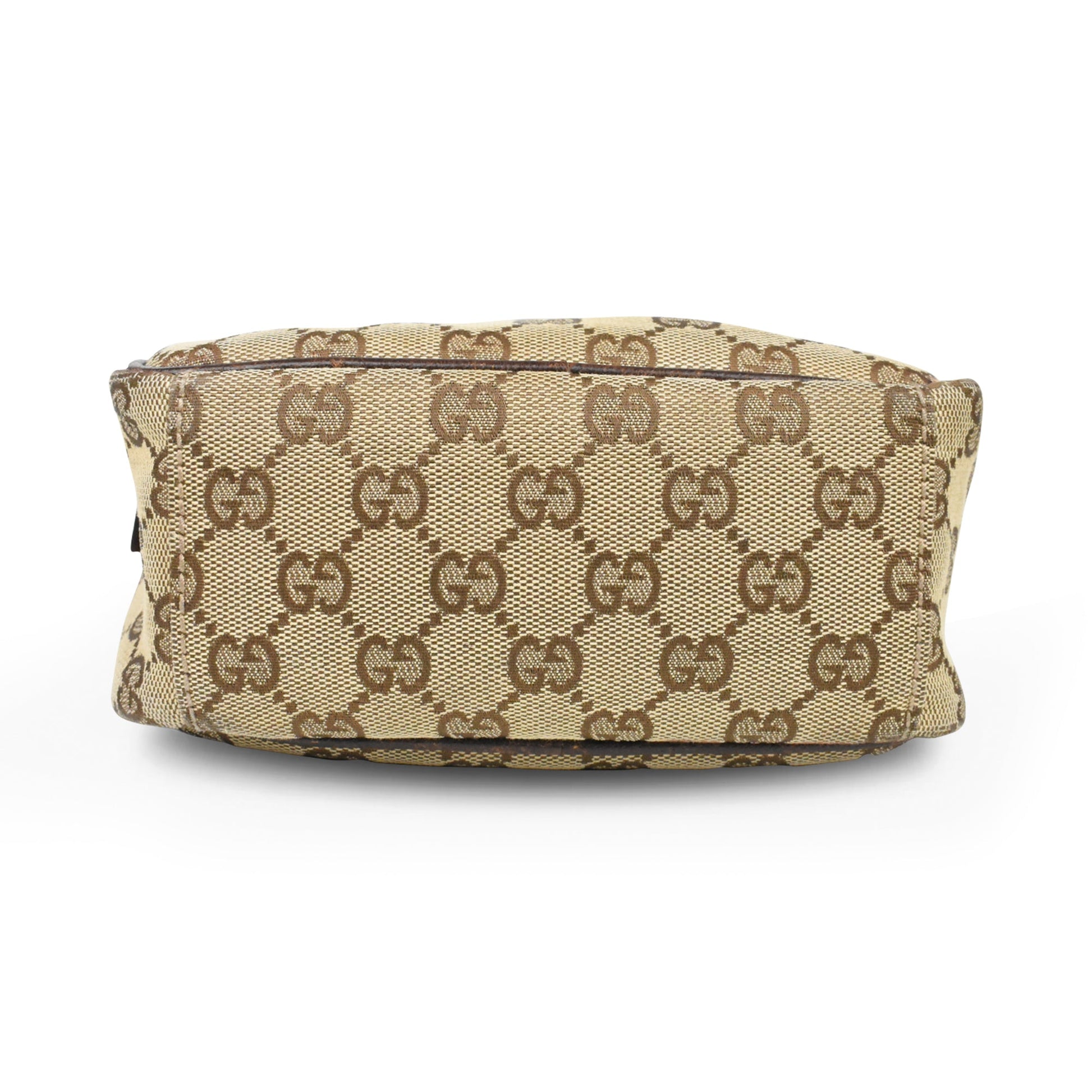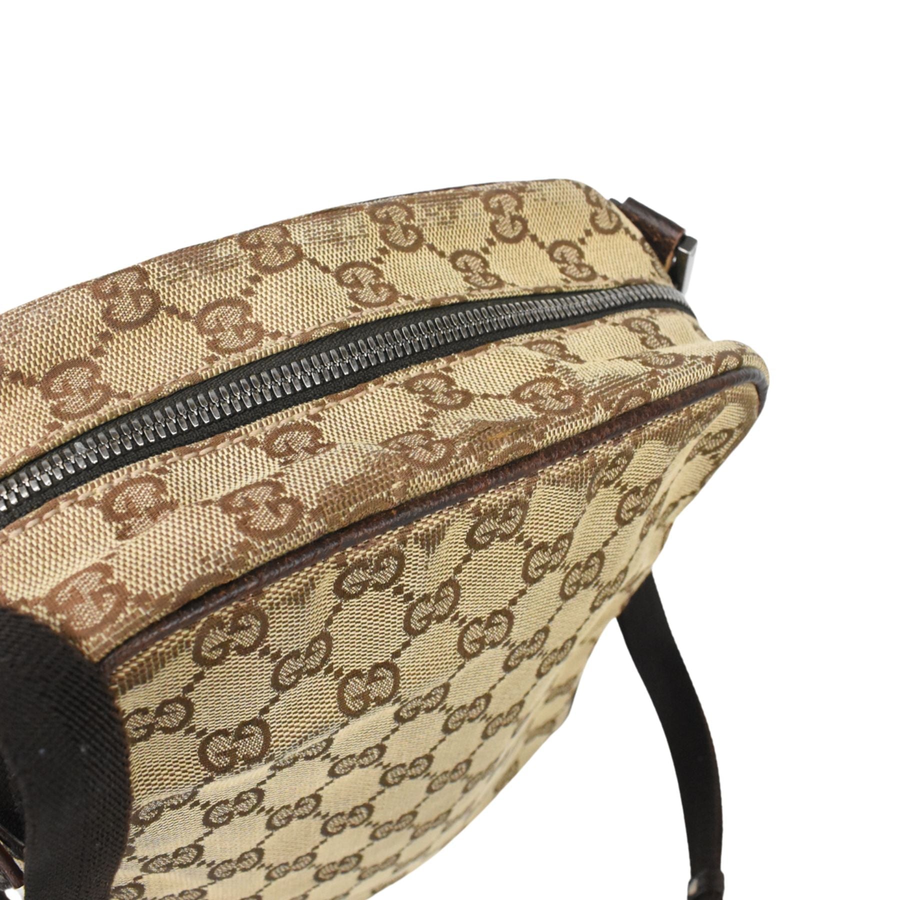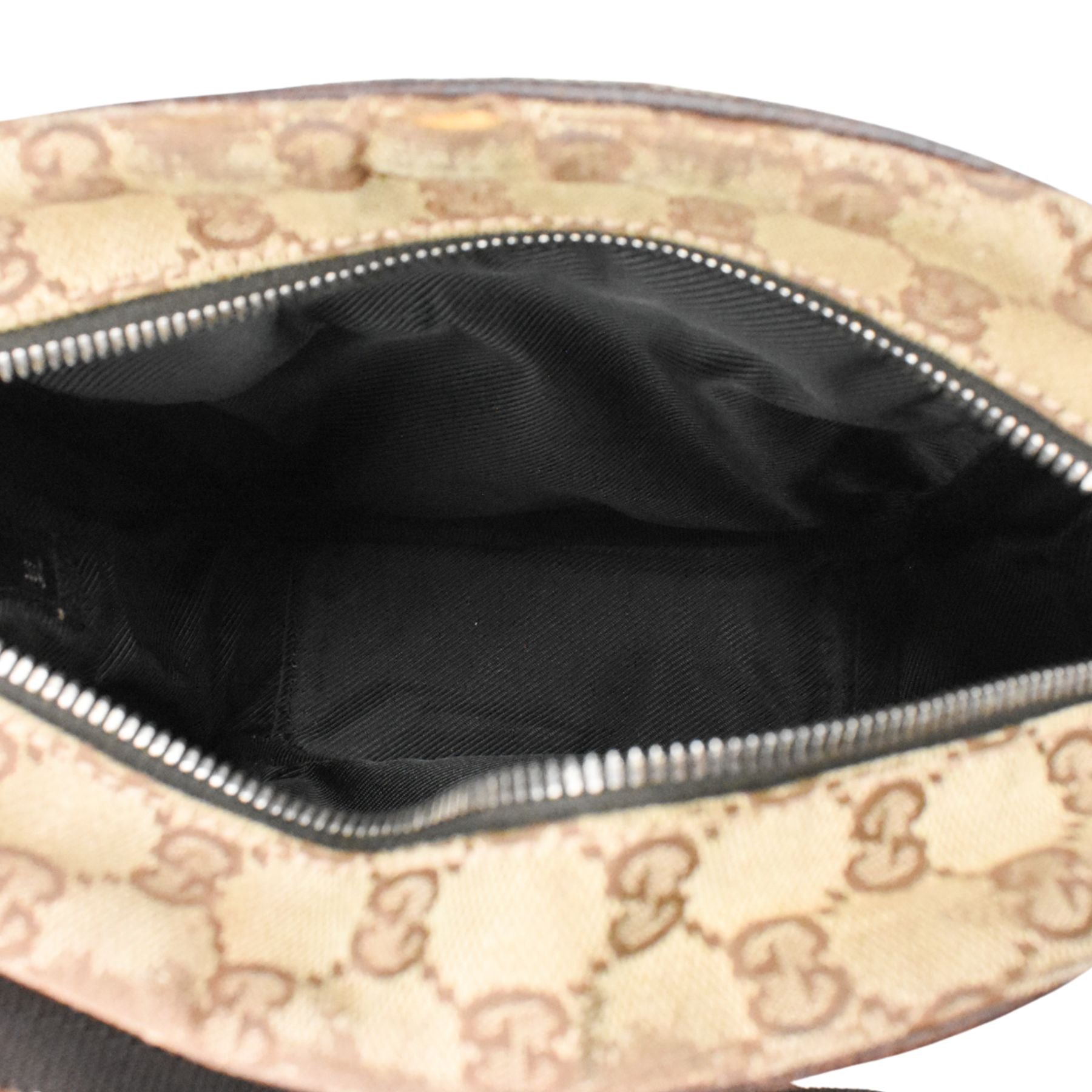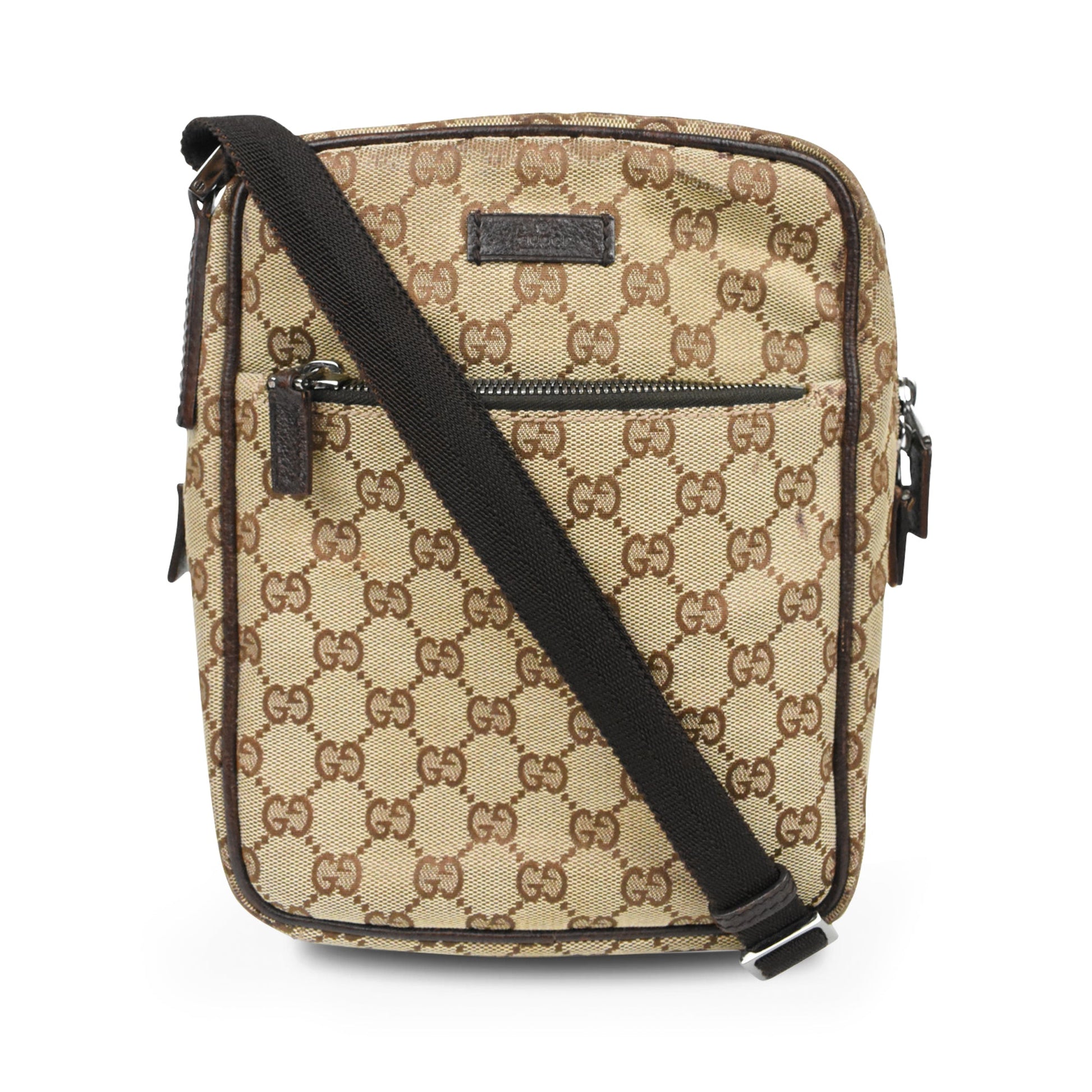 Gucci crossbody bag in brown monogram printed canvas with brown leather trim, an adjustable canvas crossbody strap, a front zip pocket, and a top zip opening in silver hardware.