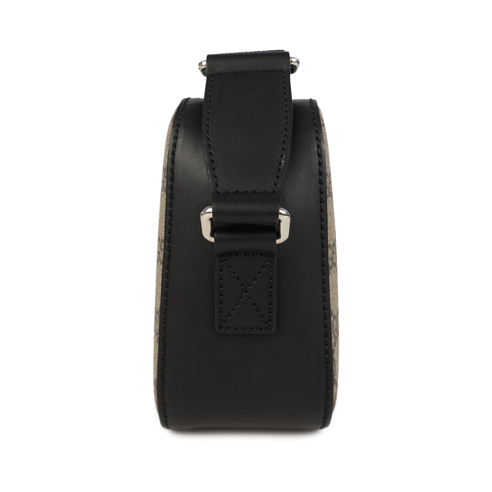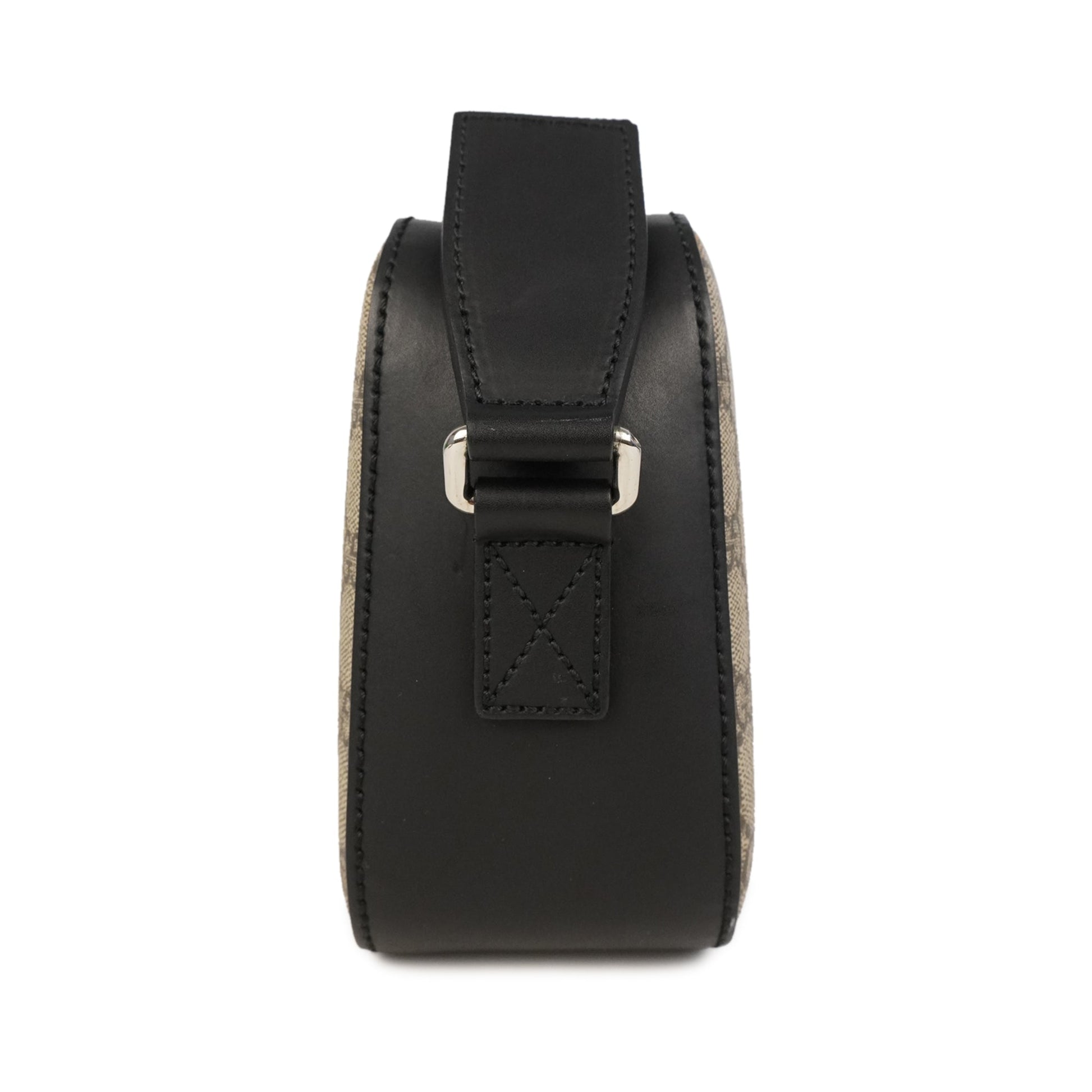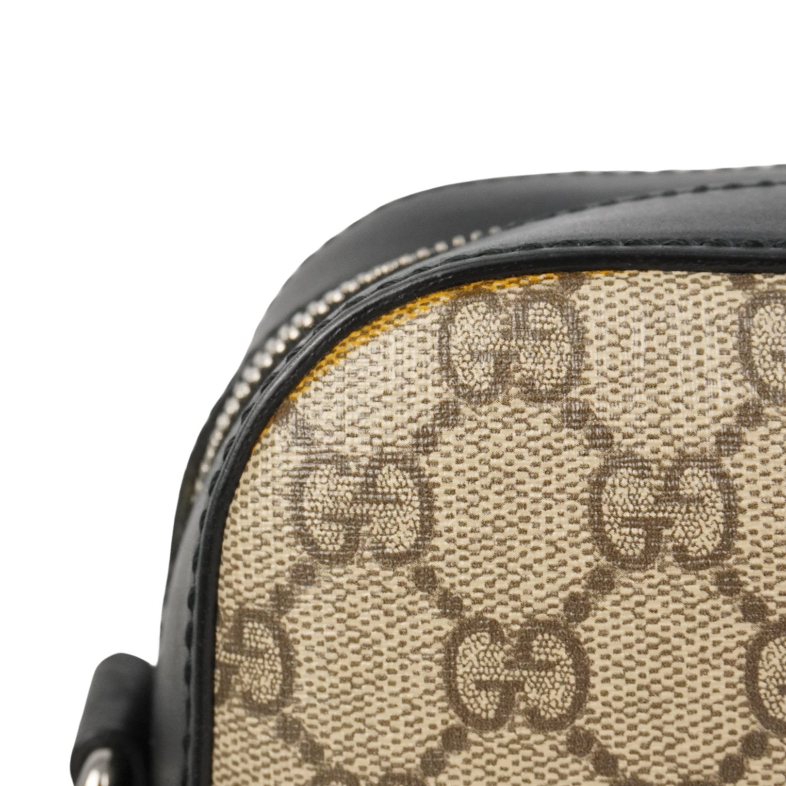 Gucci crossbody camera bag in beige 'GG' monogram coated canvas with black leather trim around the perimeter. Features a black leather logo patch on the front, a black canvas adjustable crossbody strap with a leather shoulder pad, and a zip closure in silver hardware. The interior is grey suede lined with 2 card pockets and a zip pocket.