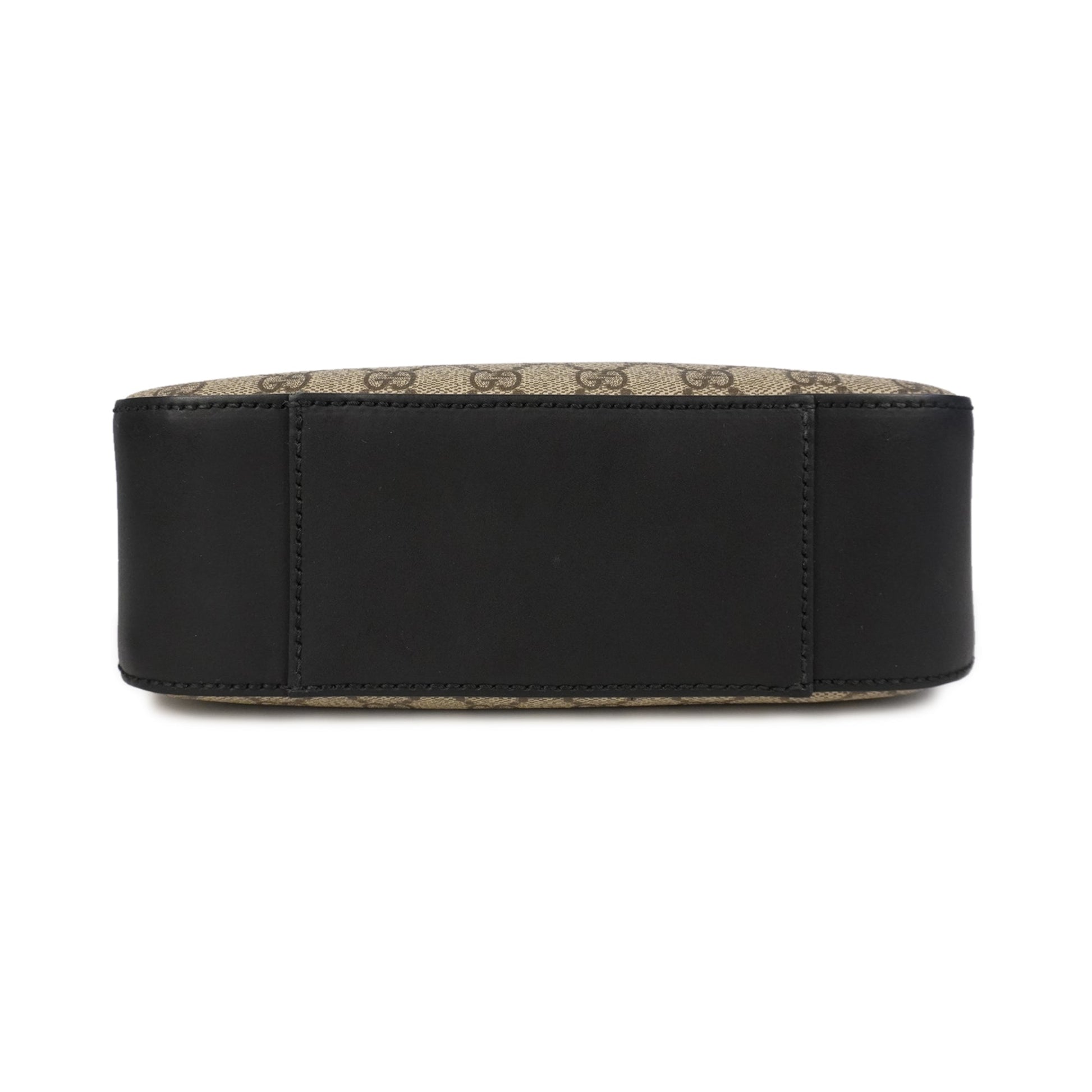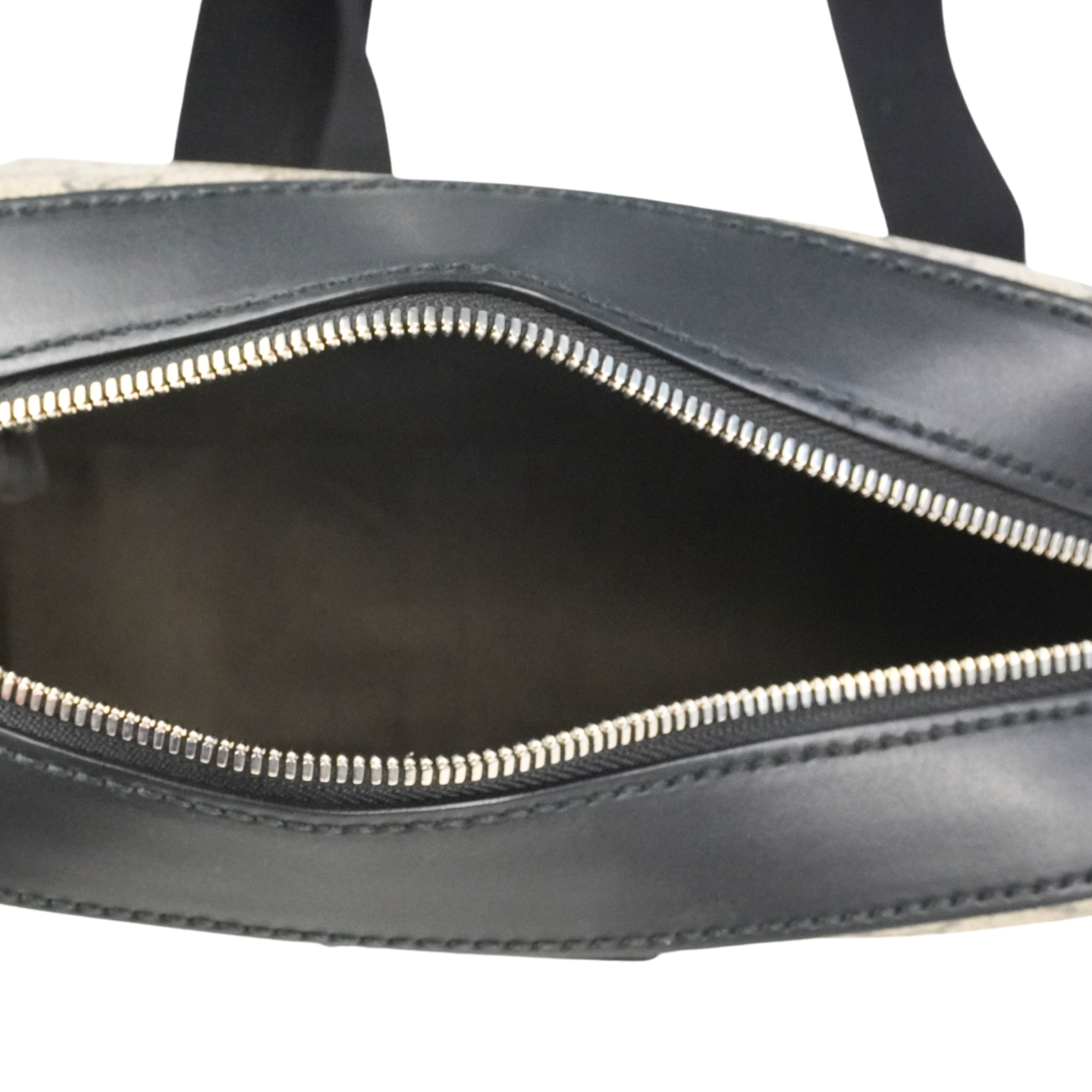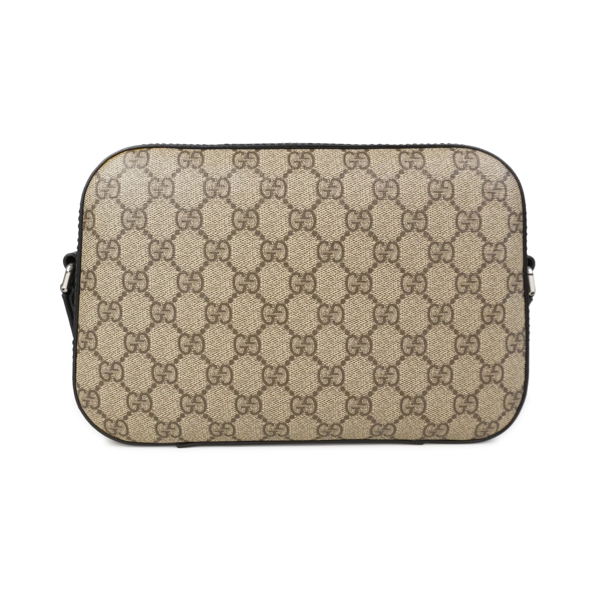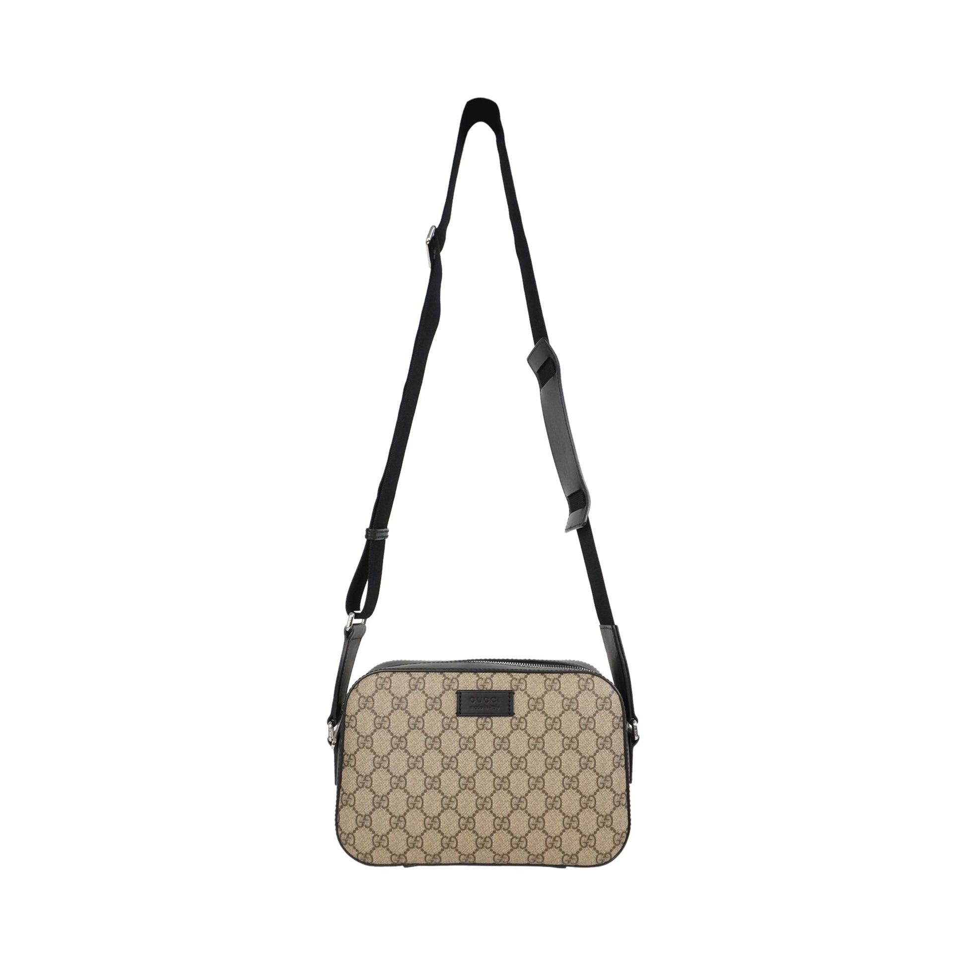 Gucci crossbody camera bag in beige 'GG' monogram coated canvas with black leather trim around the perimeter. Features a black leather logo patch on the front, a black canvas adjustable crossbody strap with a leather shoulder pad, and a zip closure in silver hardware. The interior is grey suede lined with 2 card pockets and a zip pocket.