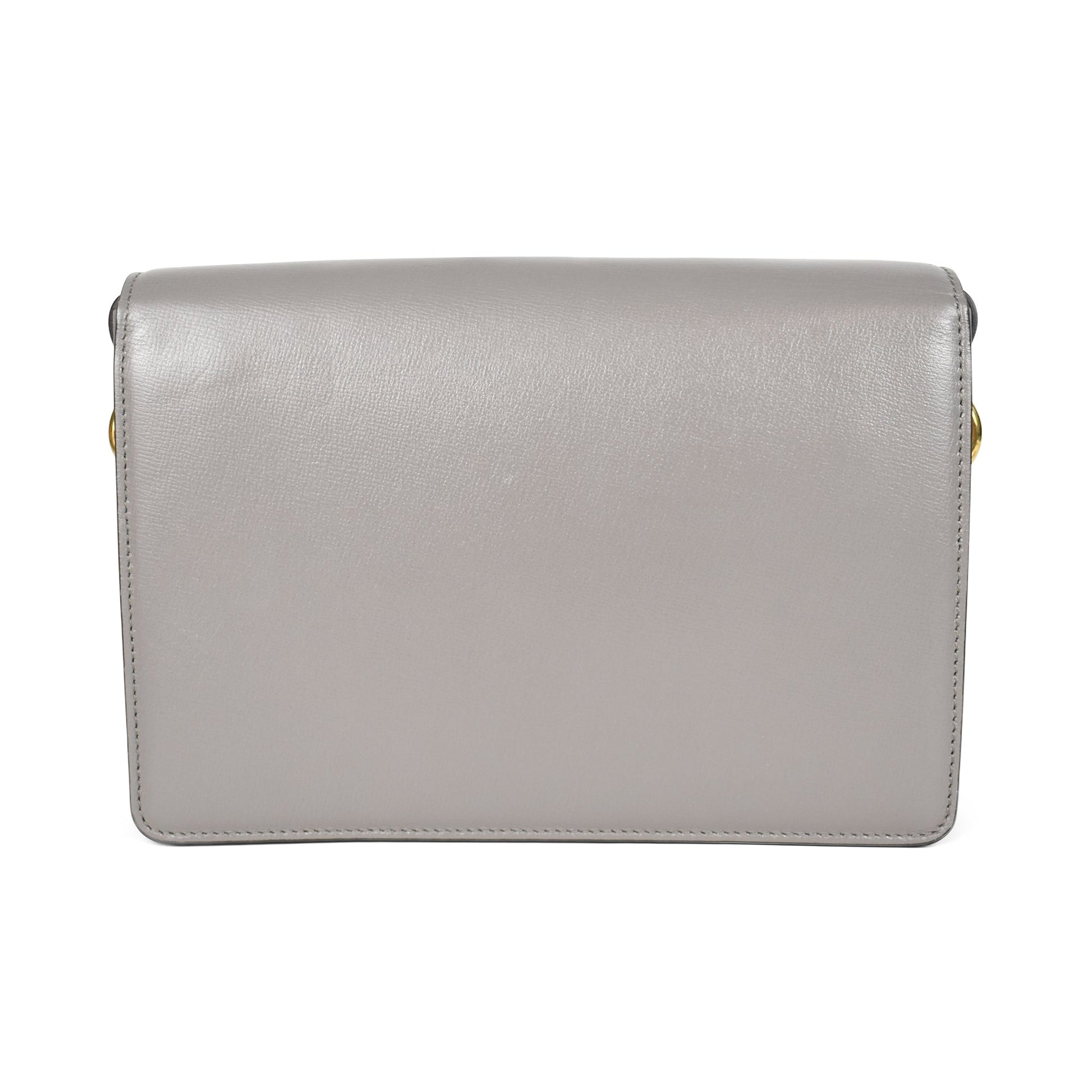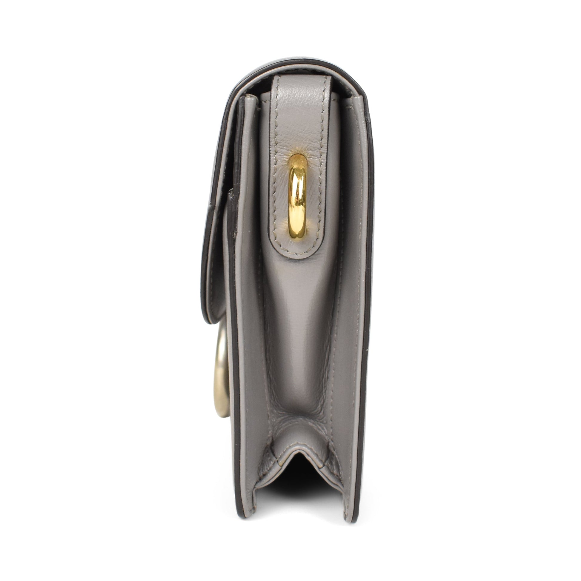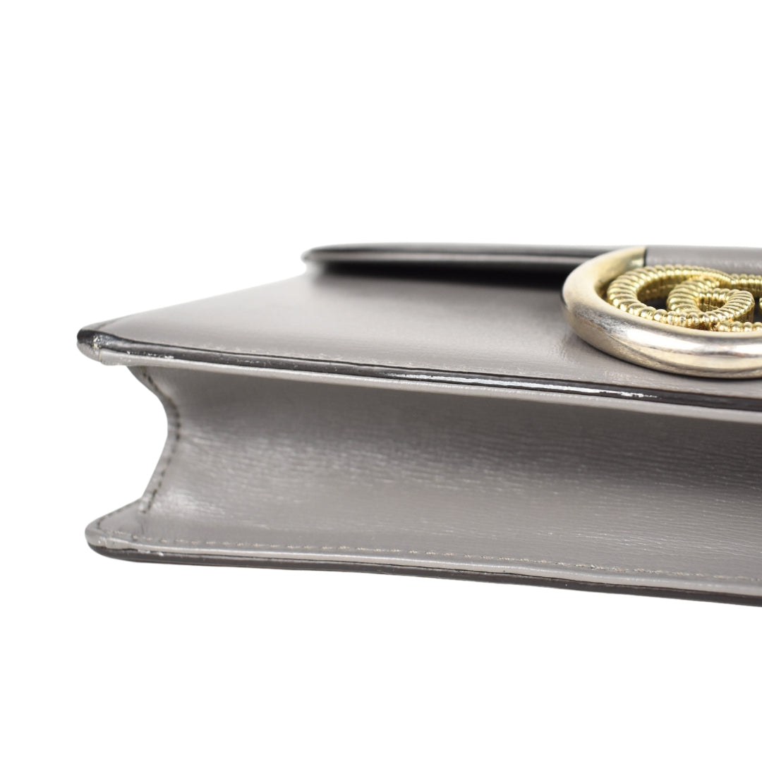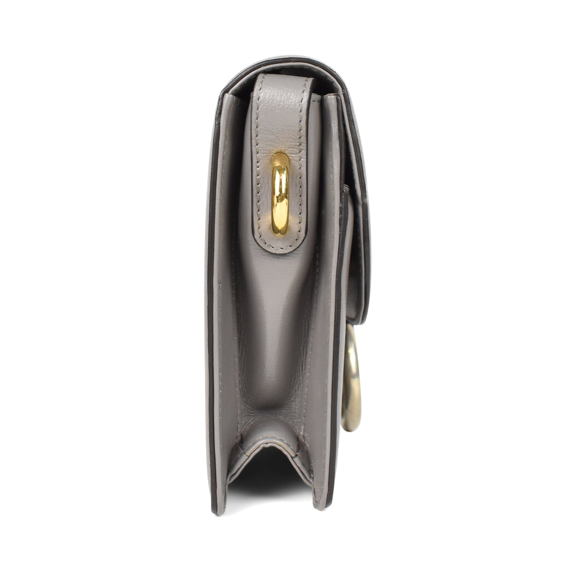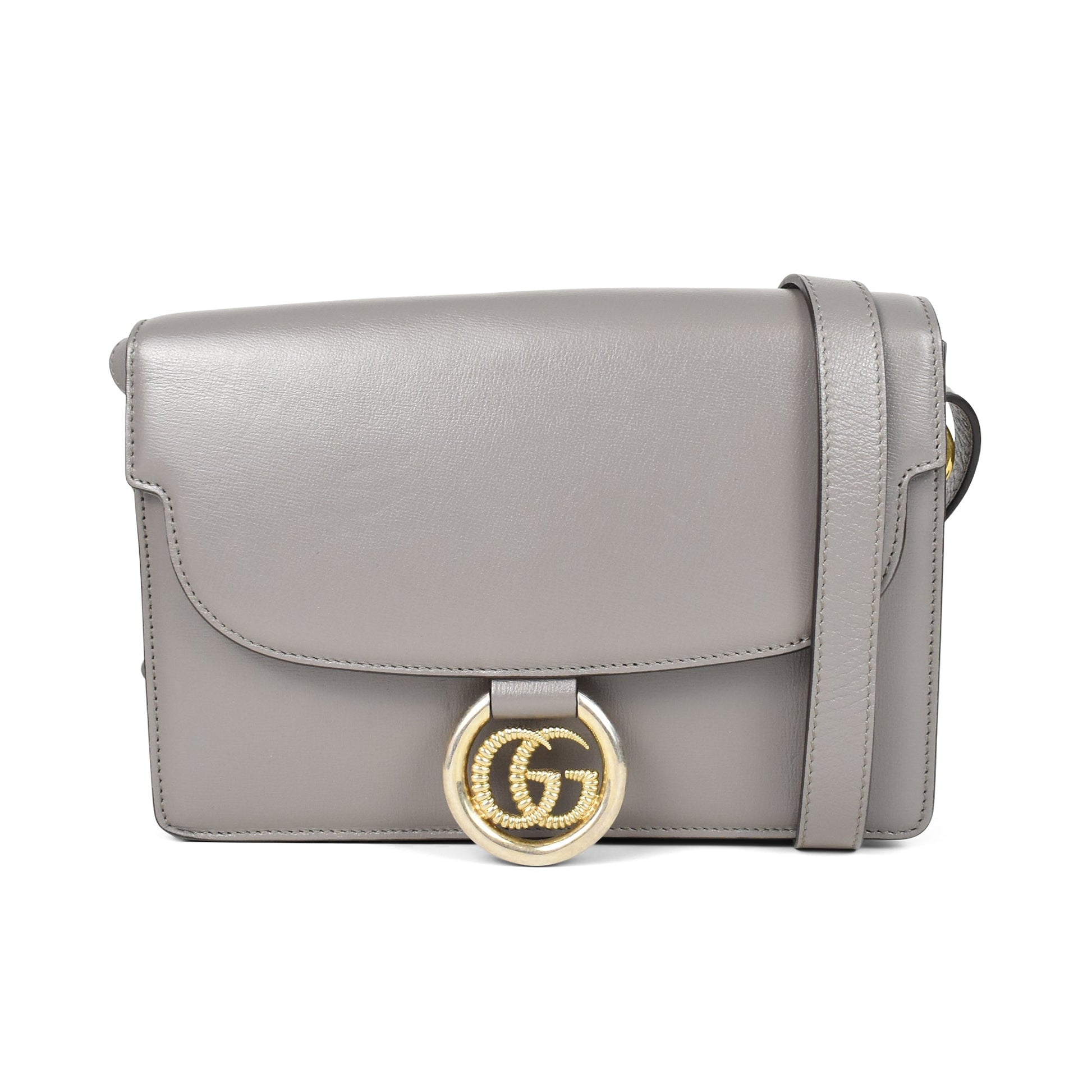 Gucci crossbody bag in grey smooth leather with an adjustable crossbody strap. Features a ribbed 'GG' gold and silver medallion, a top flap magnetic closure, and gold hardware rings on the sides. The interior is purple fabric lined with 2 slip pockets and a zip pocket.