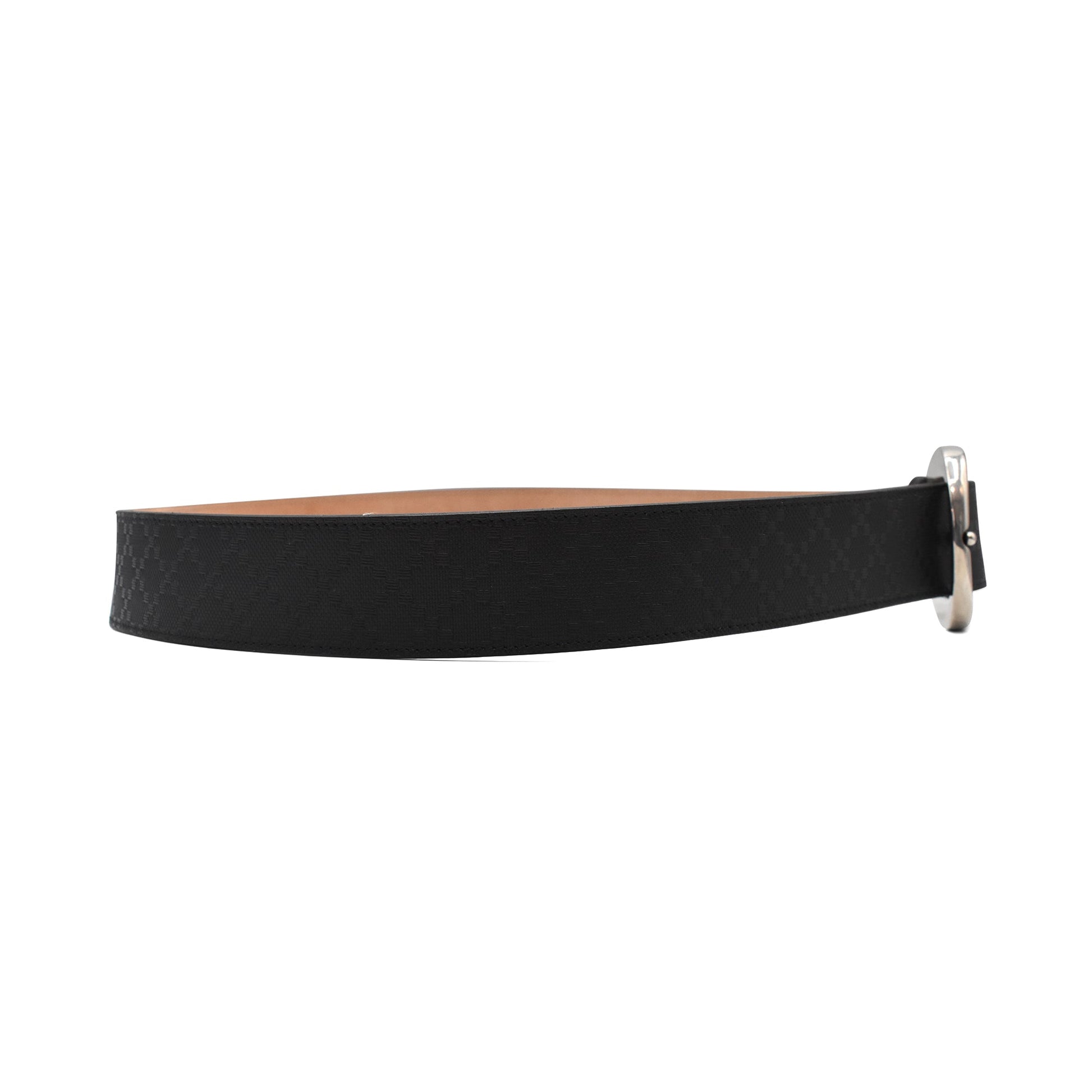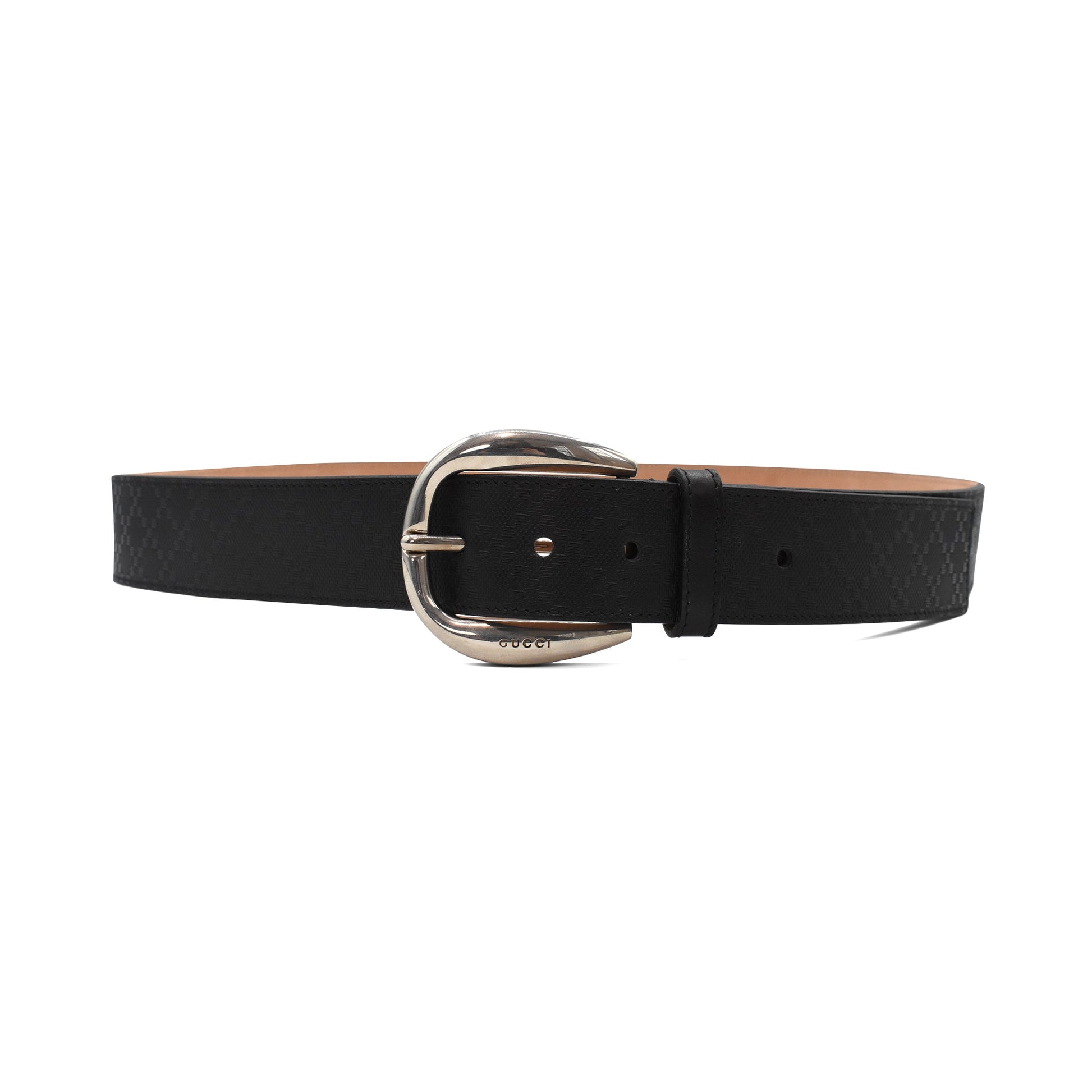 Gucci belt in black leather with all-over diamante print embossing and a large silver pin buckle.