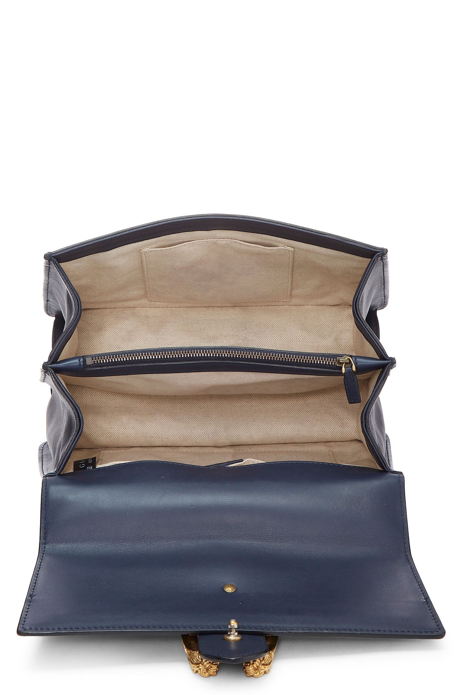 This Gucci Dionysus Top Handle bag is crafted in smooth navy leather, accented with green and red leather panels at the front, double-headed tiger embellishment, and a structured bamboo top handle.