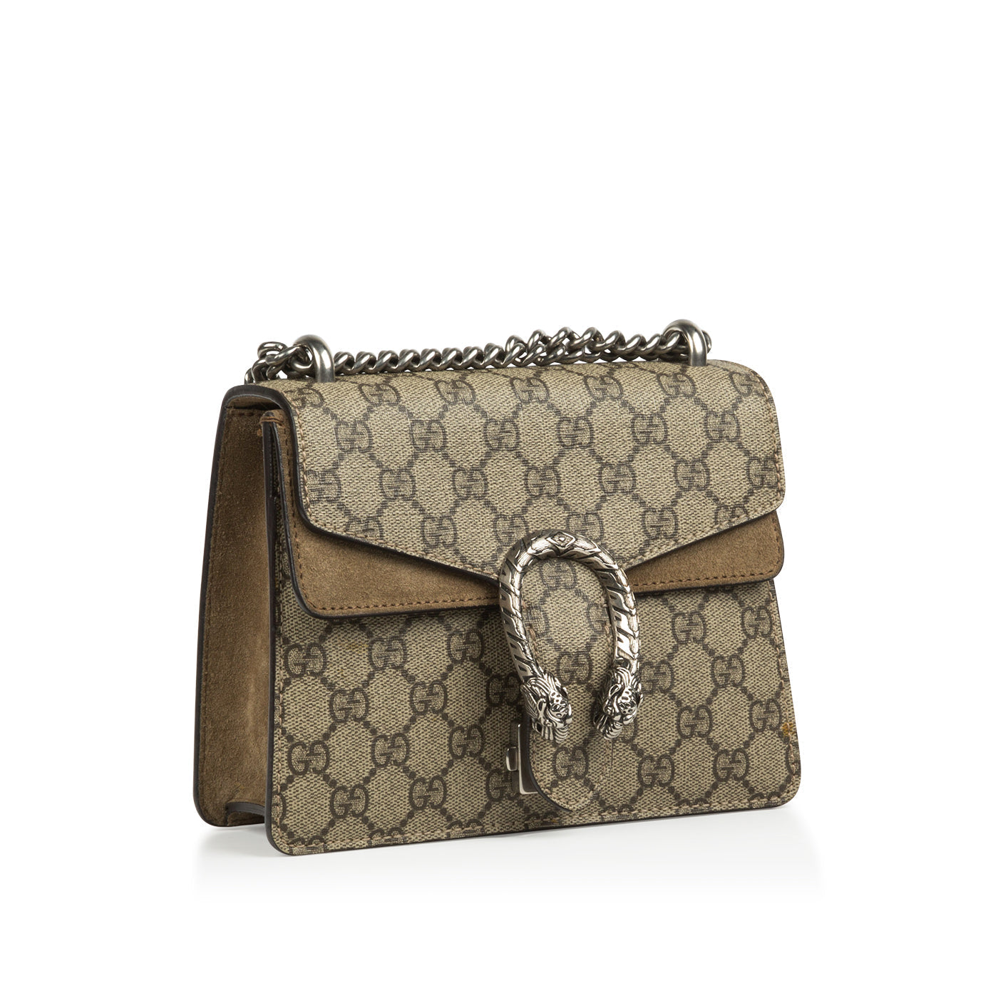 The beige Dionysus GG Supreme bag is perfect for all GG Supreme canvas lovers. The bag also features suede sides and an antique silver-toned sliding chain that can be worn multiple ways. This Dionysus is best suited with every outfit and although a small sized bag it has a maximum impact.