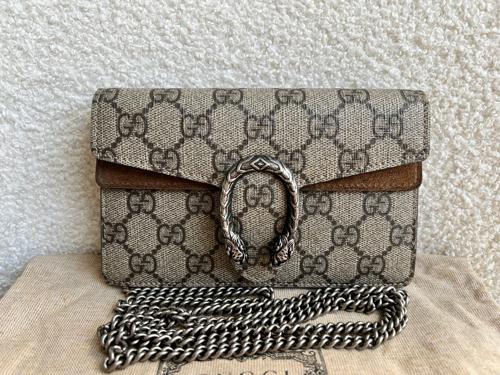 Gucci Super Mini Dionysus GG Shoulder Bag in Supreme Canvas. The super mini Dionysus shoulder bag is presented in the signature GG pattern, trimmed with taupe suede details. Featuring the tiger head closure, this mini style is perfect for those who only need to carry the essentials. Can be worn over shoulder or cross body for either day or evening wear. Chain can also be detached and used as a handheld clutch.