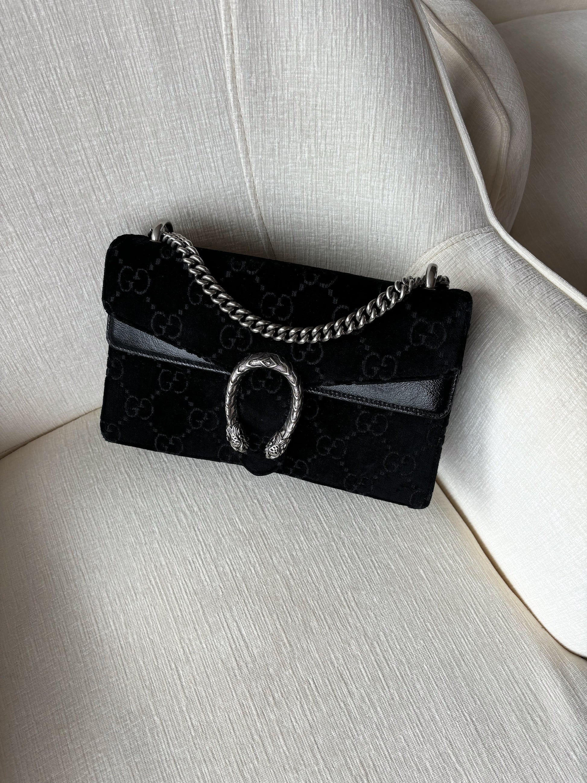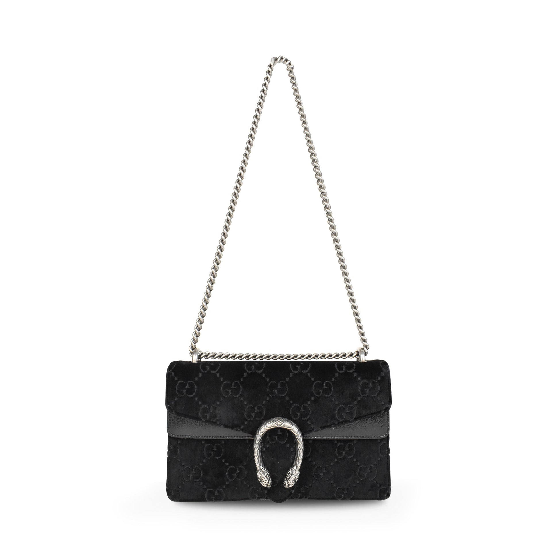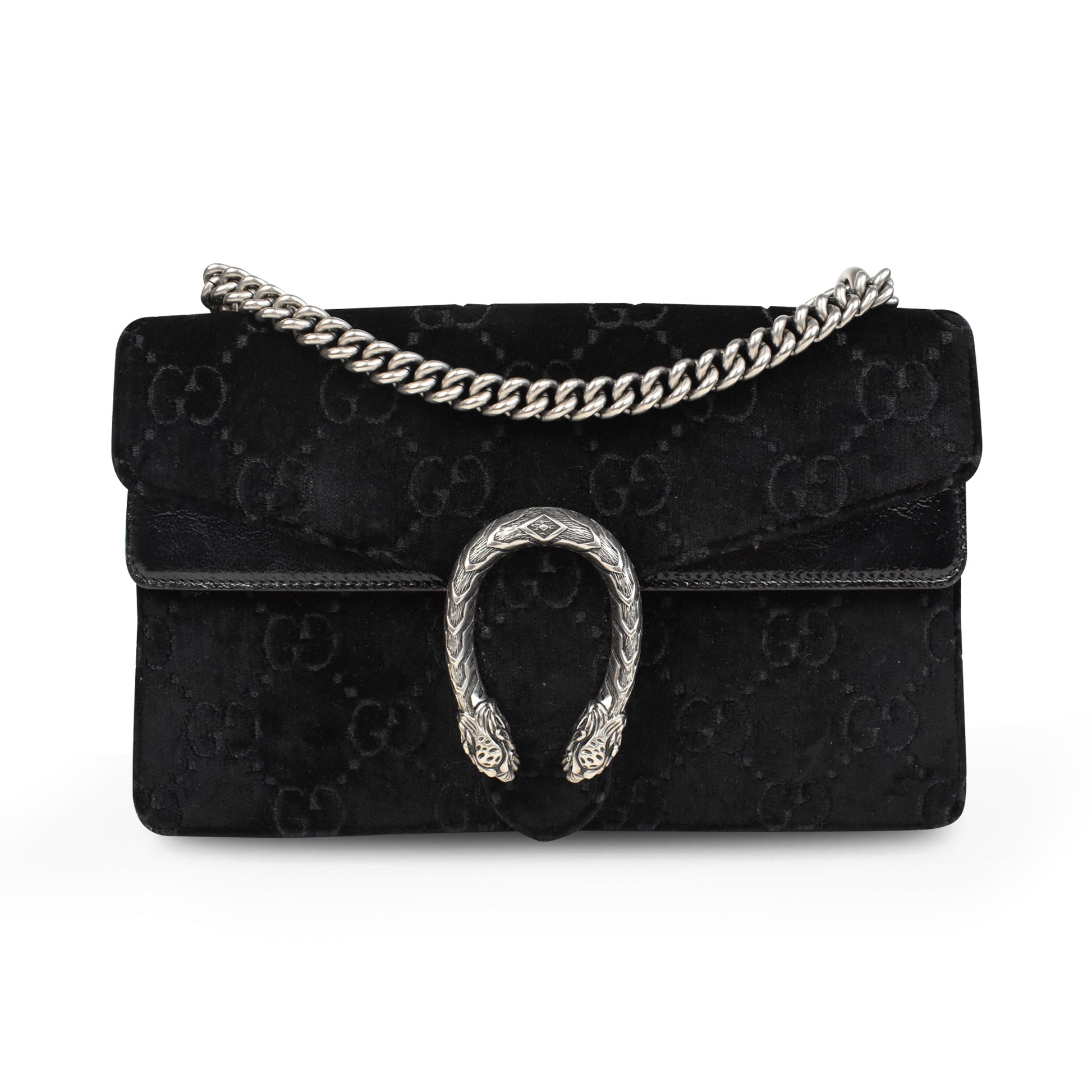 Gucci 'Dionysus' bag in black monogram embossed velour with black patent leather panels and a chain strap in gunmetal hardware. Features a top flap opening with a Dionysus horseshoe clasp that opens to reveal a suede lining with an inner zip pocket.