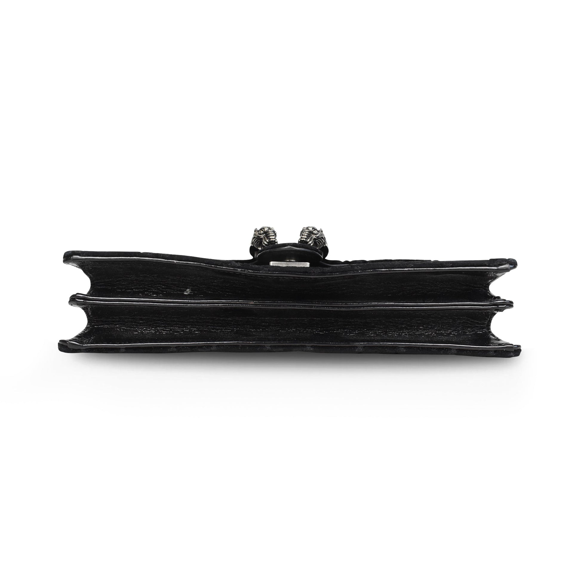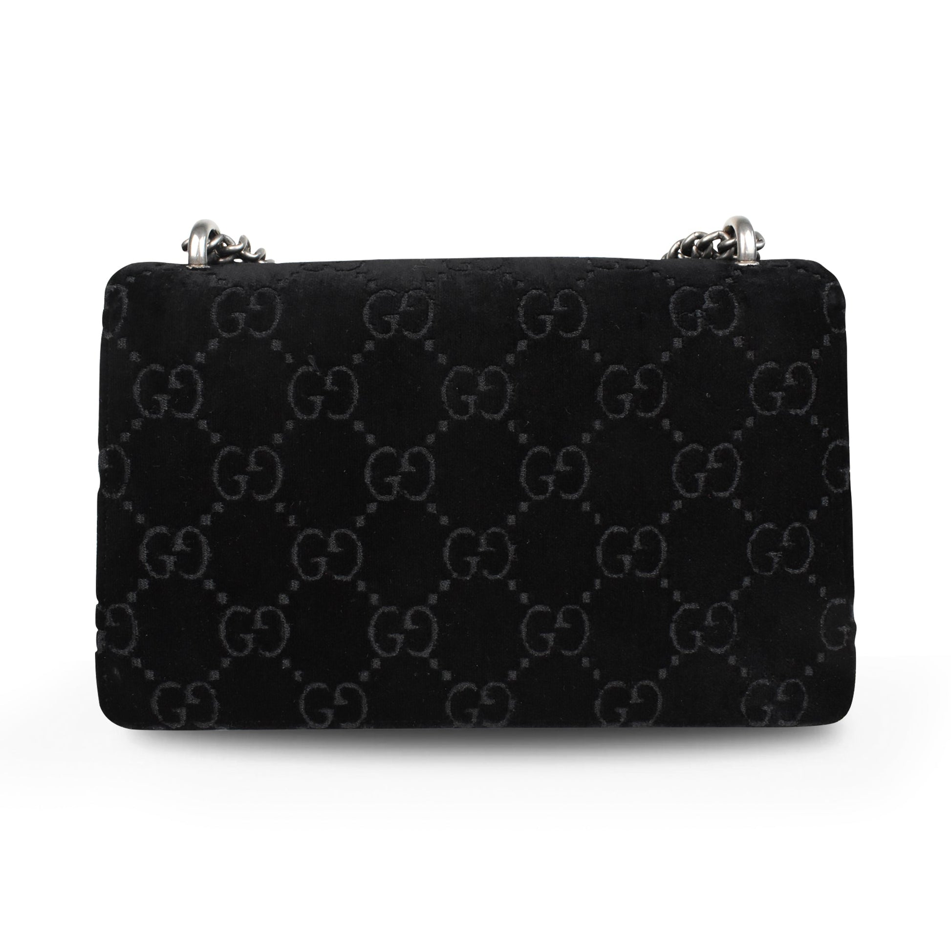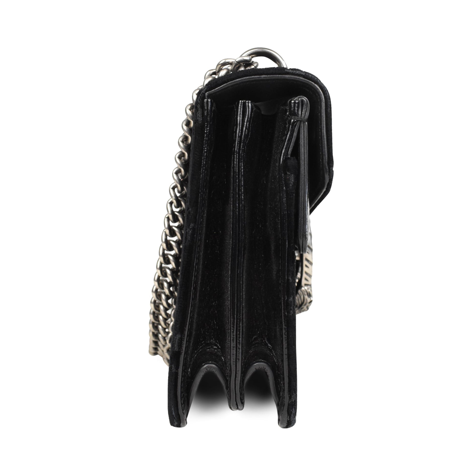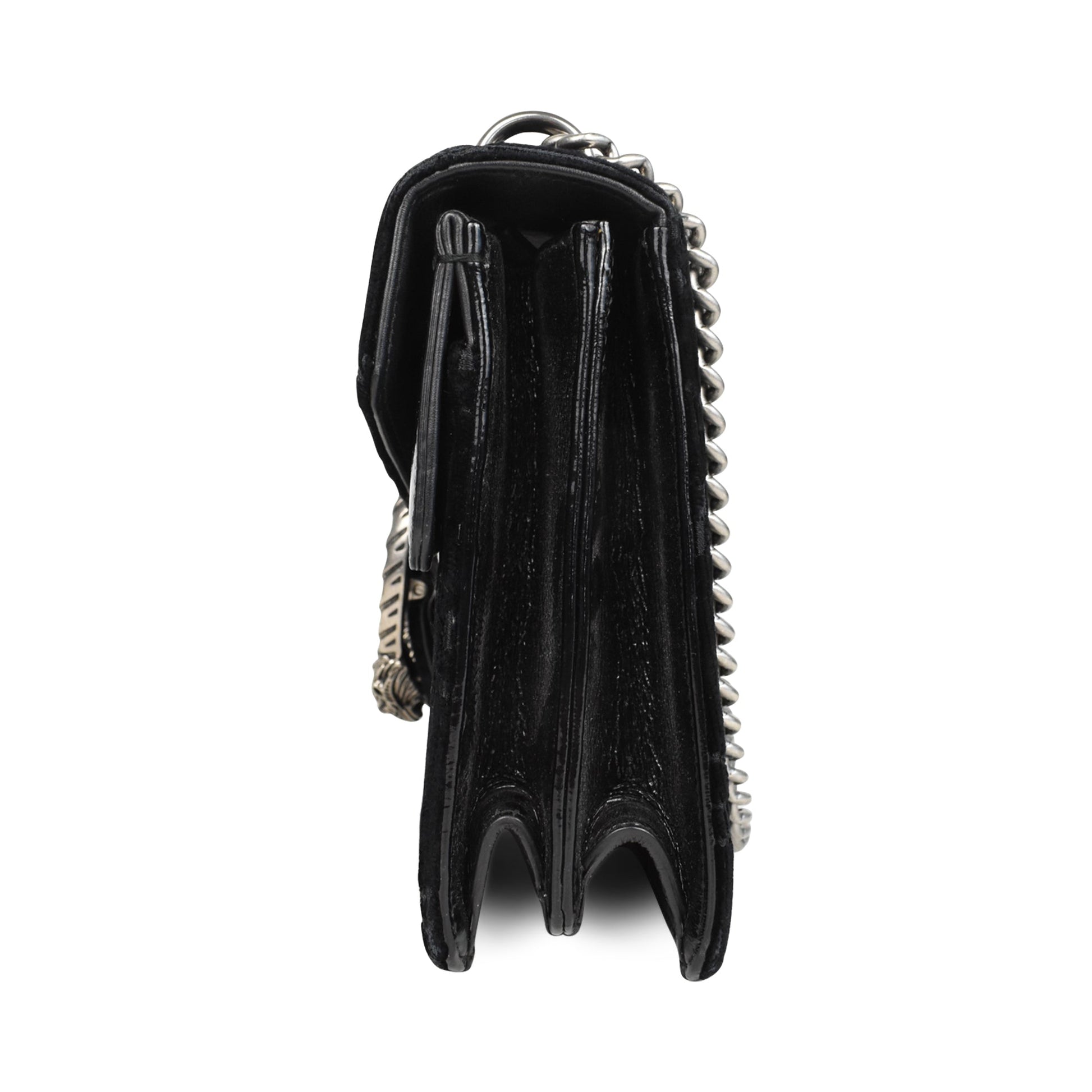 Gucci 'Dionysus' bag in black monogram embossed velour with black patent leather panels and a chain strap in gunmetal hardware. Features a top flap opening with a Dionysus horseshoe clasp that opens to reveal a suede lining with an inner zip pocket.