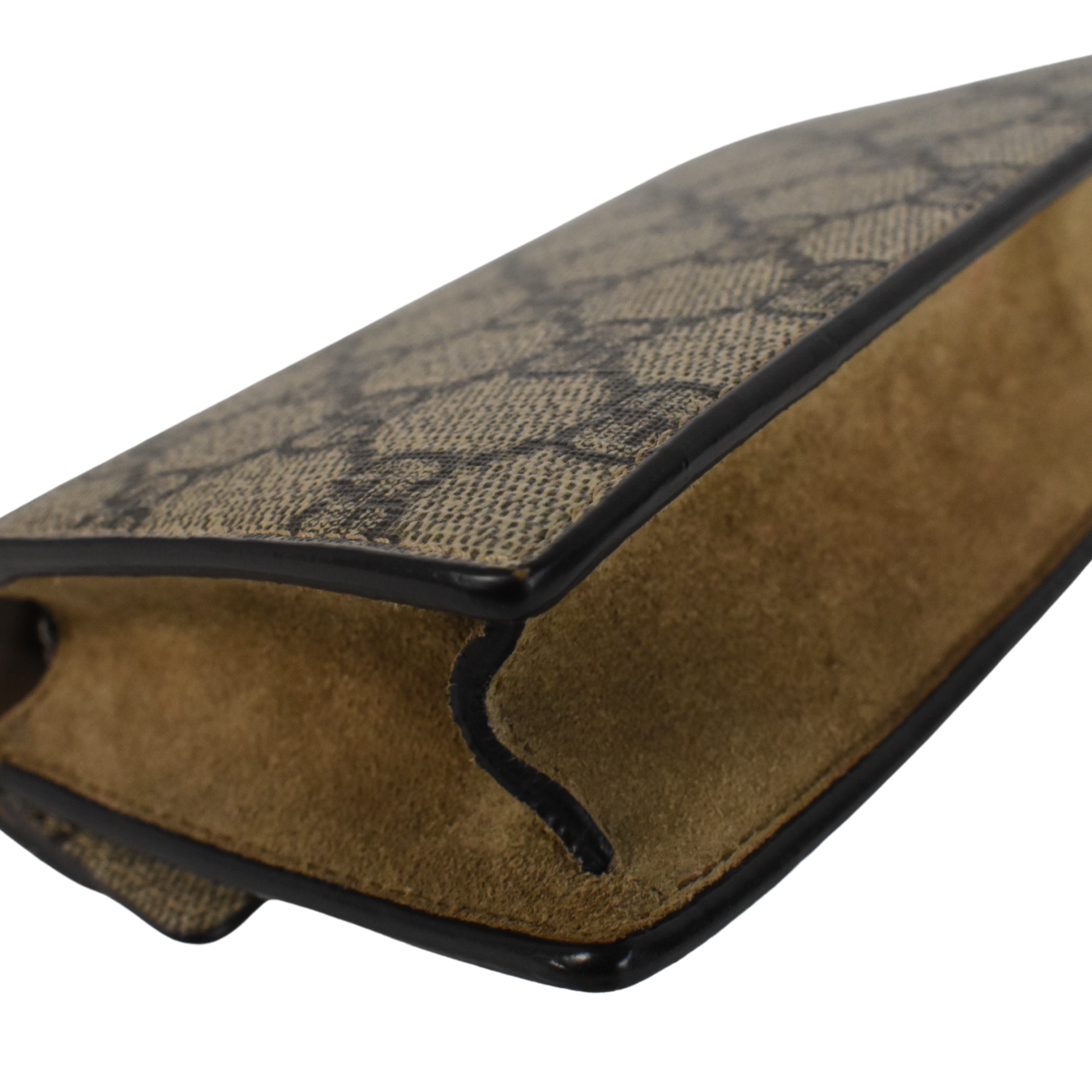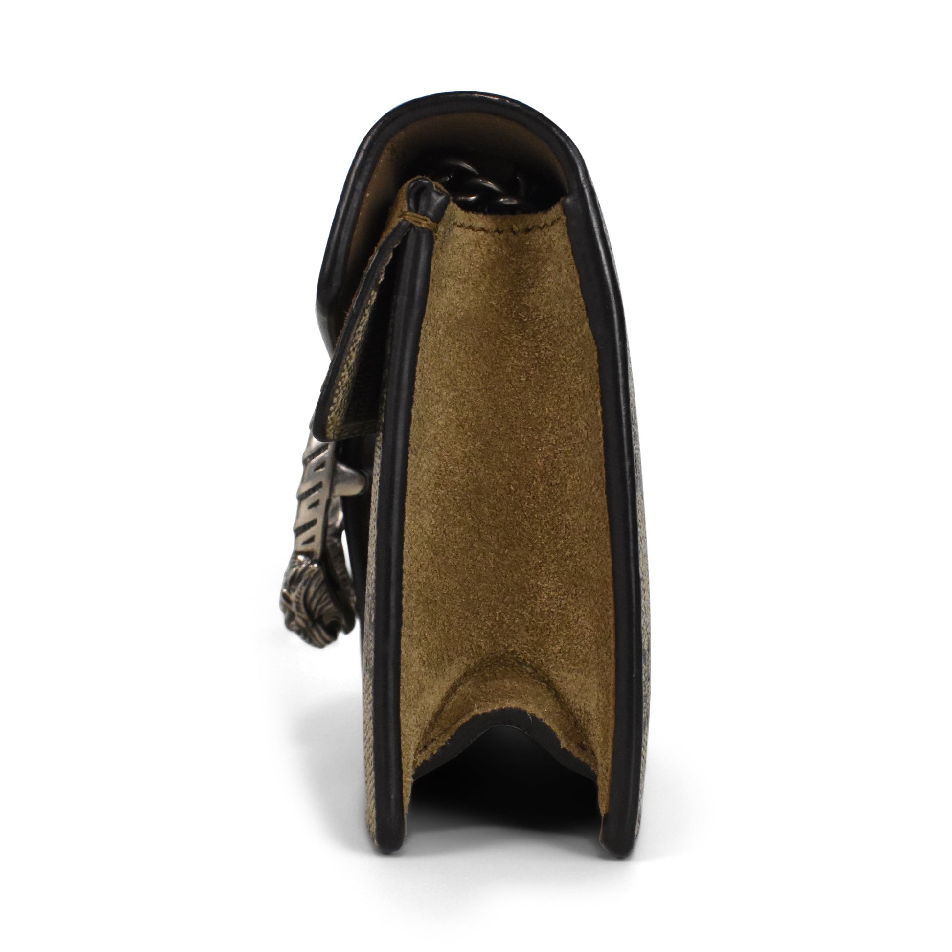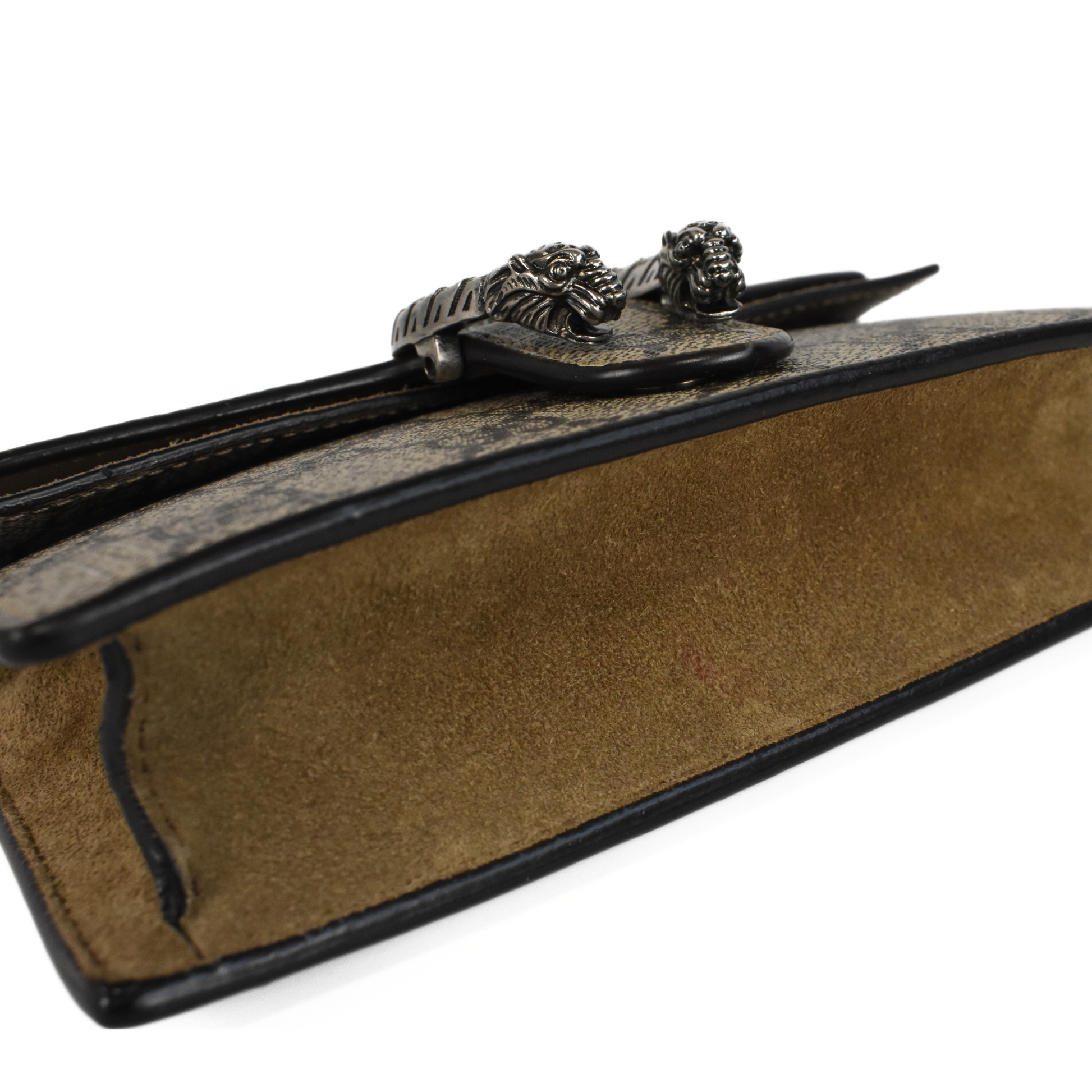 Gucci 'Dionysus Super Mini' flap bag in monogram coated canvas with brown suede accents and aged silver hardware. Features a dragon head horseshoe buckle on the front and a push-lock closure.