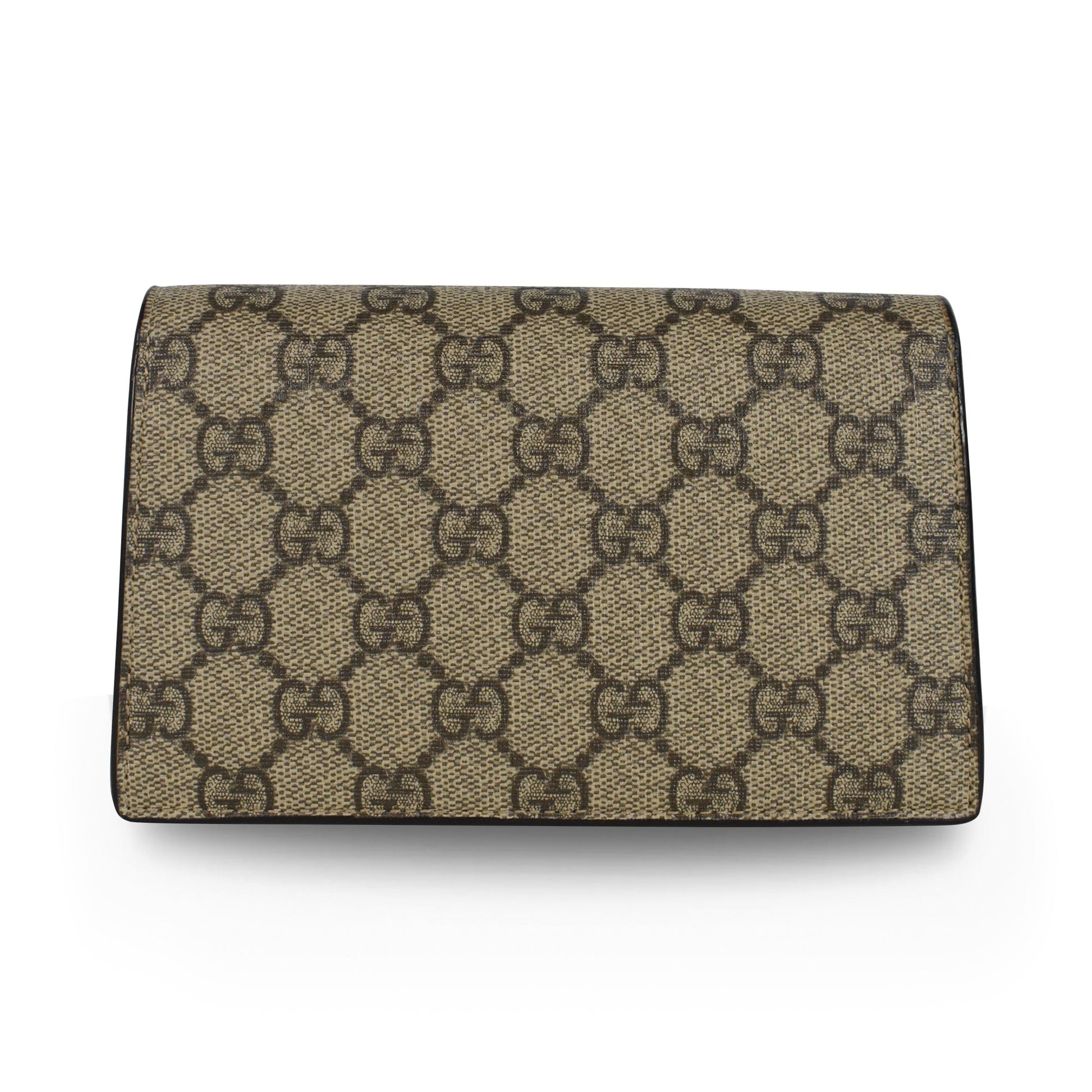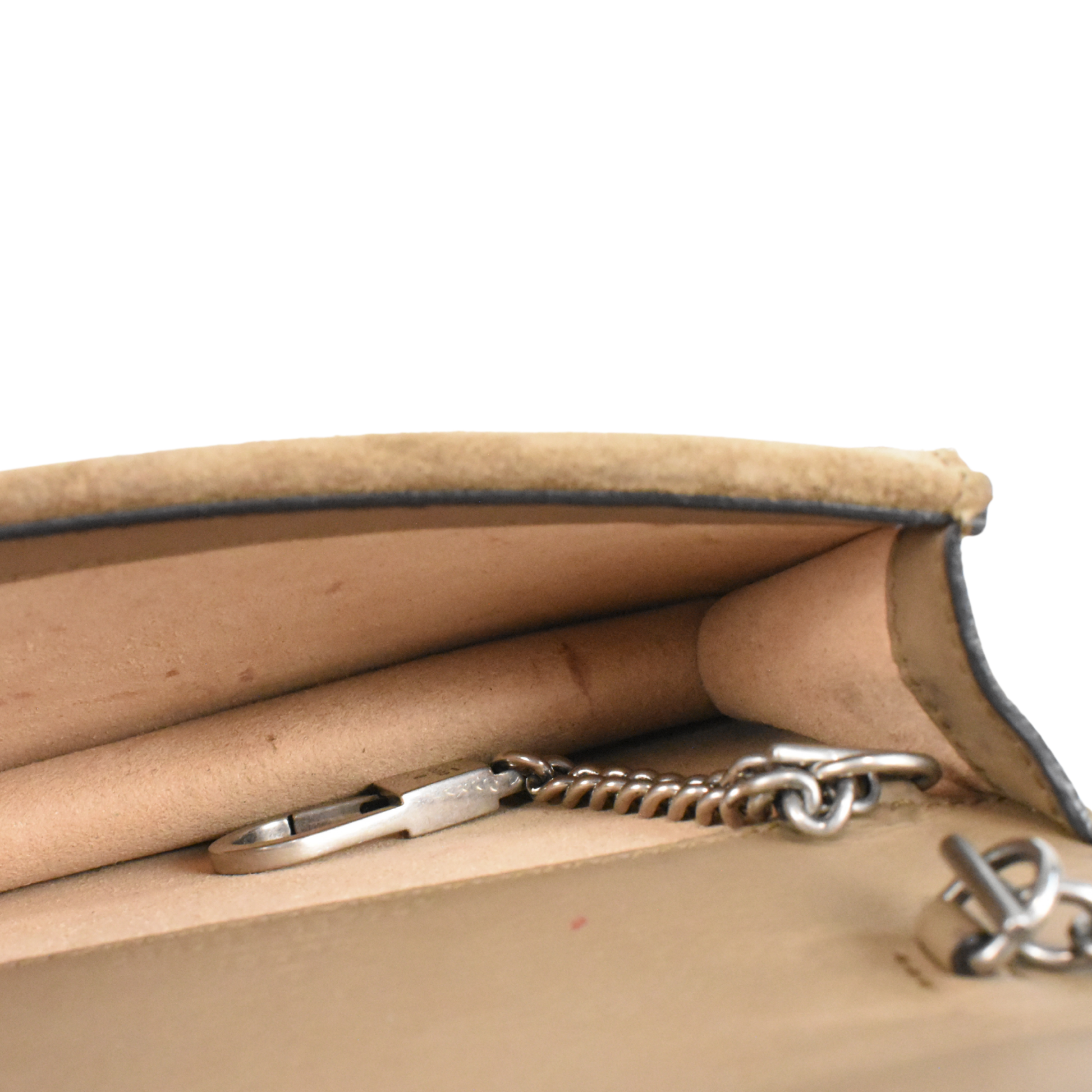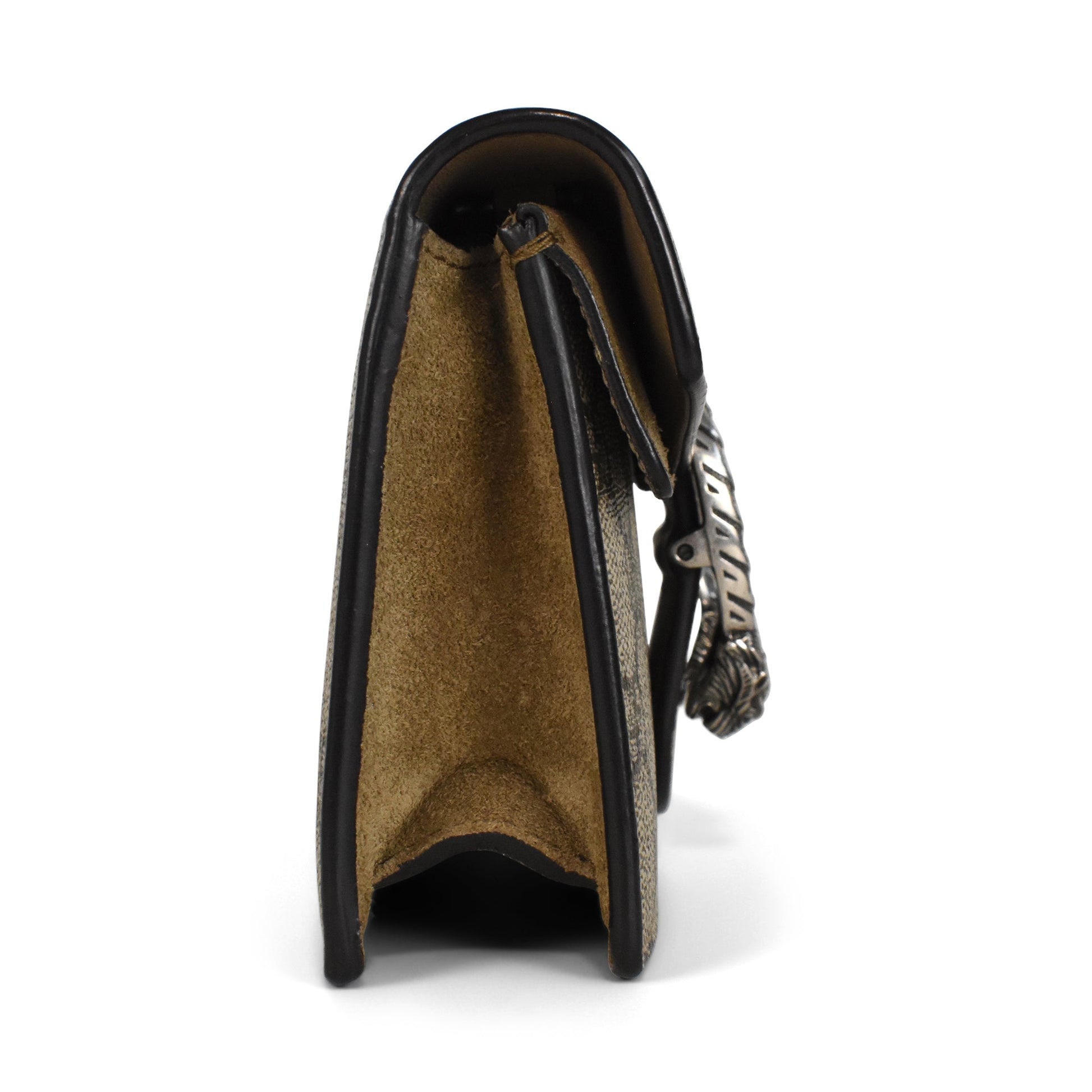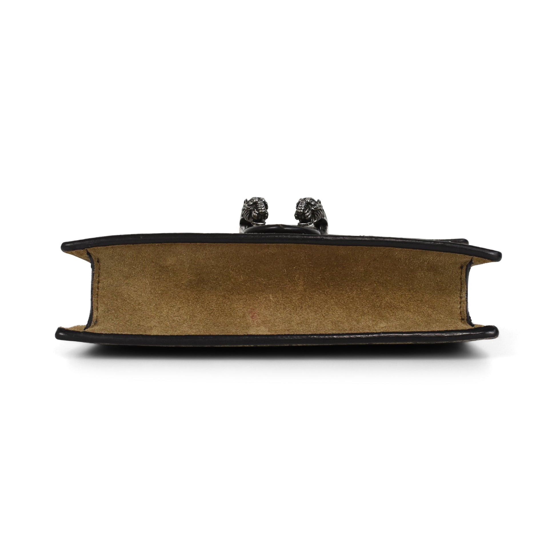 Gucci 'Dionysus Super Mini' flap bag in monogram coated canvas with brown suede accents and aged silver hardware. Features a dragon head horseshoe buckle on the front and a push-lock closure.
