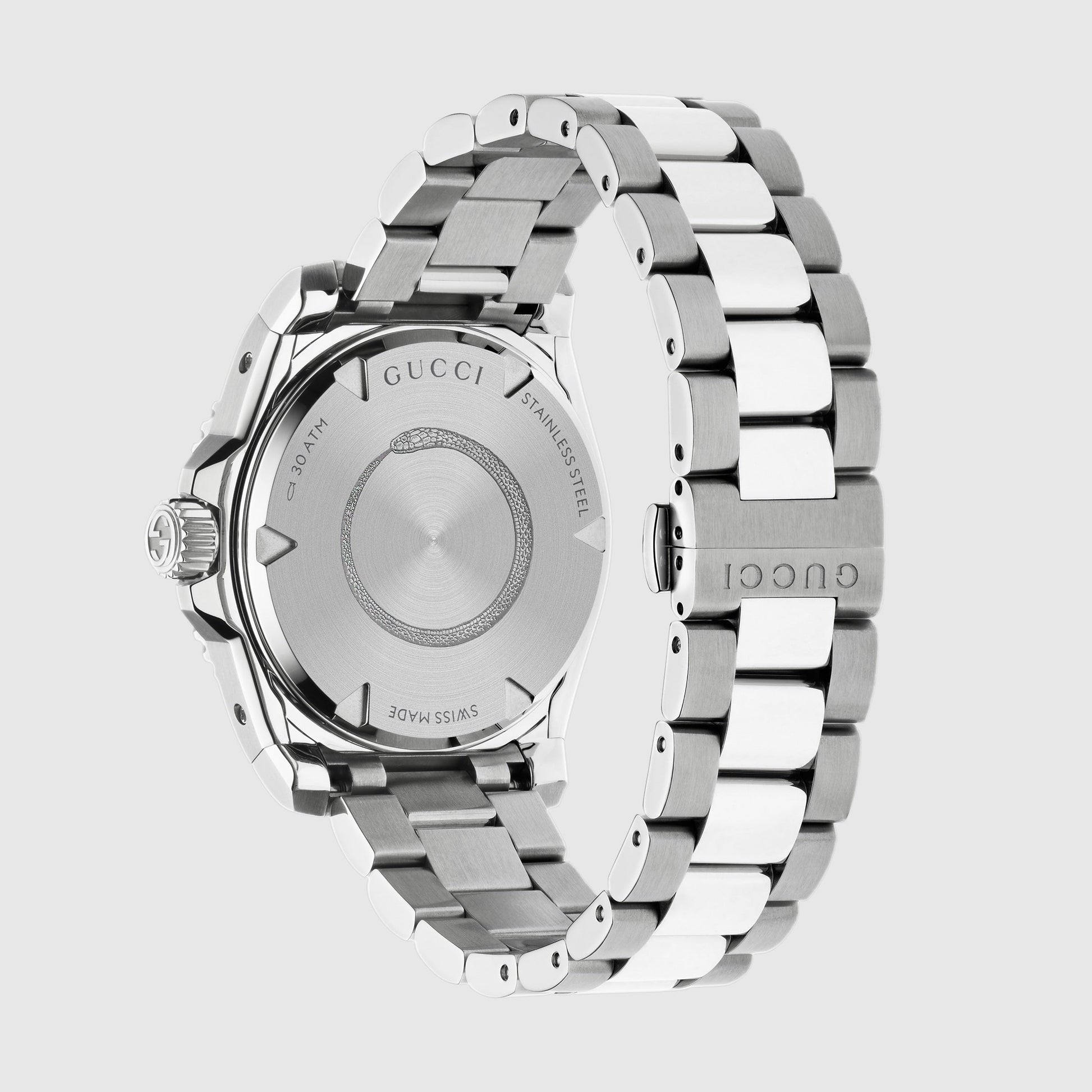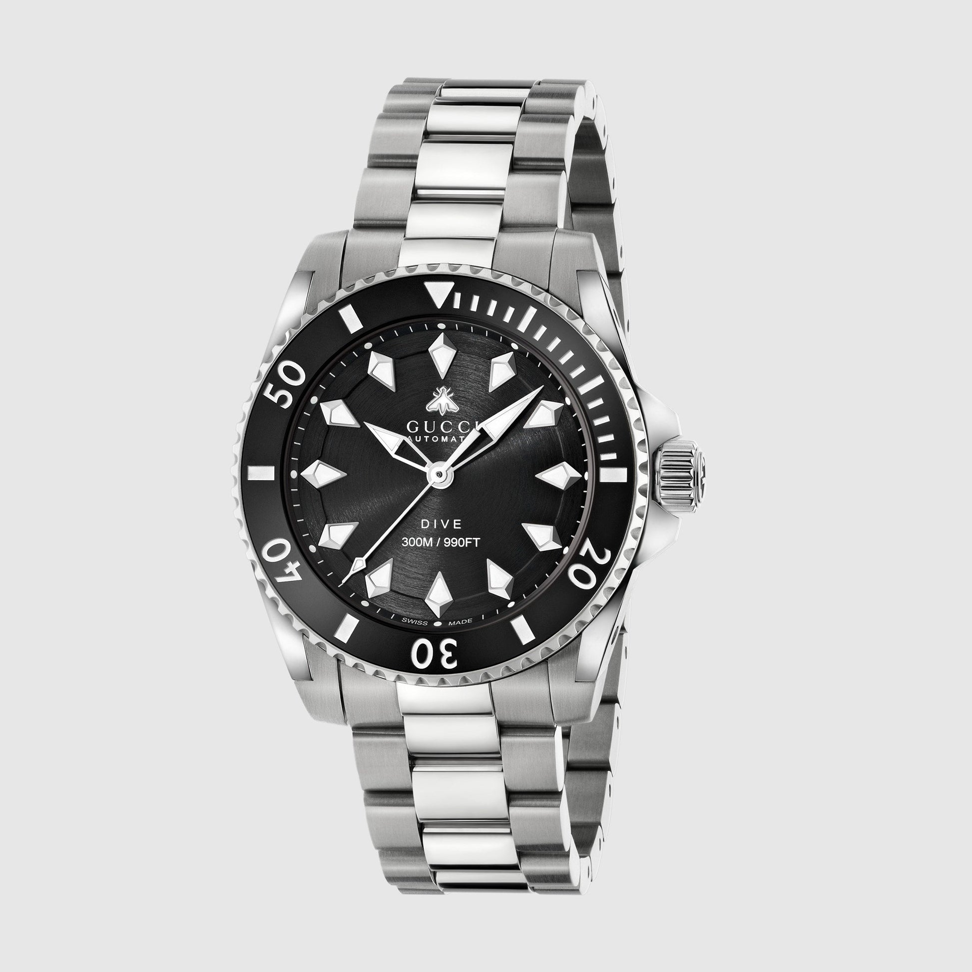 Marked by its diver's watch inspired design, here the Gucci Dive appears with a black dial with bee and a steel bracelet. Taking inspiration from the archives, the latest collection reimagine emblematic codes with a contemporary spirit.